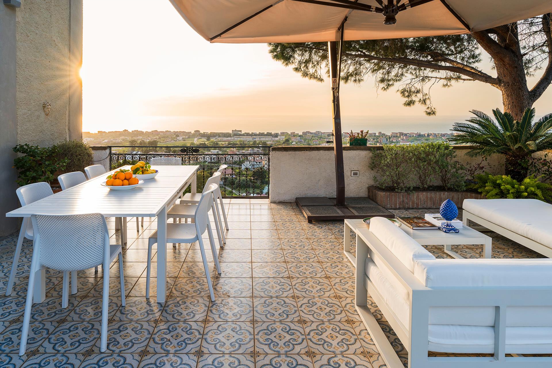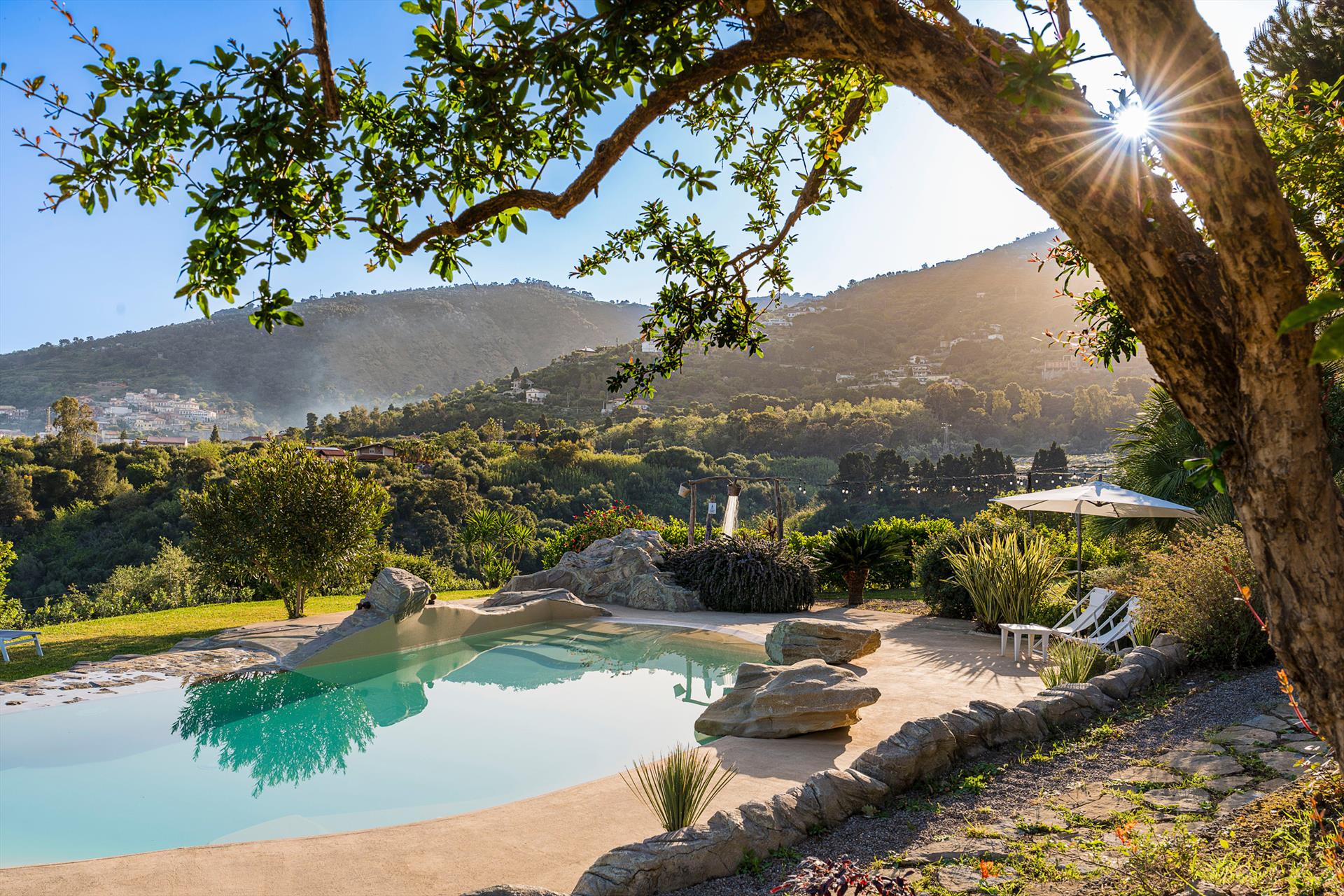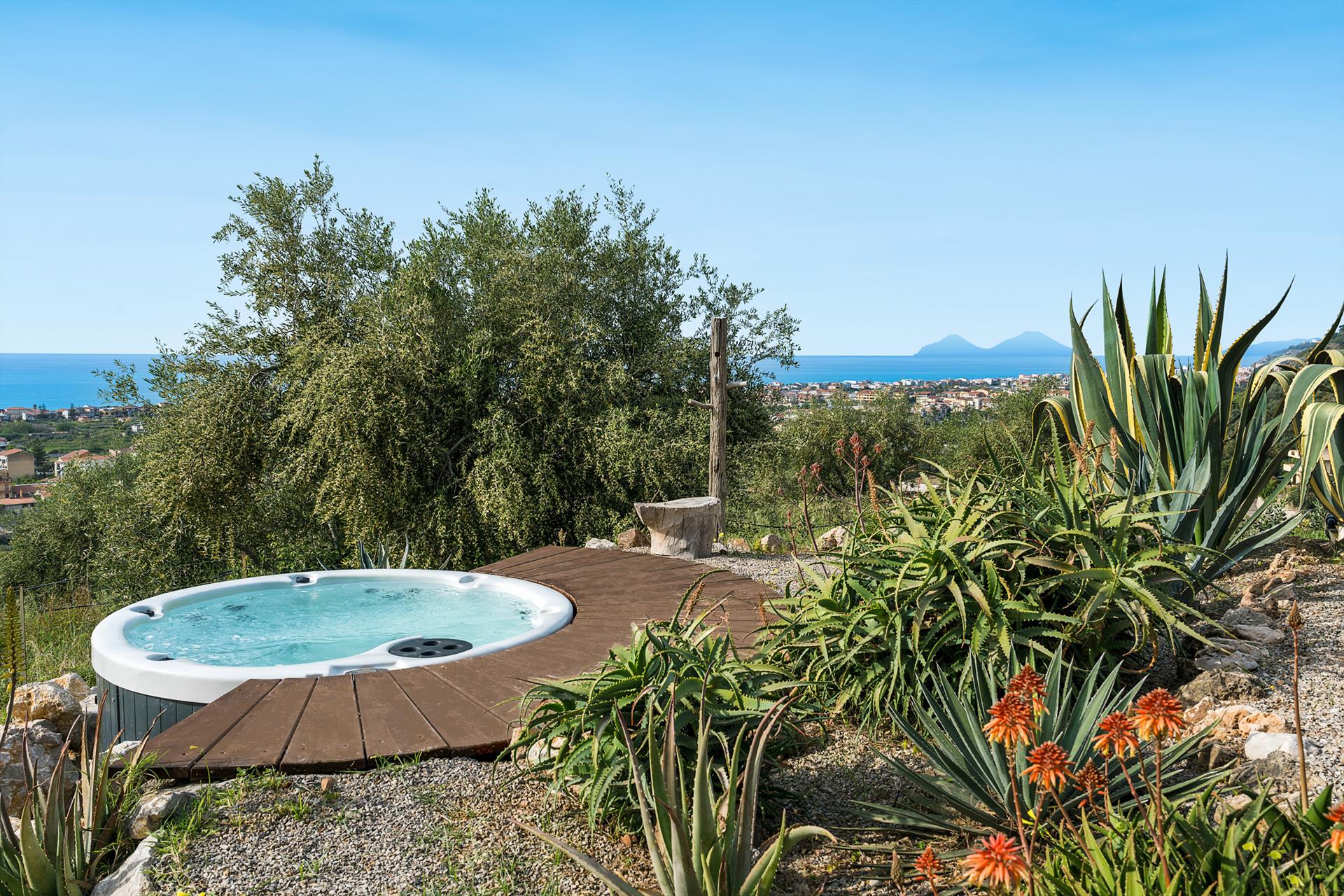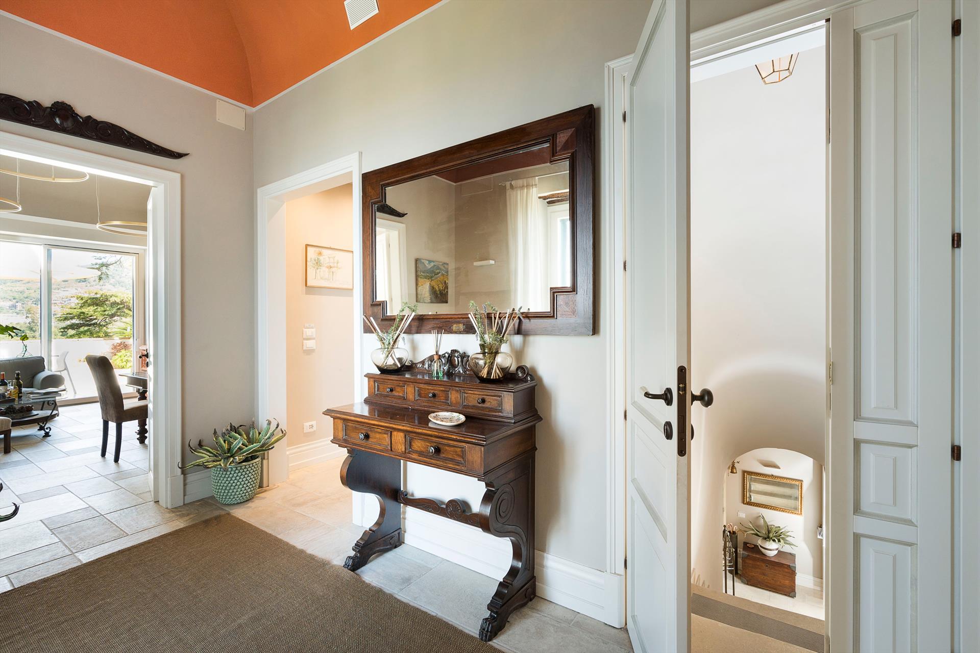 La propriété s'étend sur un vaste domaine, incluant un magnifique parc arboré de spécimens centenaires. La villa est agrémentée d'une superbe piscine avec solarium, d'un bain à remous et de vastes terrasses offrant une vue imprenable sur la campagne. De là, le regard s'étend sur toute la côte tyrrhénienne jusqu'à la mer et les îles Éoliennes.