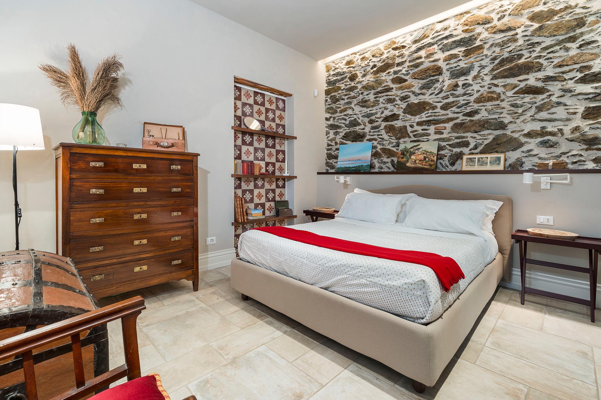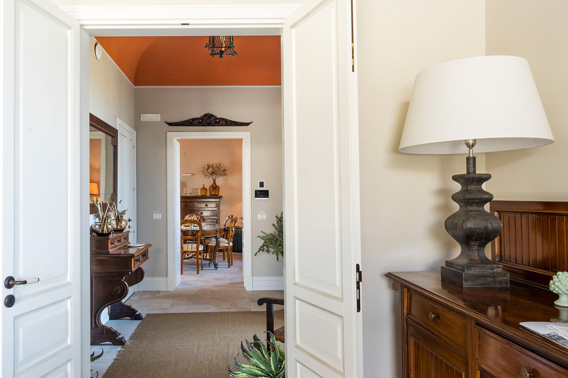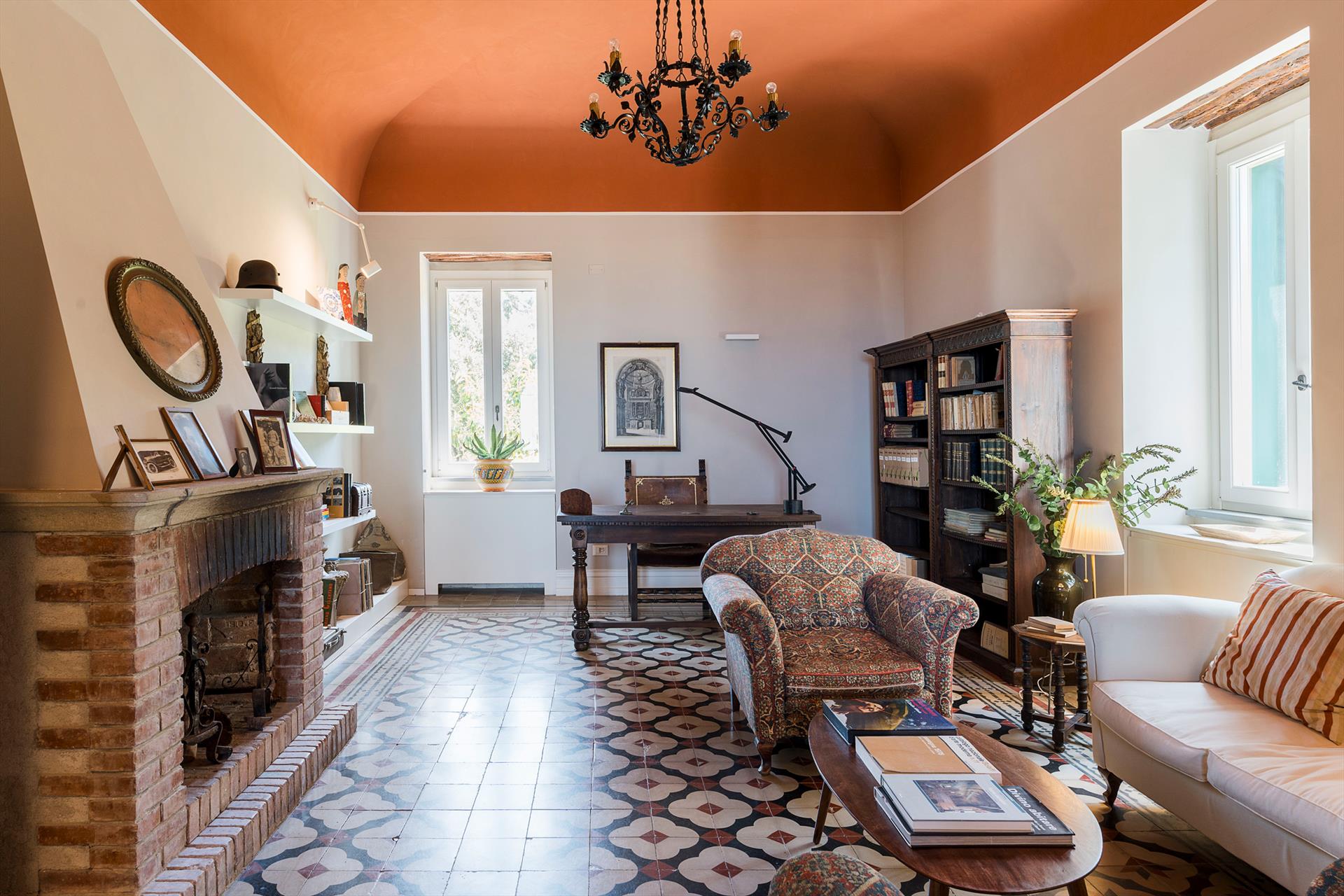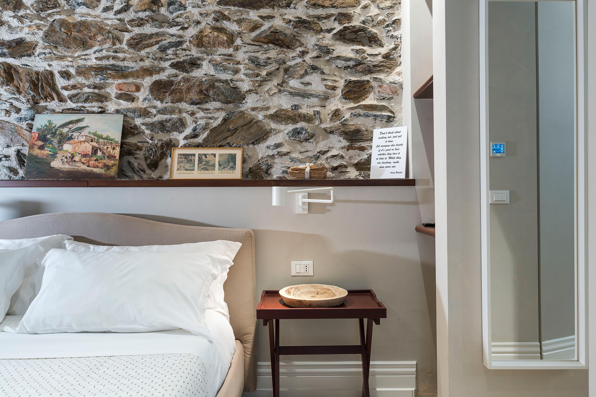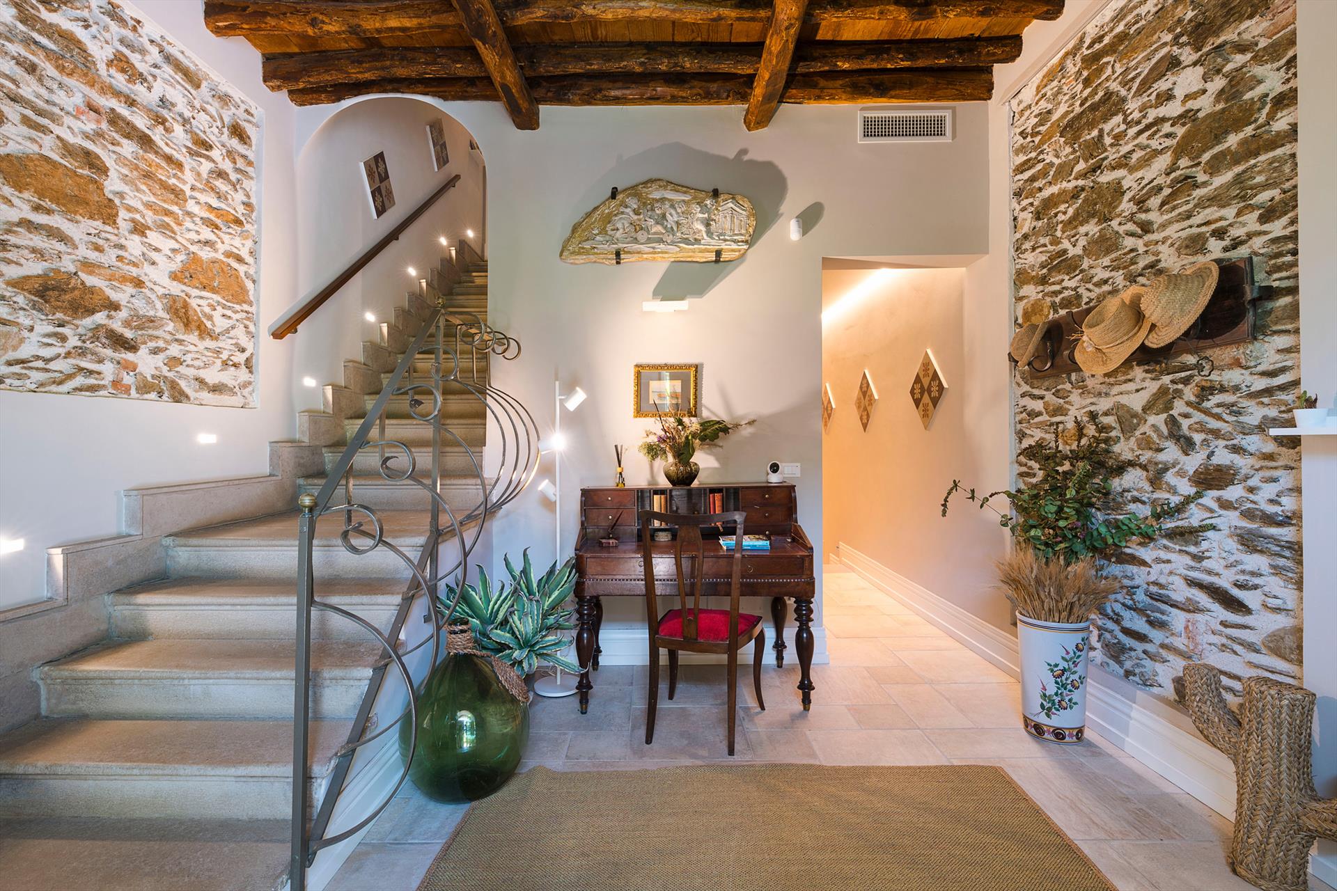 La récente rénovation, méticuleuse, a su préserver les caractéristiques architecturales originales, créant une parfaite harmonie entre le charme d'antan et la simplicité du design moderne. Les intérieurs, confortables et spacieux, sont répartis sur deux niveaux. Ils comptent cinq chambres doubles, chacune avec salle de bains privative, télévision et mini-réfrigérateur. La villa dispose également d'un salon, d'un bureau, d'une salle de petit-déjeuner, d'une salle à manger, de deux cuisines et d'une buanderie.