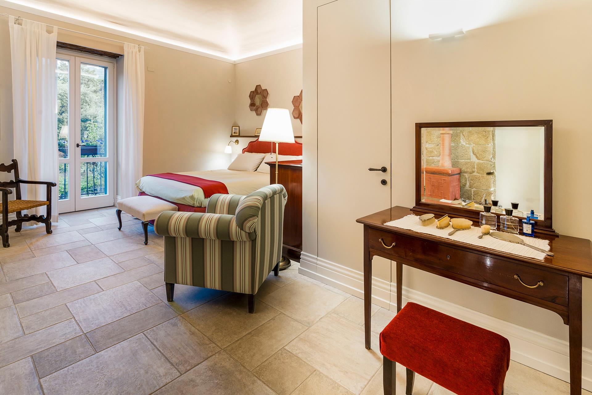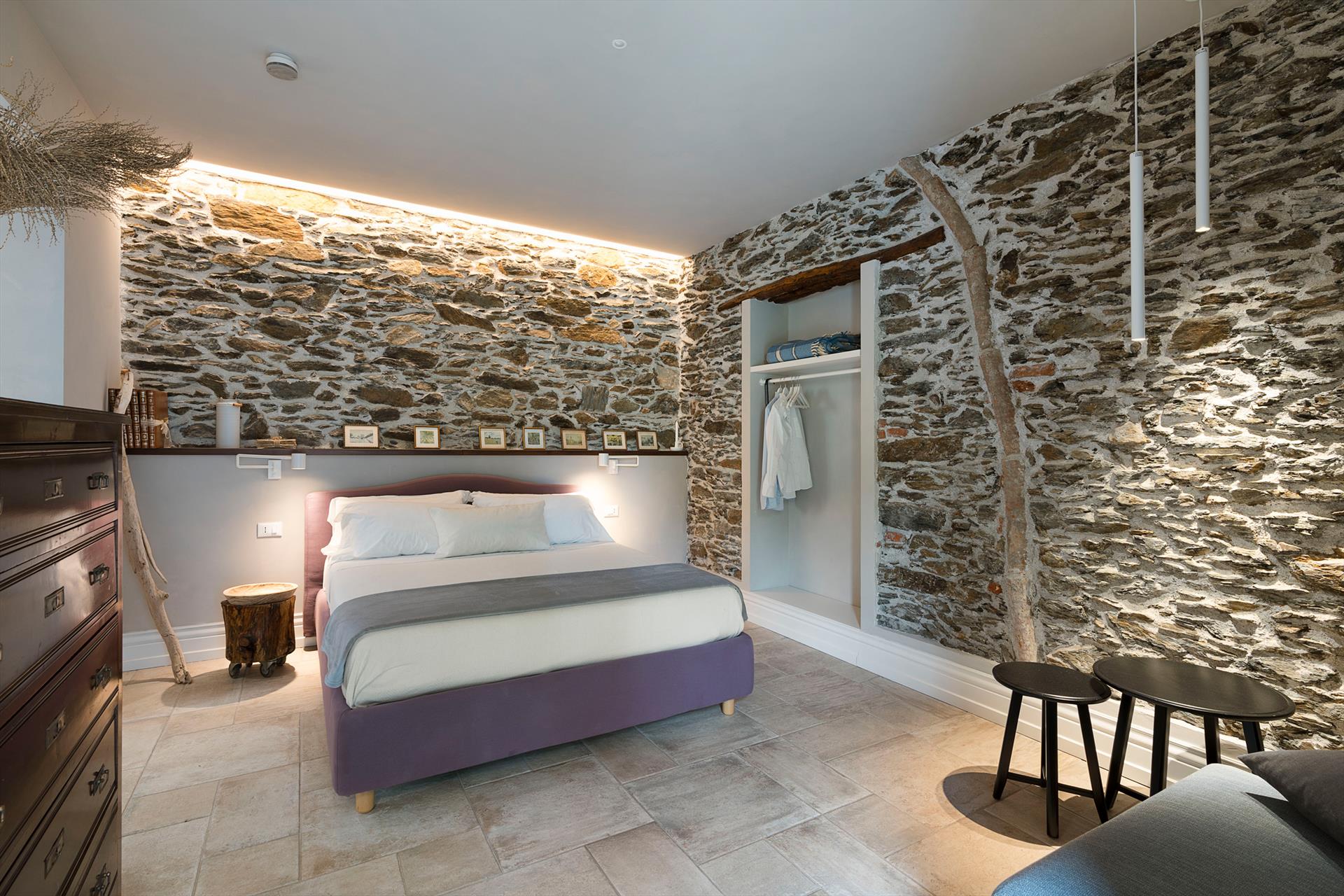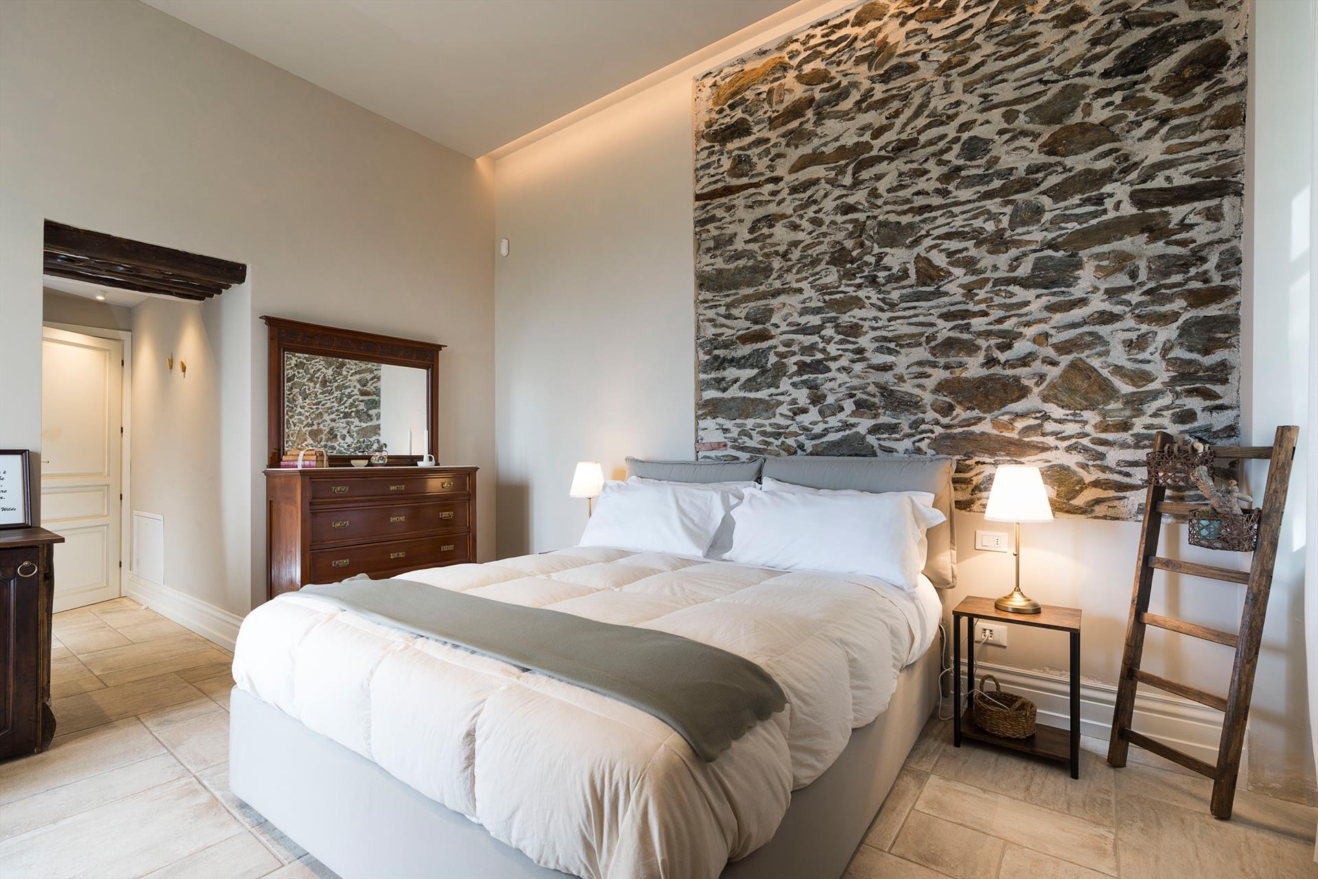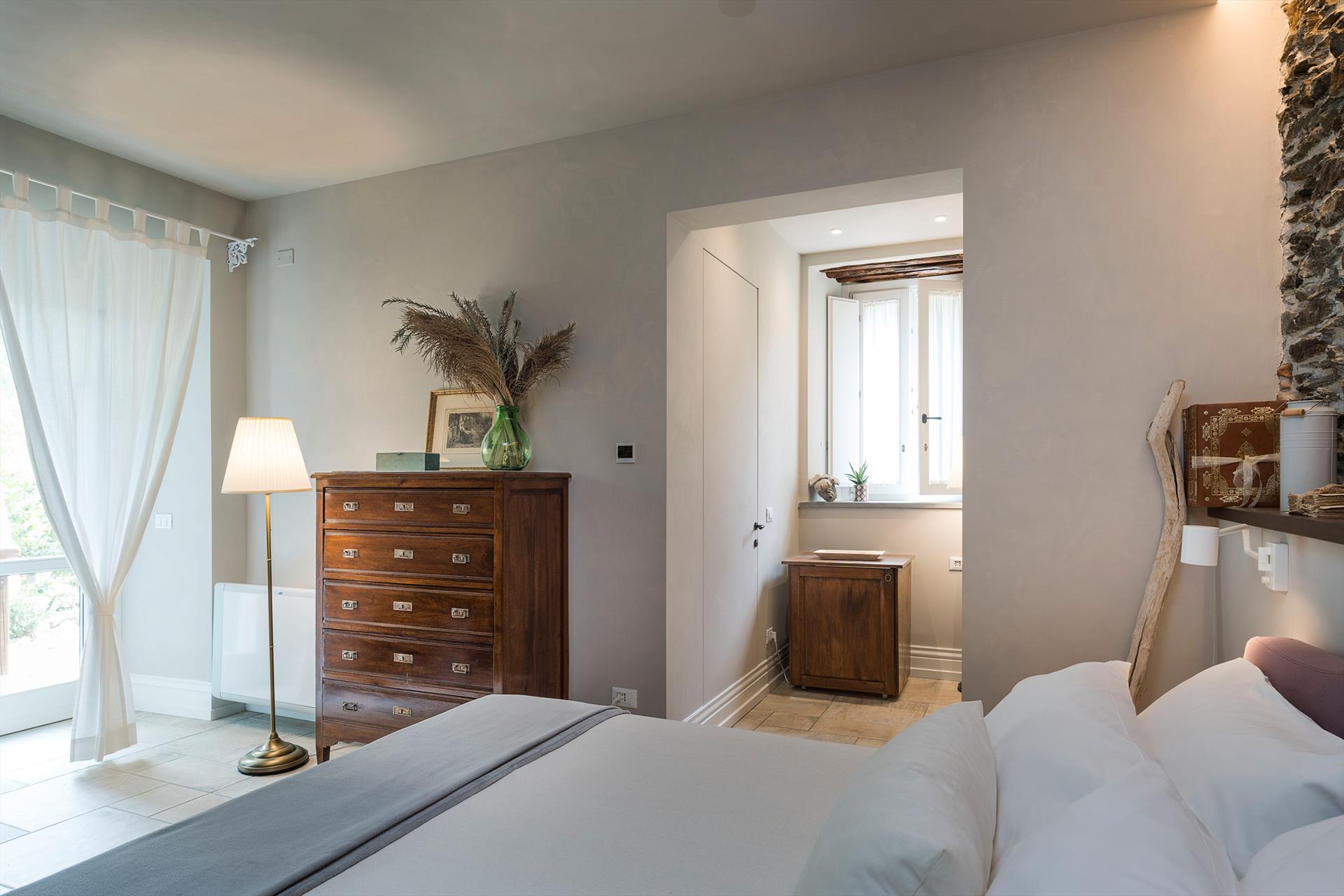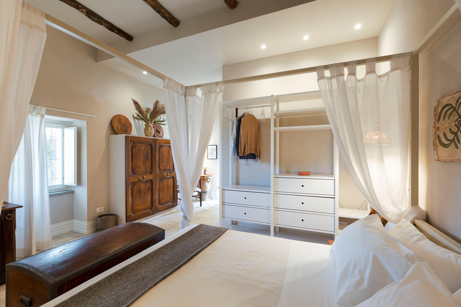 La récente rénovation, méticuleuse, a su préserver les caractéristiques architecturales originales, créant une parfaite harmonie entre le charme d'antan et la simplicité du design moderne. Les intérieurs, confortables et spacieux, sont répartis sur deux niveaux. Ils comptent cinq chambres doubles, chacune avec salle de bains privative, télévision et mini-réfrigérateur. La villa dispose également d'un salon, d'un bureau, d'une salle de petit-déjeuner, d'une salle à manger, de deux cuisines et d'une buanderie.