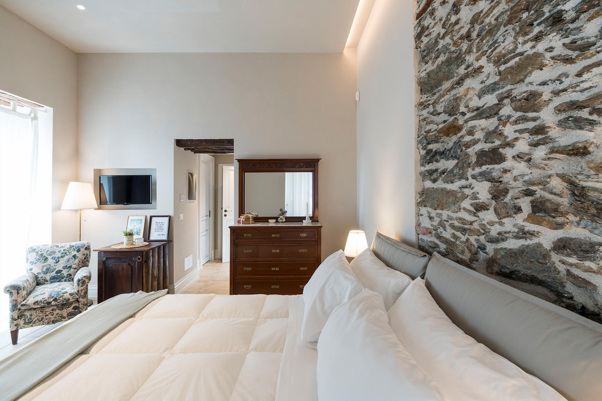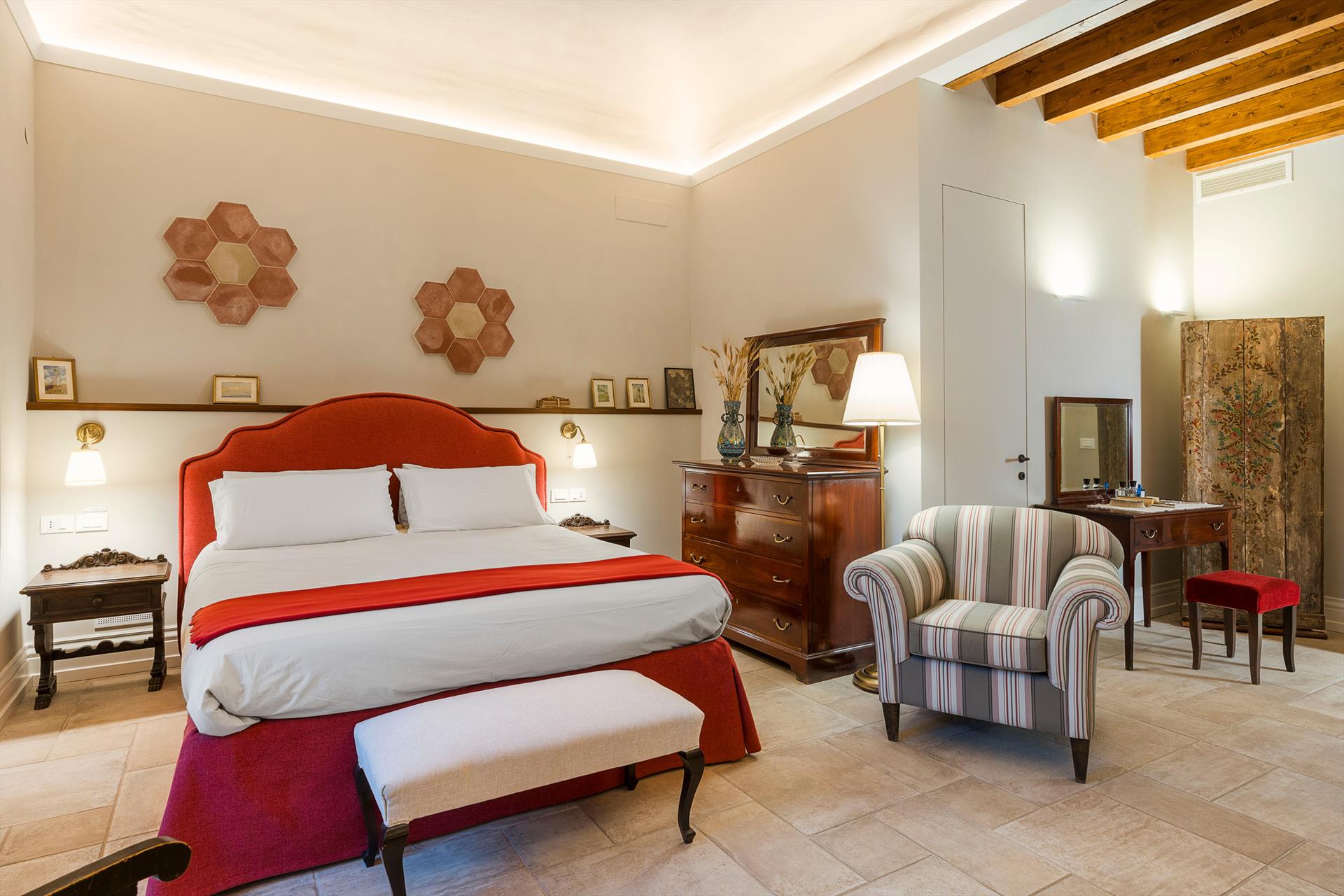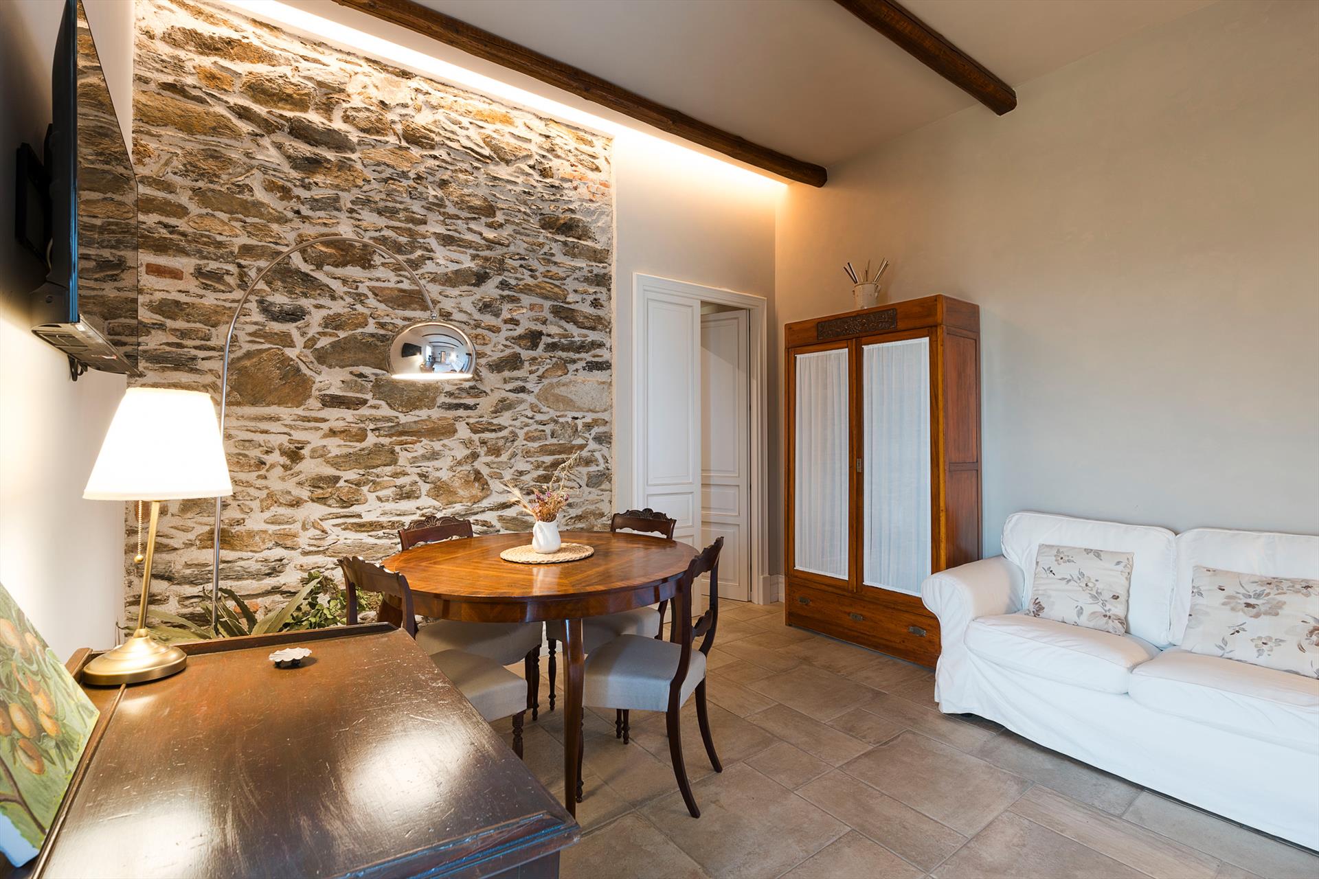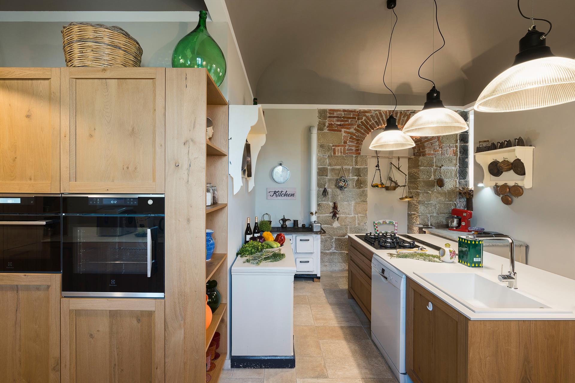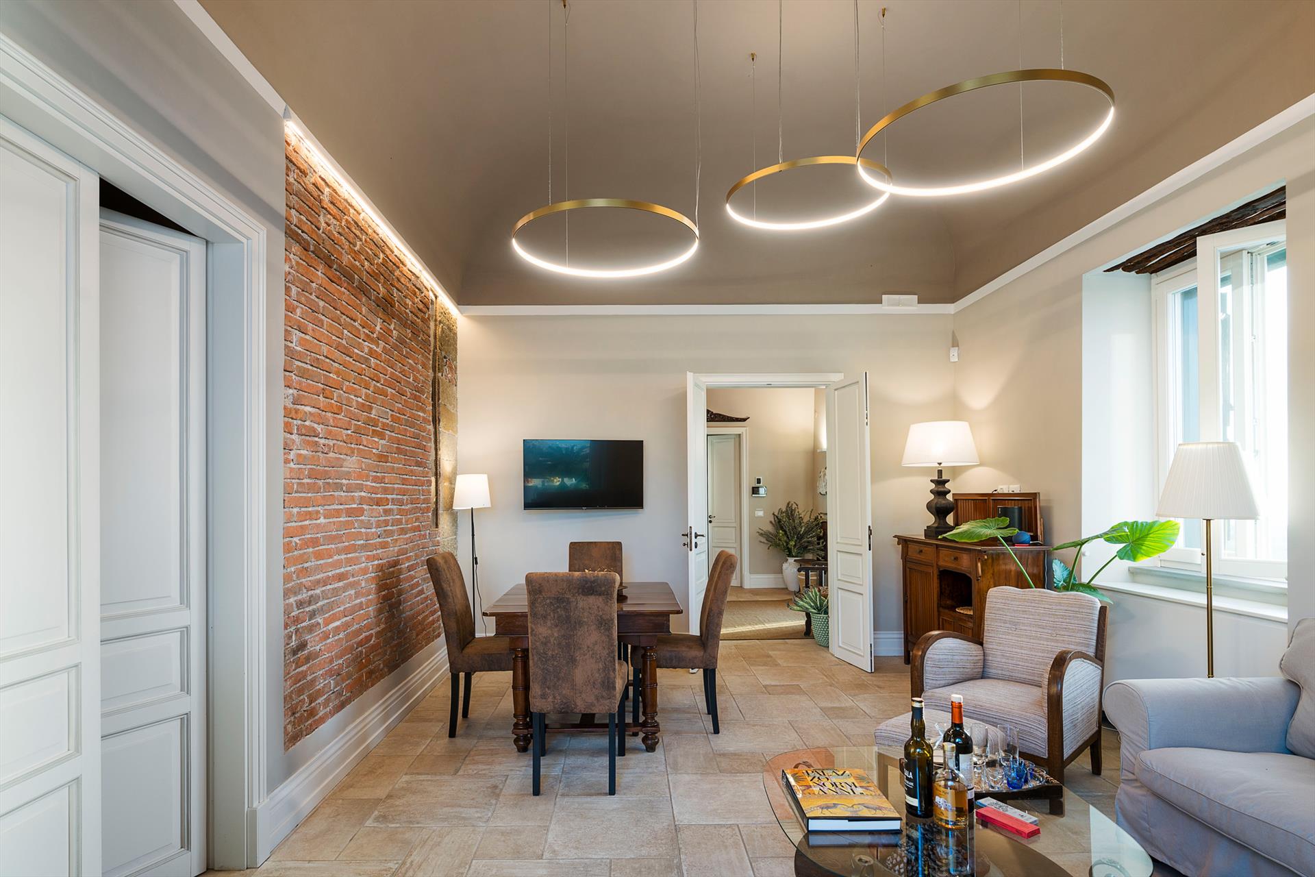 La récente rénovation, méticuleuse, a su préserver les caractéristiques architecturales originales, créant une parfaite harmonie entre le charme d'antan et la simplicité du design moderne. Les intérieurs, confortables et spacieux, sont répartis sur deux niveaux. Ils comptent cinq chambres doubles, chacune avec salle de bains privative, télévision et mini-réfrigérateur. La villa dispose également d'un salon, d'un bureau, d'une salle de petit-déjeuner, d'une salle à manger, de deux cuisines et d'une buanderie.