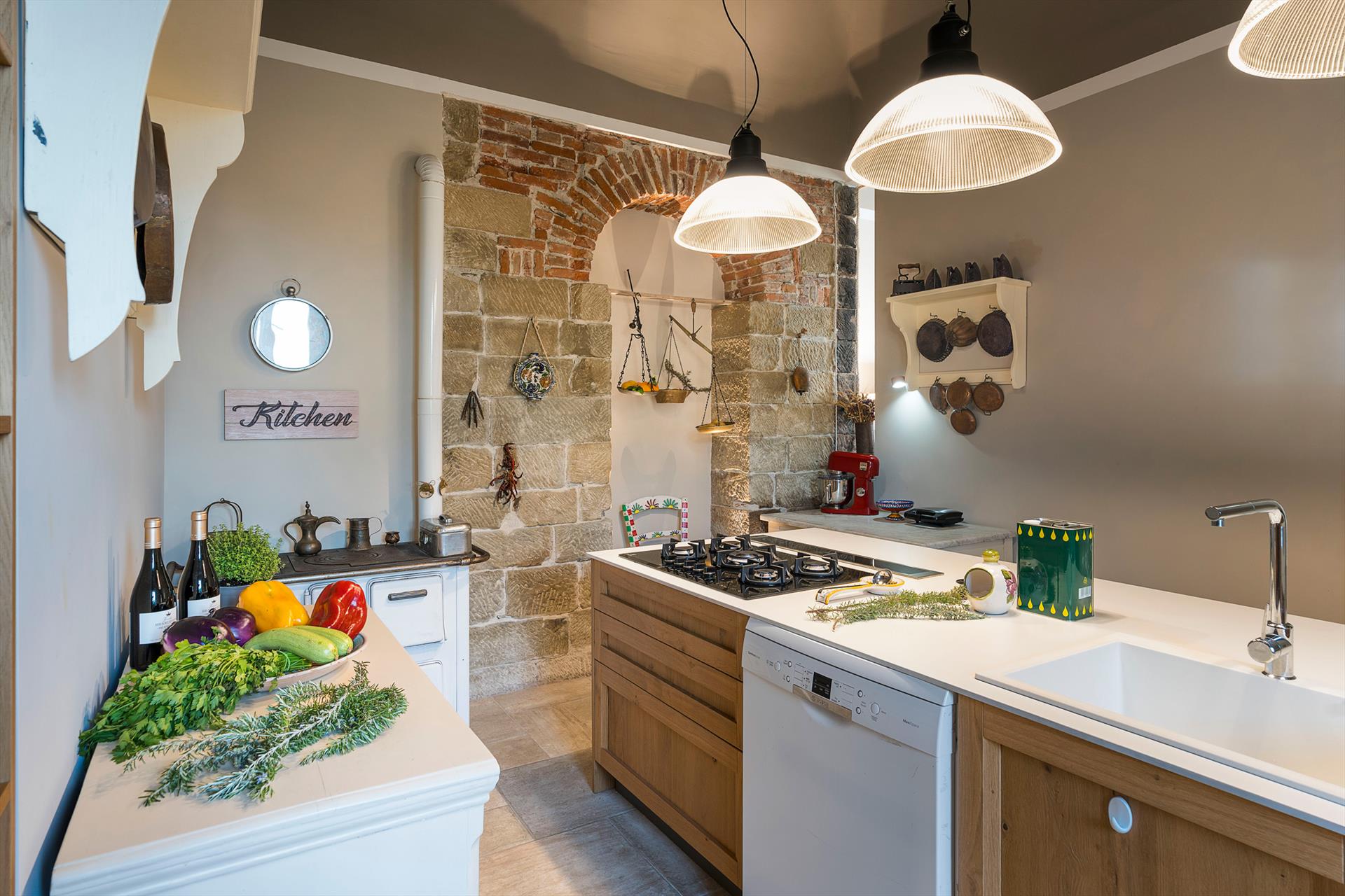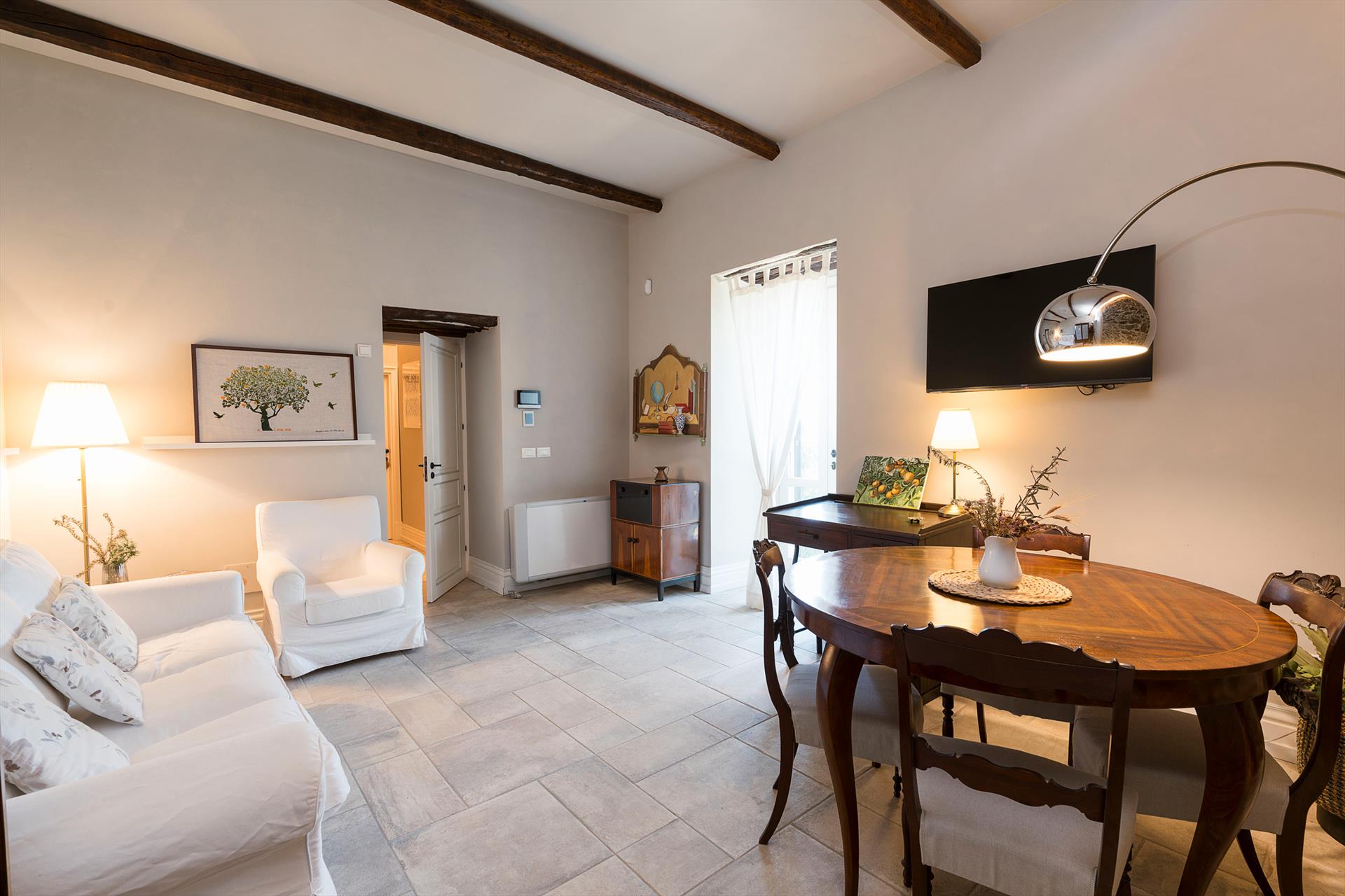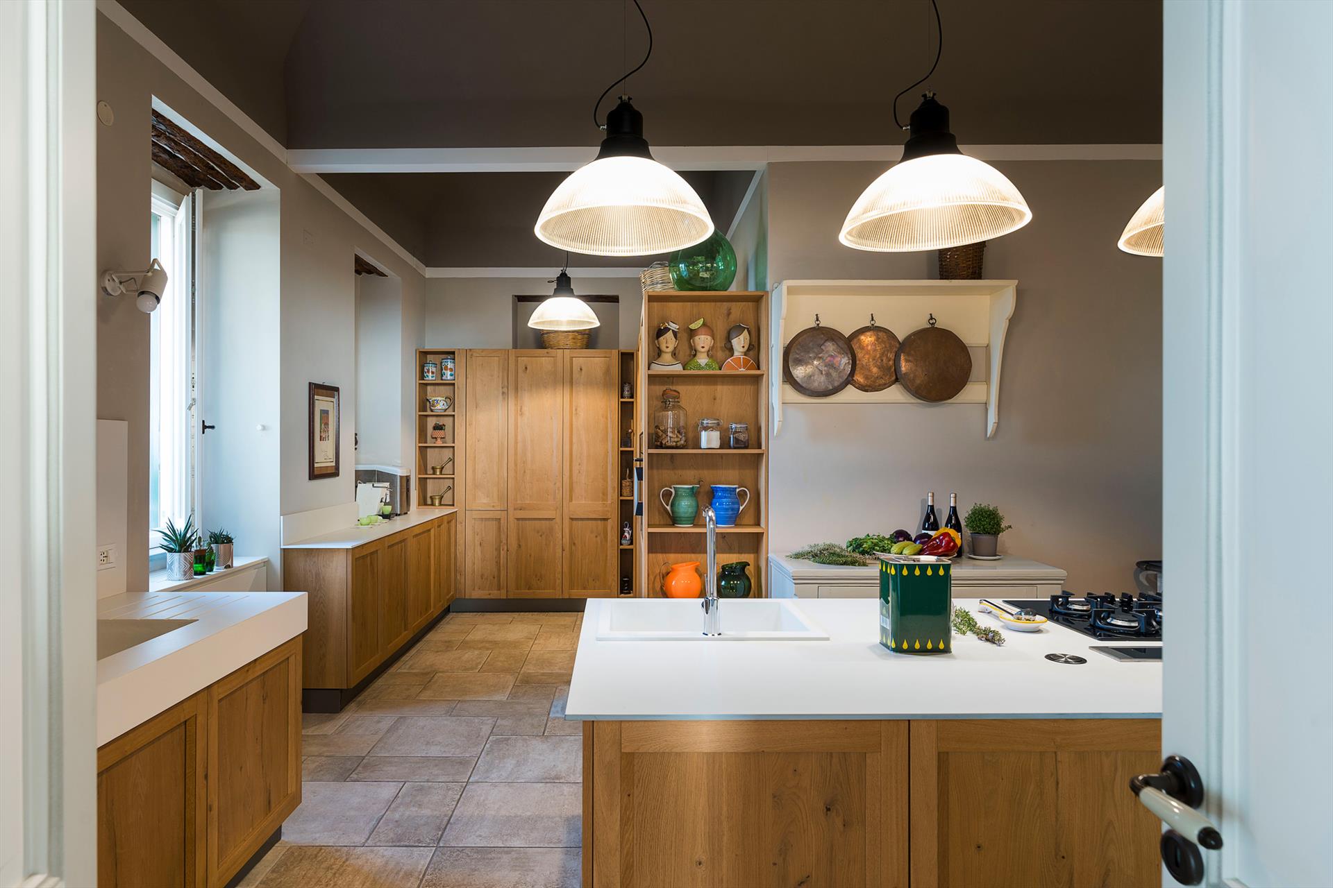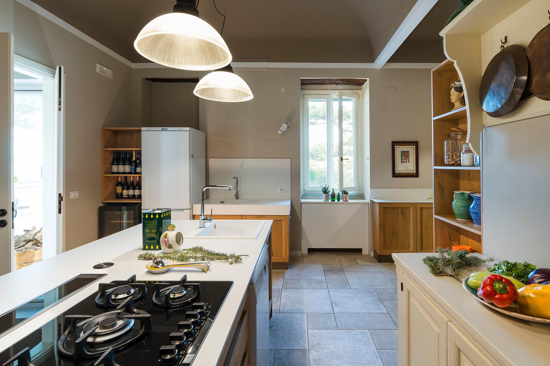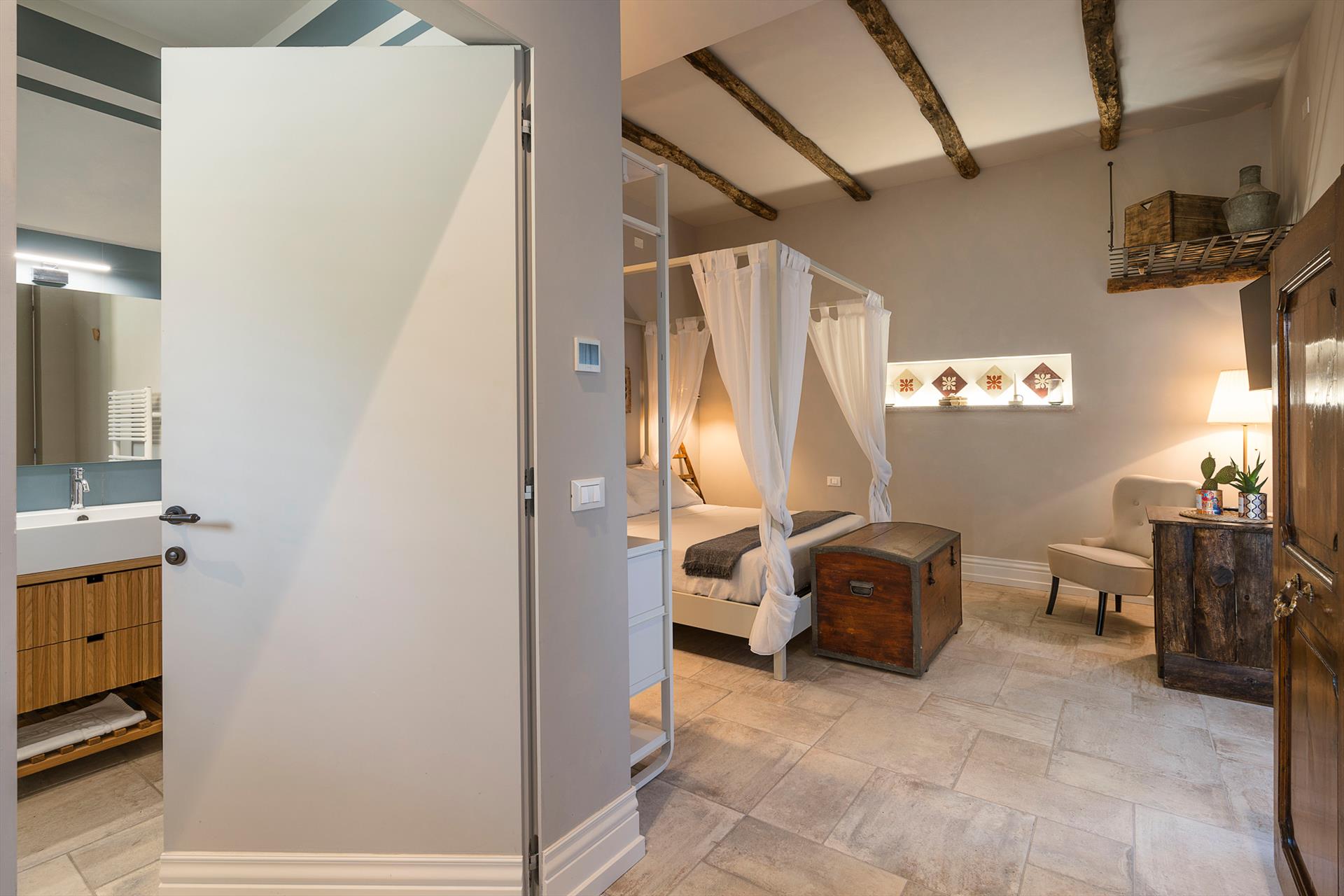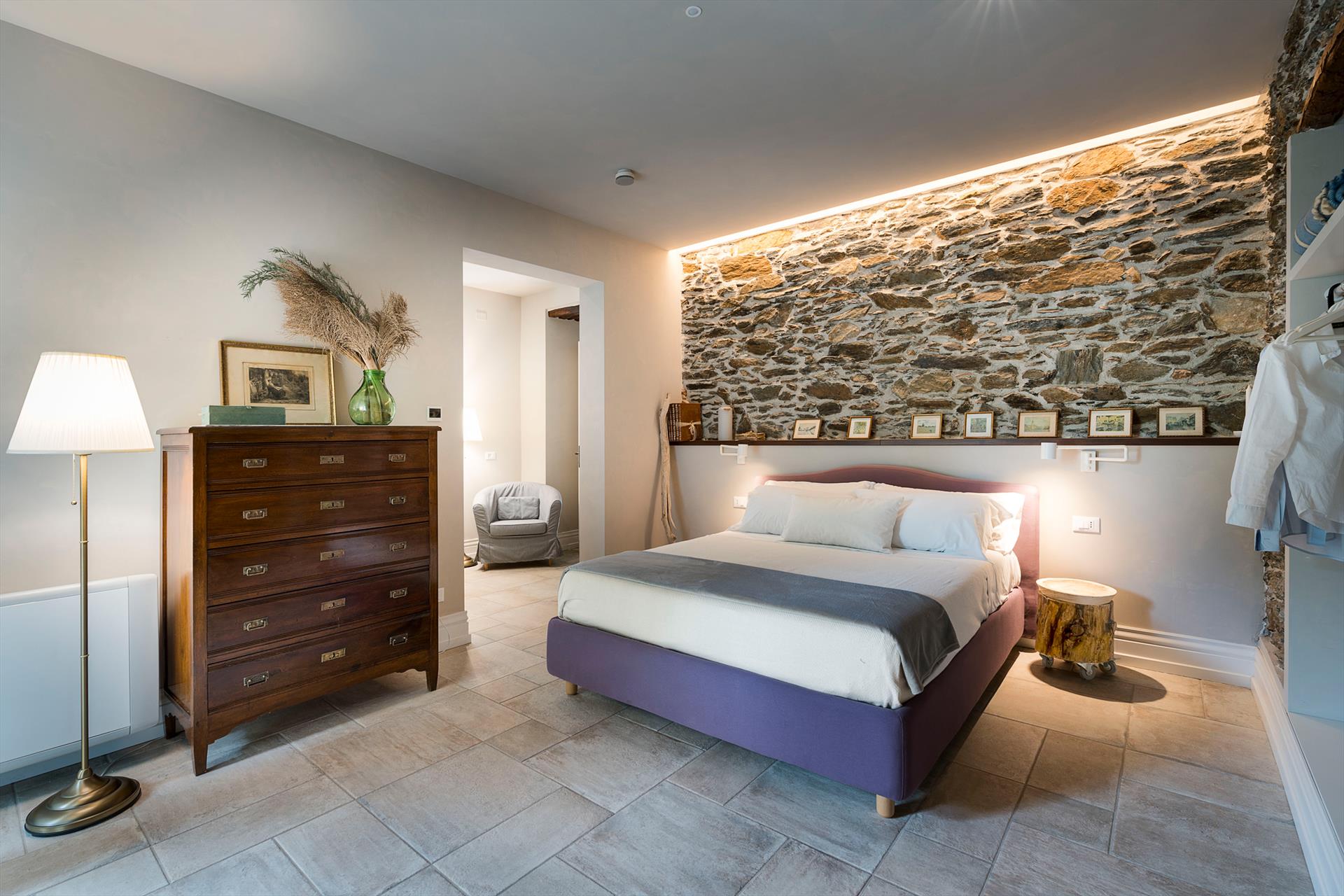 La récente rénovation, méticuleuse, a su préserver les caractéristiques architecturales originales, créant une parfaite harmonie entre le charme d'antan et la simplicité du design moderne. Les intérieurs, confortables et spacieux, sont répartis sur deux niveaux. Ils comptent cinq chambres doubles, chacune avec salle de bains privative, télévision et mini-réfrigérateur. La villa dispose également d'un salon, d'un bureau, d'une salle de petit-déjeuner, d'une salle à manger, de deux cuisines et d'une buanderie.