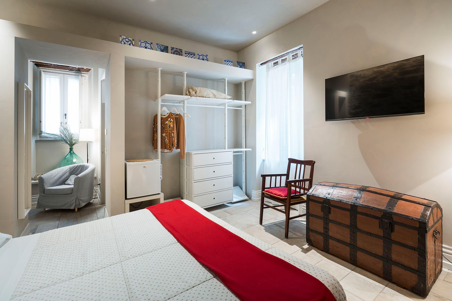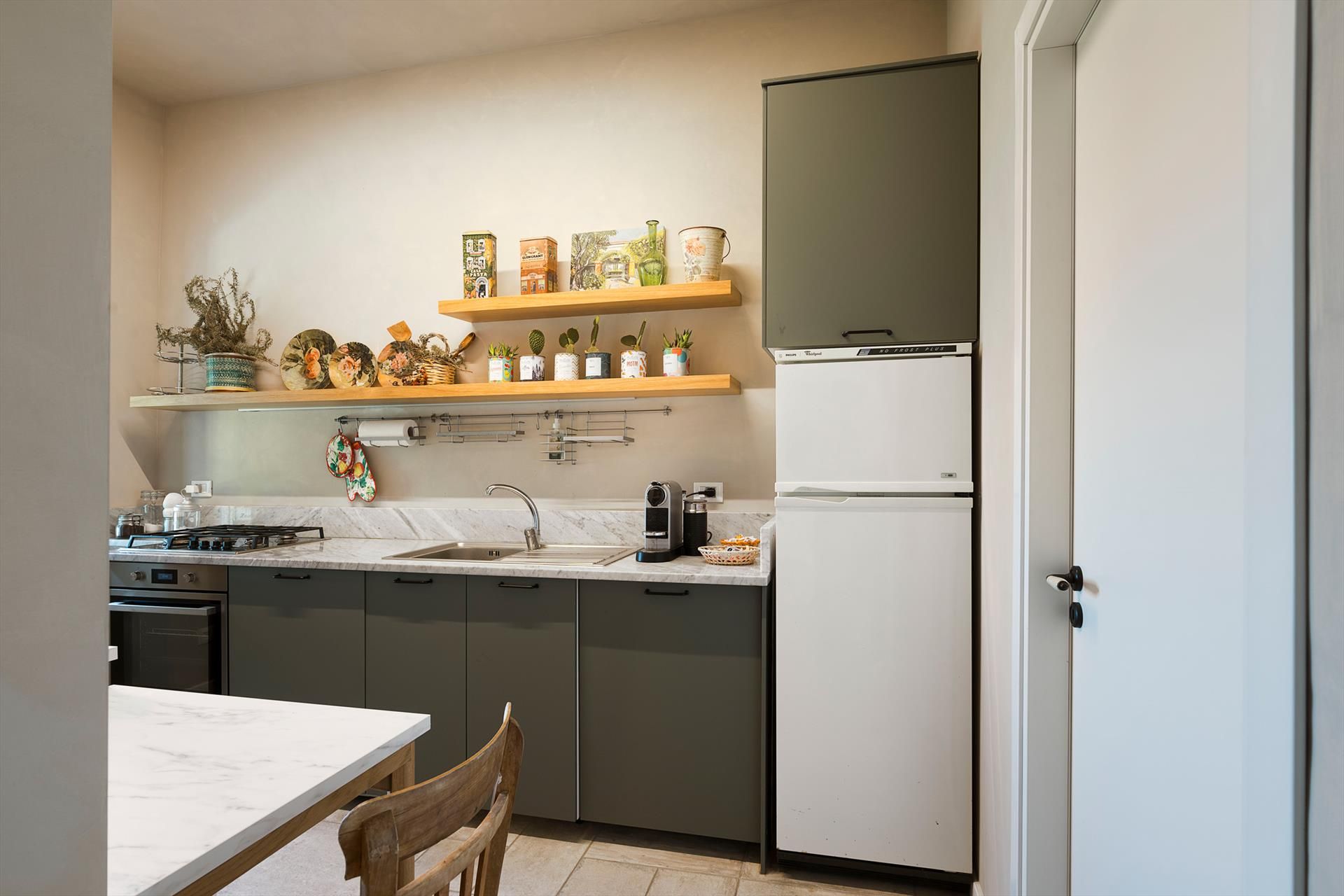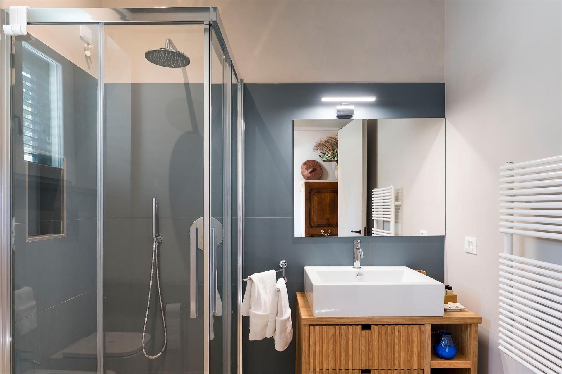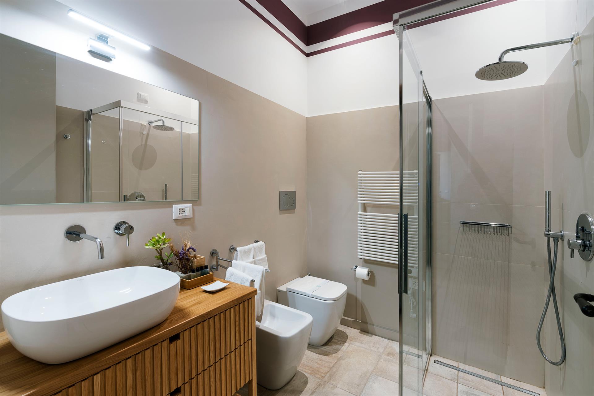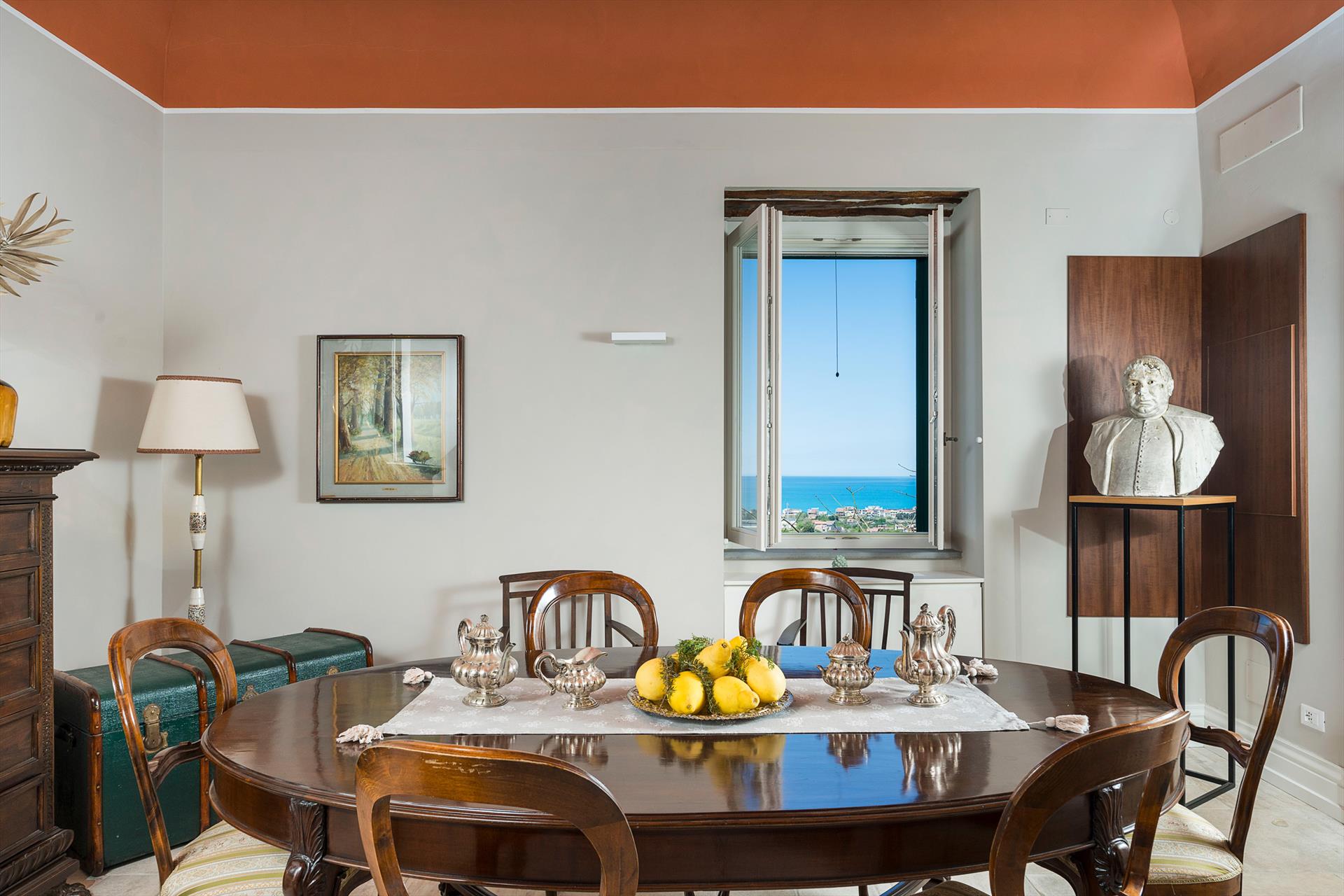 La récente rénovation, méticuleuse, a su préserver les caractéristiques architecturales originales, créant une parfaite harmonie entre le charme d'antan et la simplicité du design moderne. Les intérieurs, confortables et spacieux, sont répartis sur deux niveaux. Ils comptent cinq chambres doubles, chacune avec salle de bains privative, télévision et mini-réfrigérateur. La villa dispose également d'un salon, d'un bureau, d'une salle de petit-déjeuner, d'une salle à manger, de deux cuisines et d'une buanderie.
