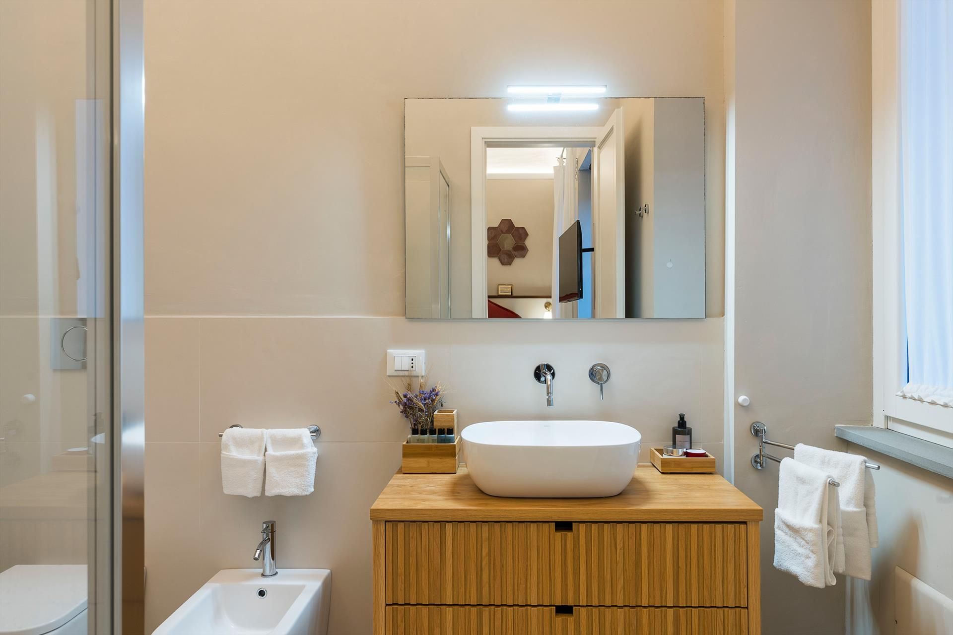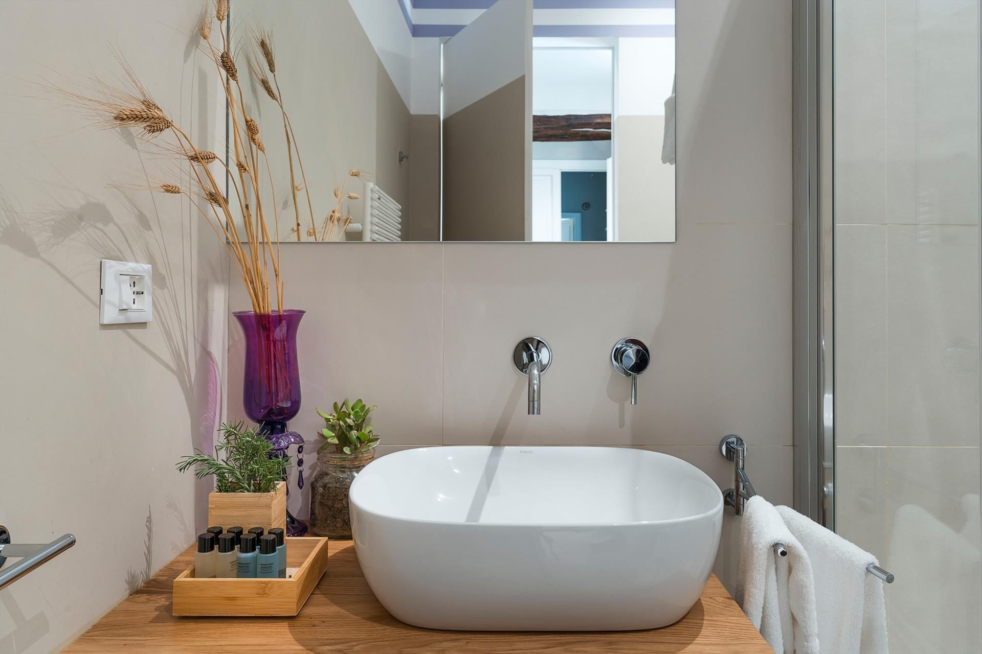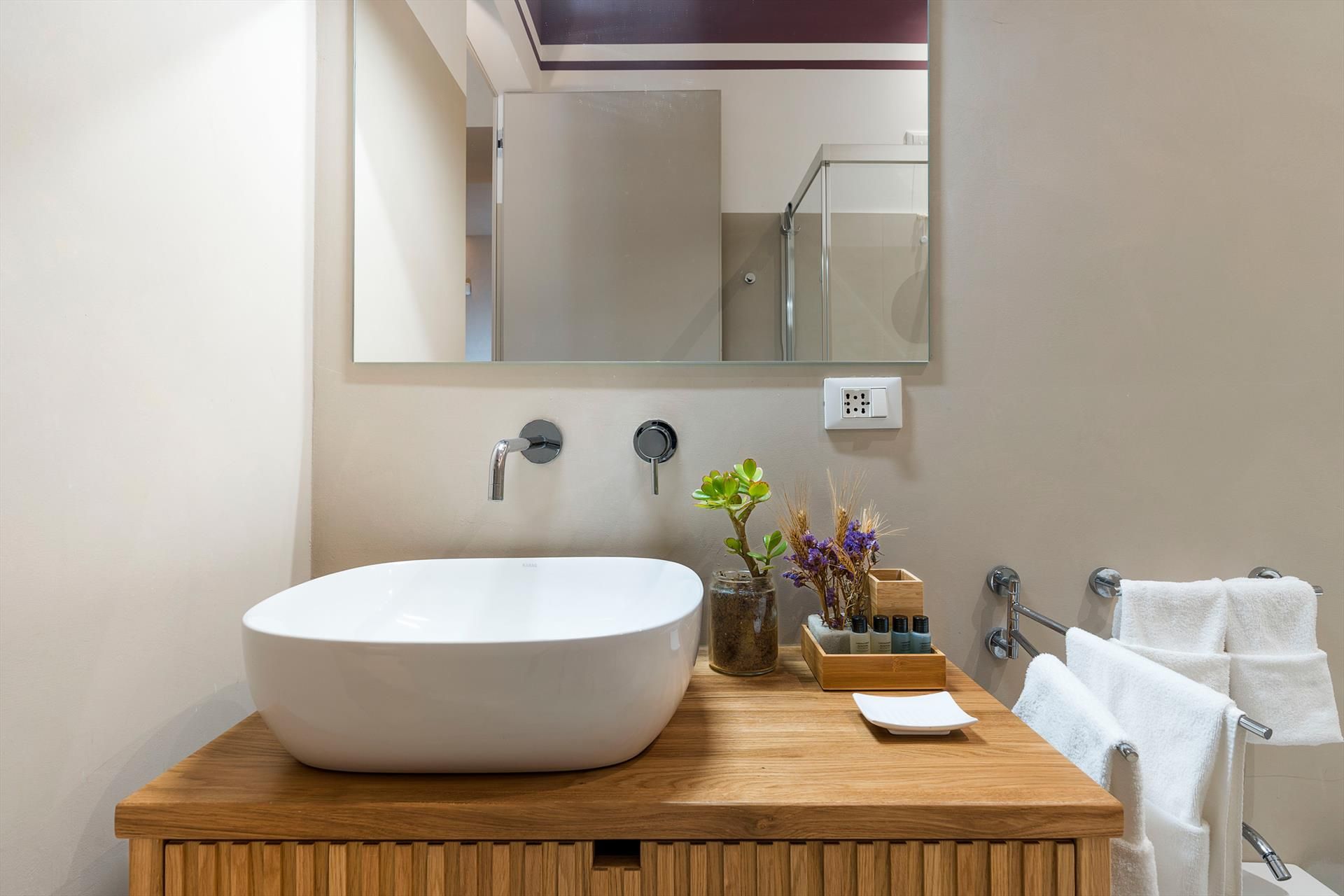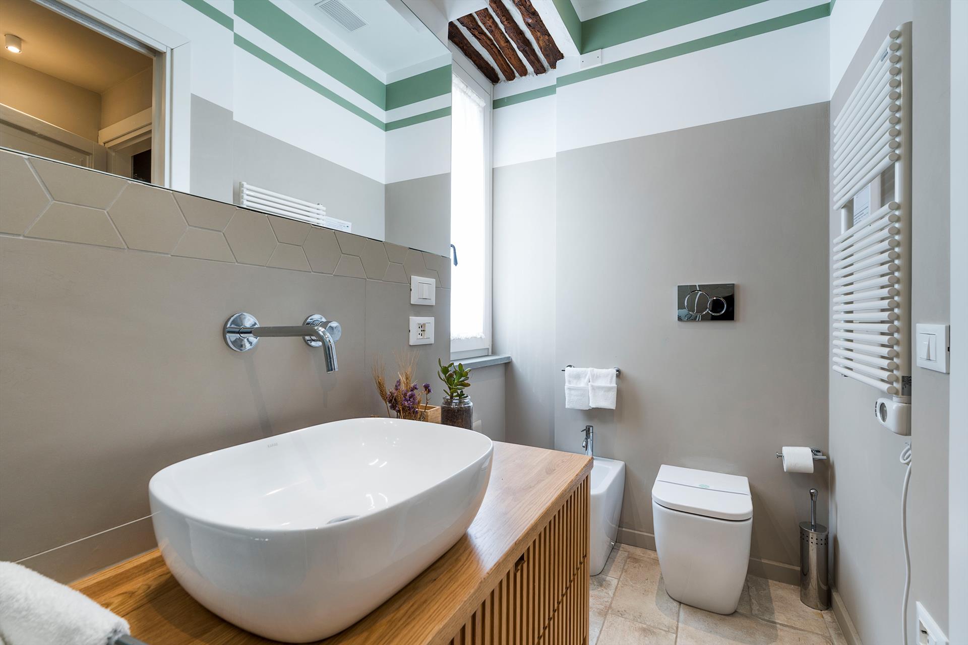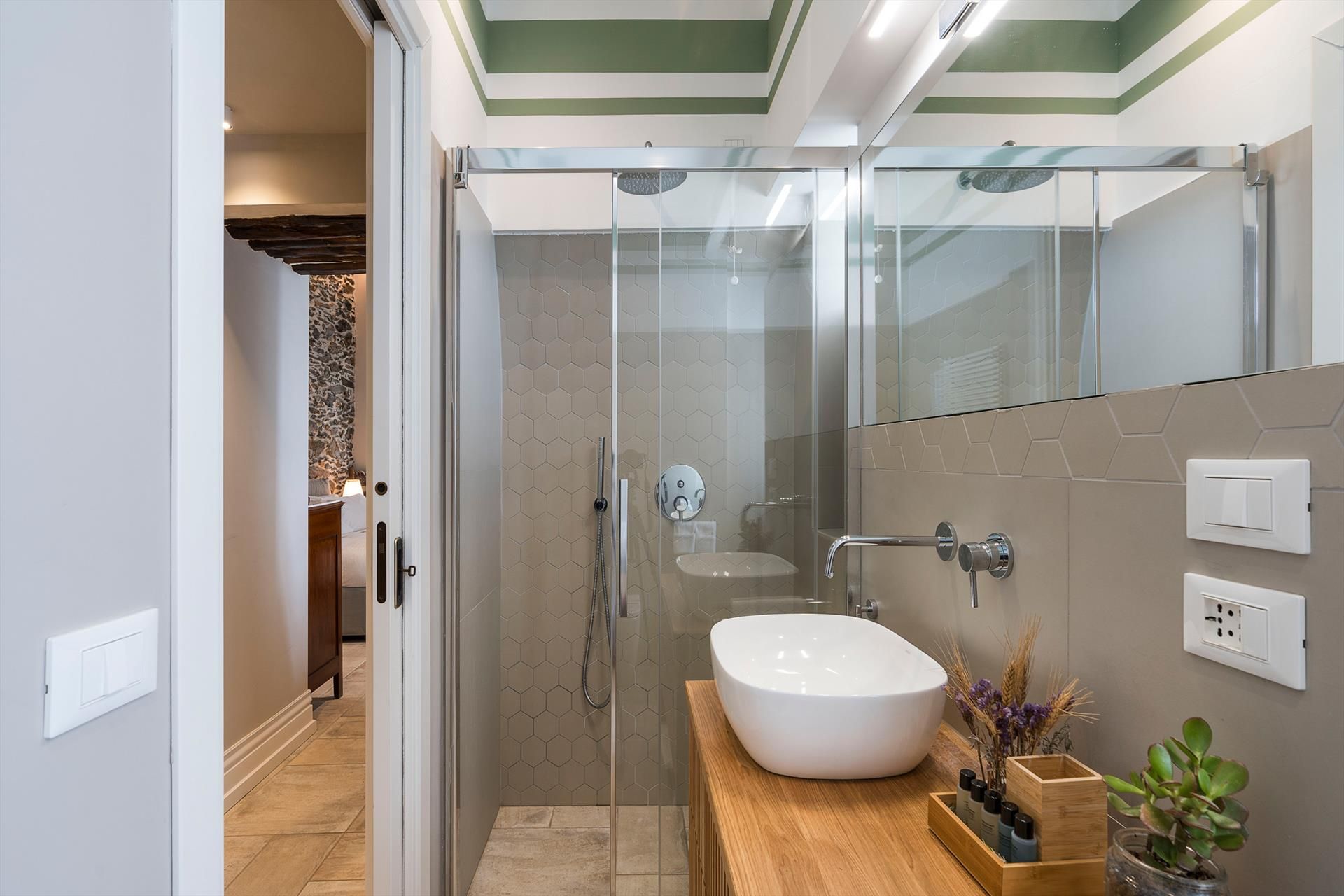 La récente rénovation, méticuleuse, a su préserver les caractéristiques architecturales originales, créant une parfaite harmonie entre le charme d'antan et la simplicité du design moderne. Les intérieurs, confortables et spacieux, sont répartis sur deux niveaux. Ils comptent cinq chambres doubles, chacune avec salle de bains privative, télévision et mini-réfrigérateur. La villa dispose également d'un salon, d'un bureau, d'une salle de petit-déjeuner, d'une salle à manger, de deux cuisines et d'une buanderie.