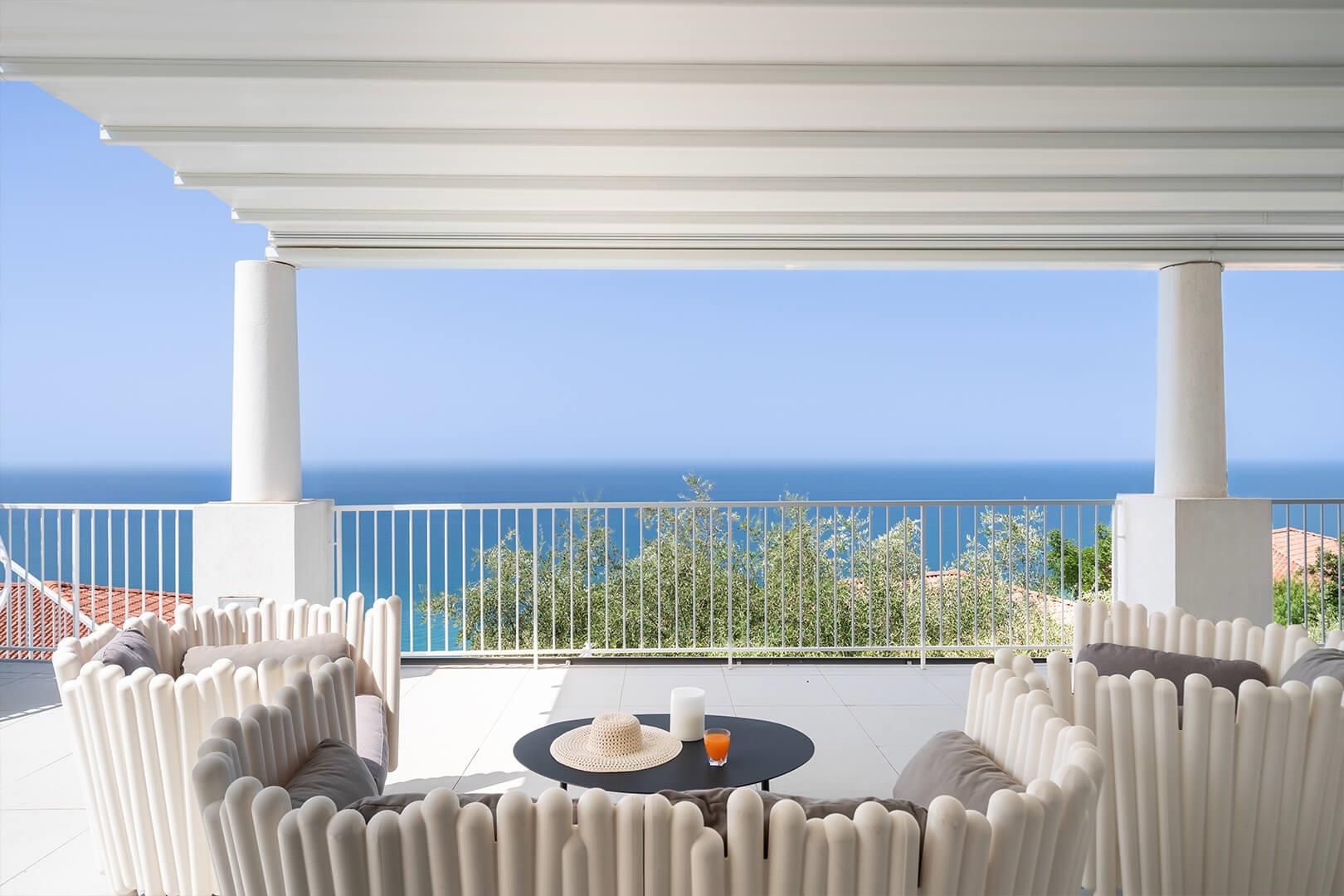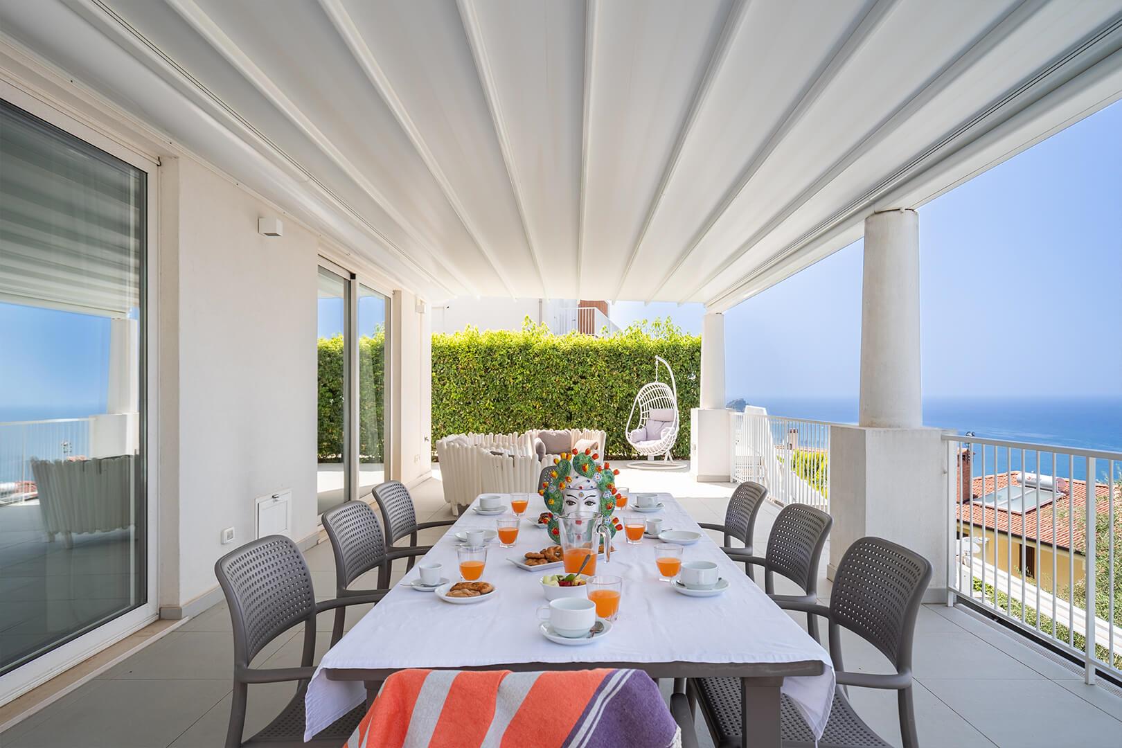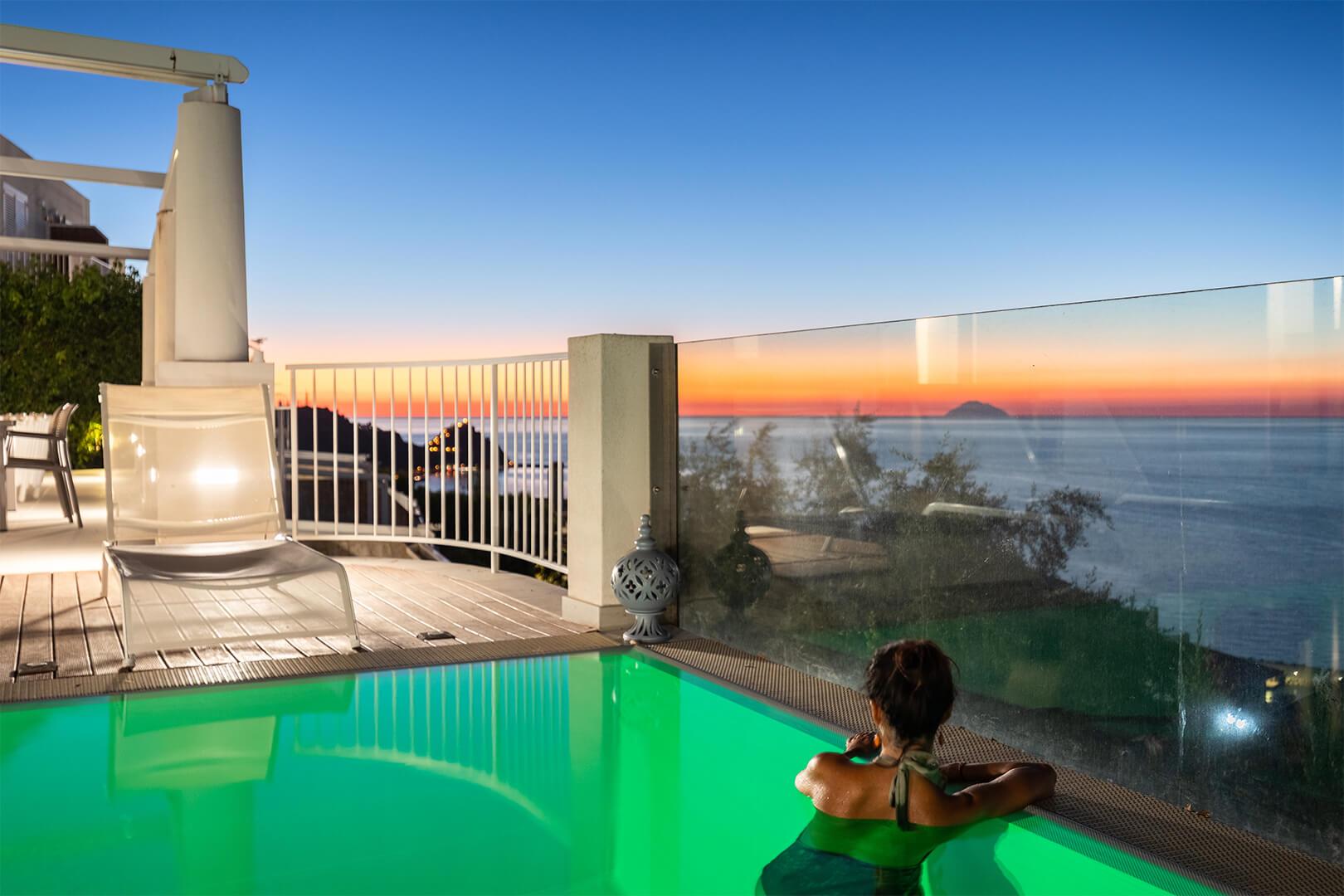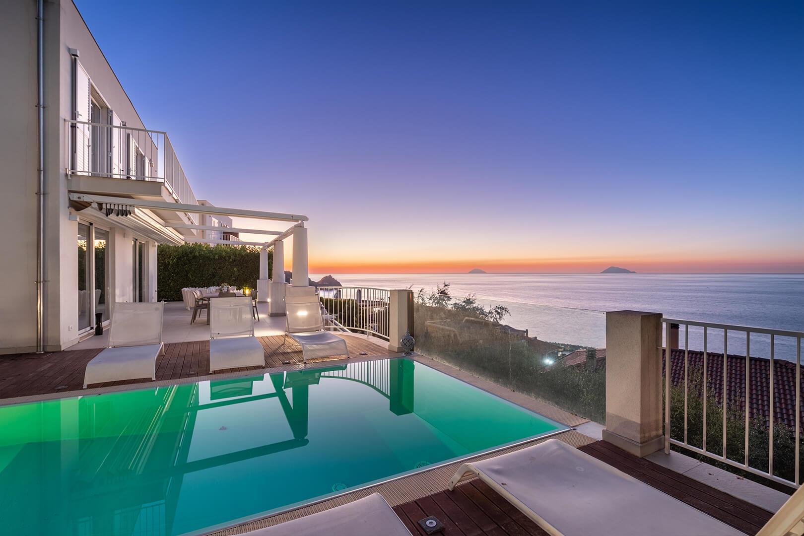 Les intérieurs sont élégants et contemporains, agrémentés d’un mobilier raffiné et sobre. L’espace extérieur comprend une vaste terrasse privée ainsi qu’une petite piscine à débordement, adossée à une suggestive paroi rocheuse, offrant une vue spectaculaire sur la mer Tyrrhénienne et les îles Éoliennes.