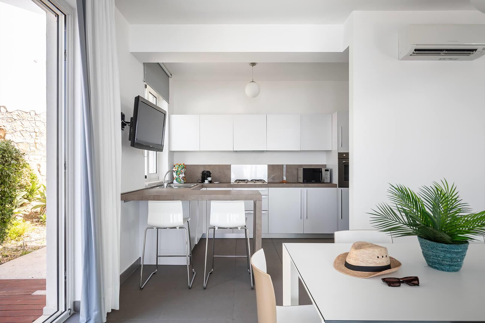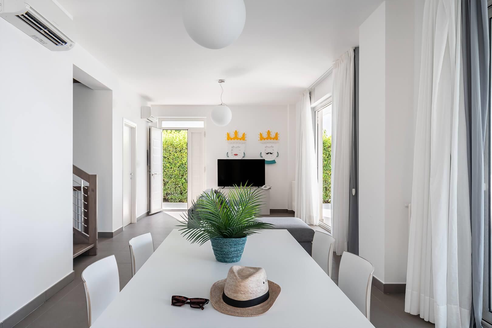 Climatisation avec unités split indépendantes dans chaque pièce, Wi-Fi, cuisine entièrement équipée avec lave-vaisselle (four, micro-ondes, grille-pain, etc.), sèche-cheveux, 2 coffres-forts, 2 porte-bagages, espace détente sur deux niveaux, grande terrasse avec table et chaises, parking réservé et vidéo-surveillé pour 2 voitures, télévisions Full HD, interphone vidéo, 2 stores motorisés.