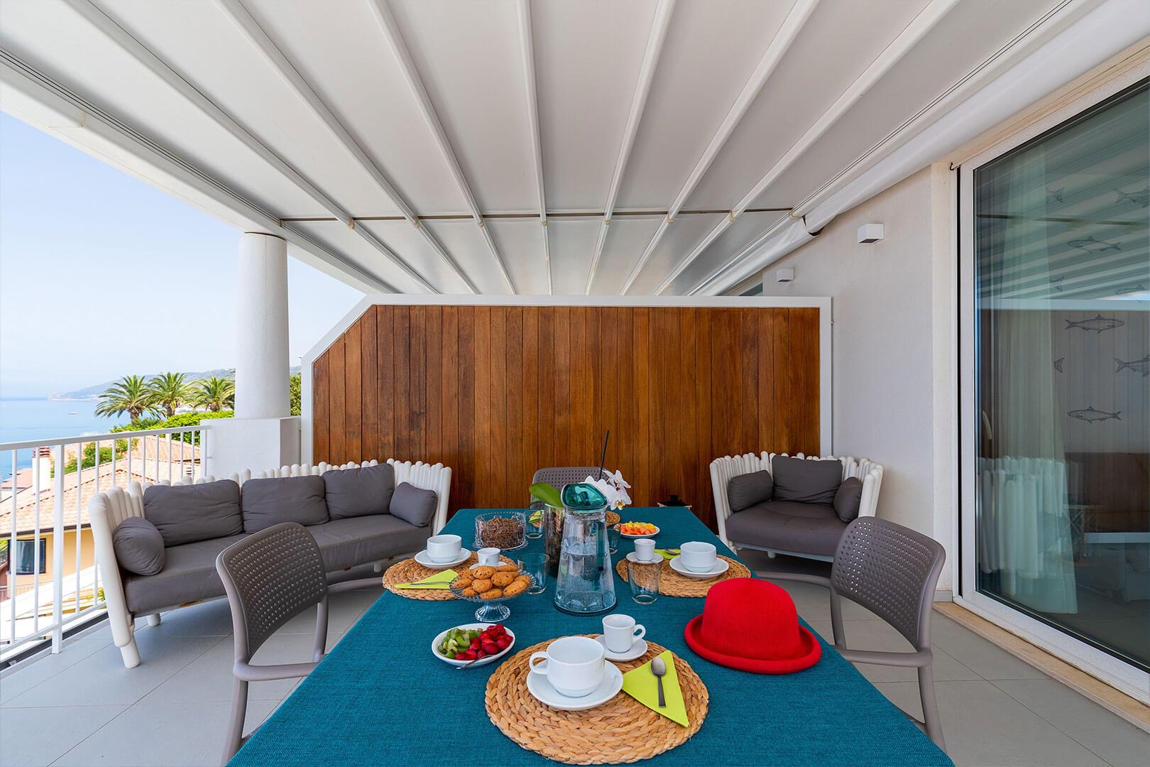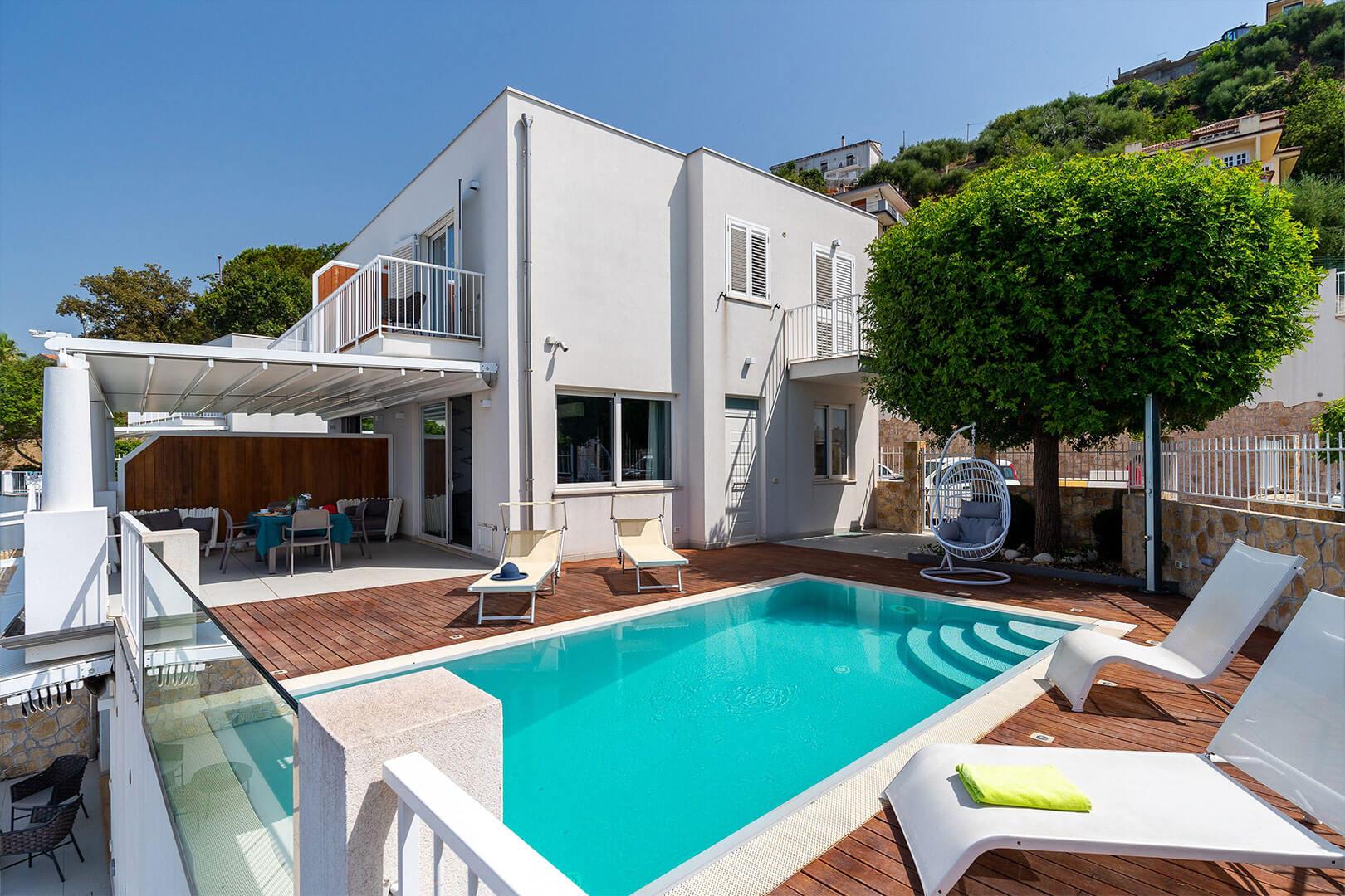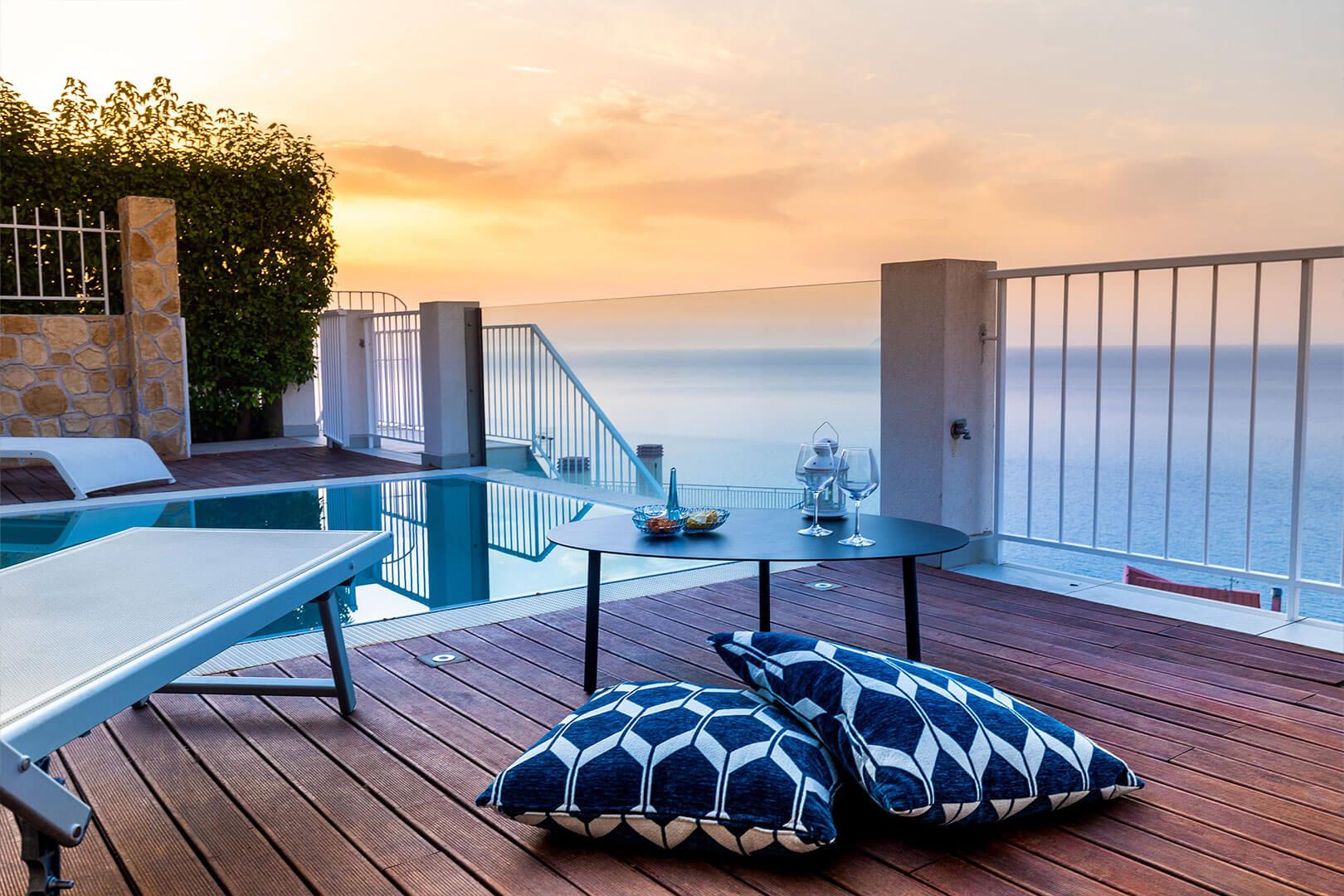 La piscine (3,3 m × 6 m, piscine à débordement) est orientée vers la mer et les îles Éoliennes. Depuis la piscine, les invités peuvent admirer des couchers de soleil à couper le souffle, tandis qu’une tranquillité absolue encadre le magnifique panorama environnant. À côté de la piscine, la terrasse extérieure constitue l’endroit idéal pour prendre le petit-déjeuner ou passer des moments de détente en famille ou entre amis.