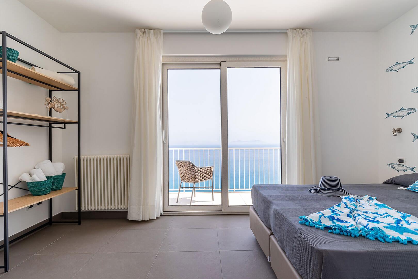 Premier étage : chambre principale avec lit queen-size et armoire 3 portes, salle de bain attenante avec douche, balcon avec vue sur la mer, chambre double avec salle de bain attenante avec douche, armoire 2 portes, balcon