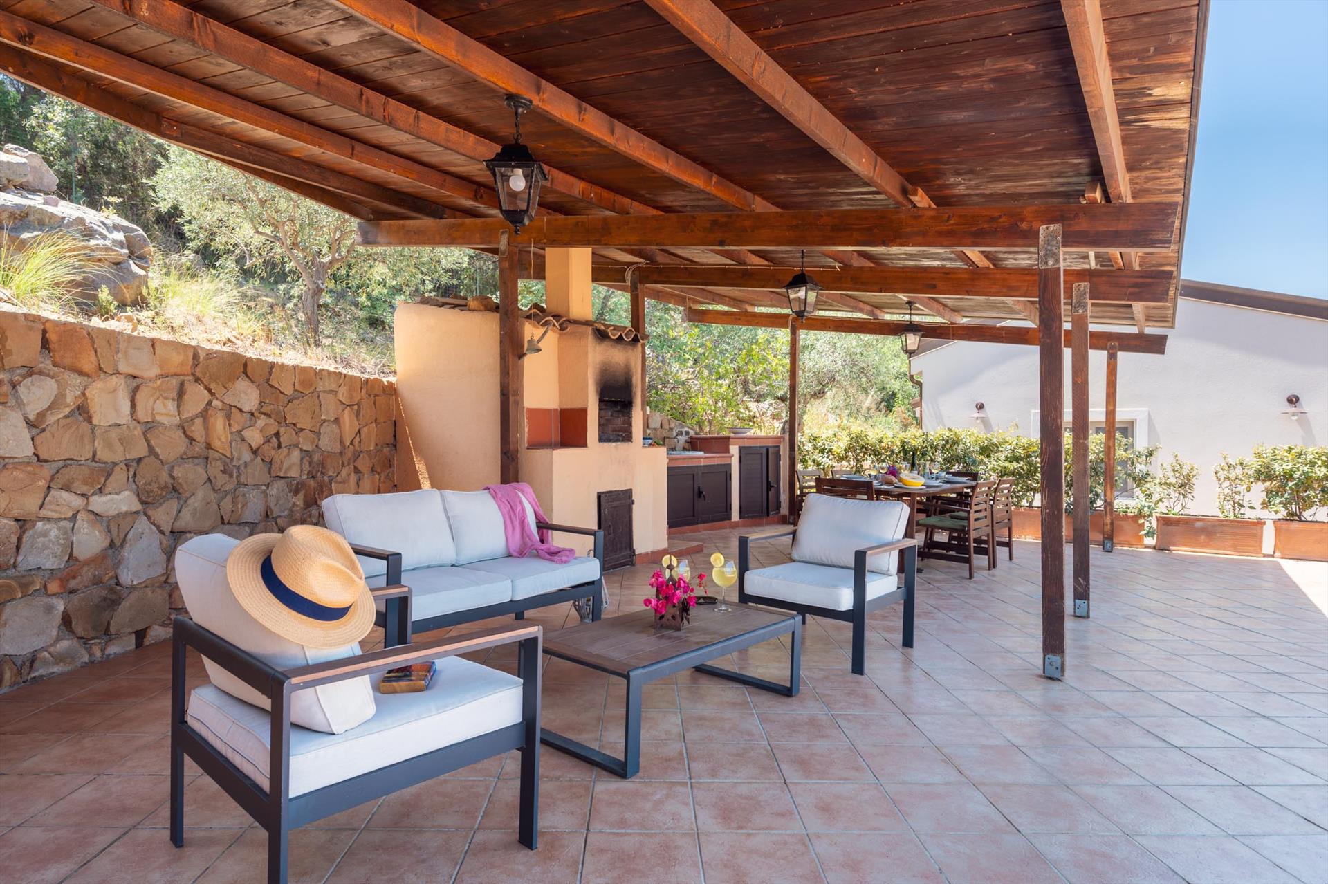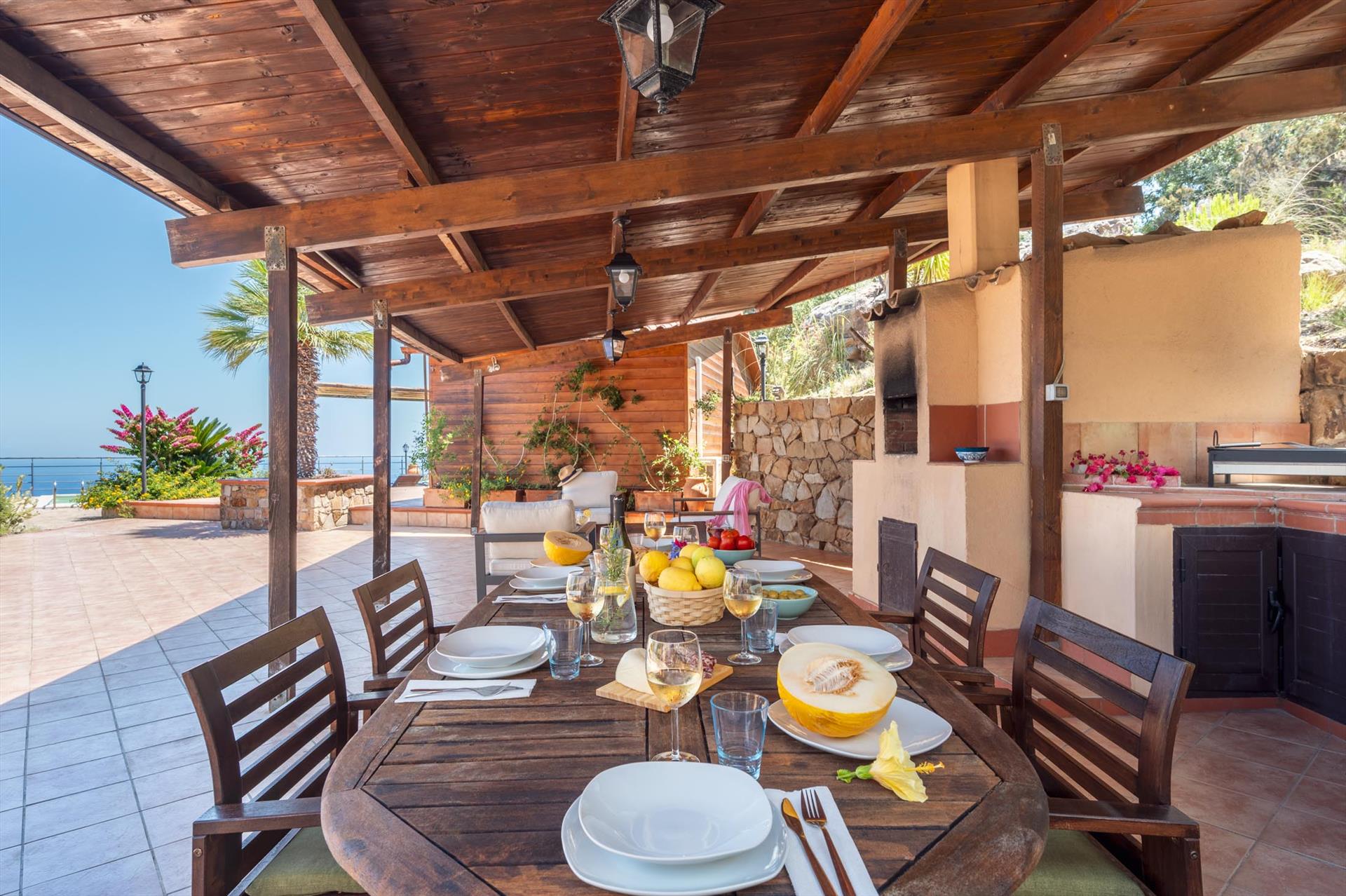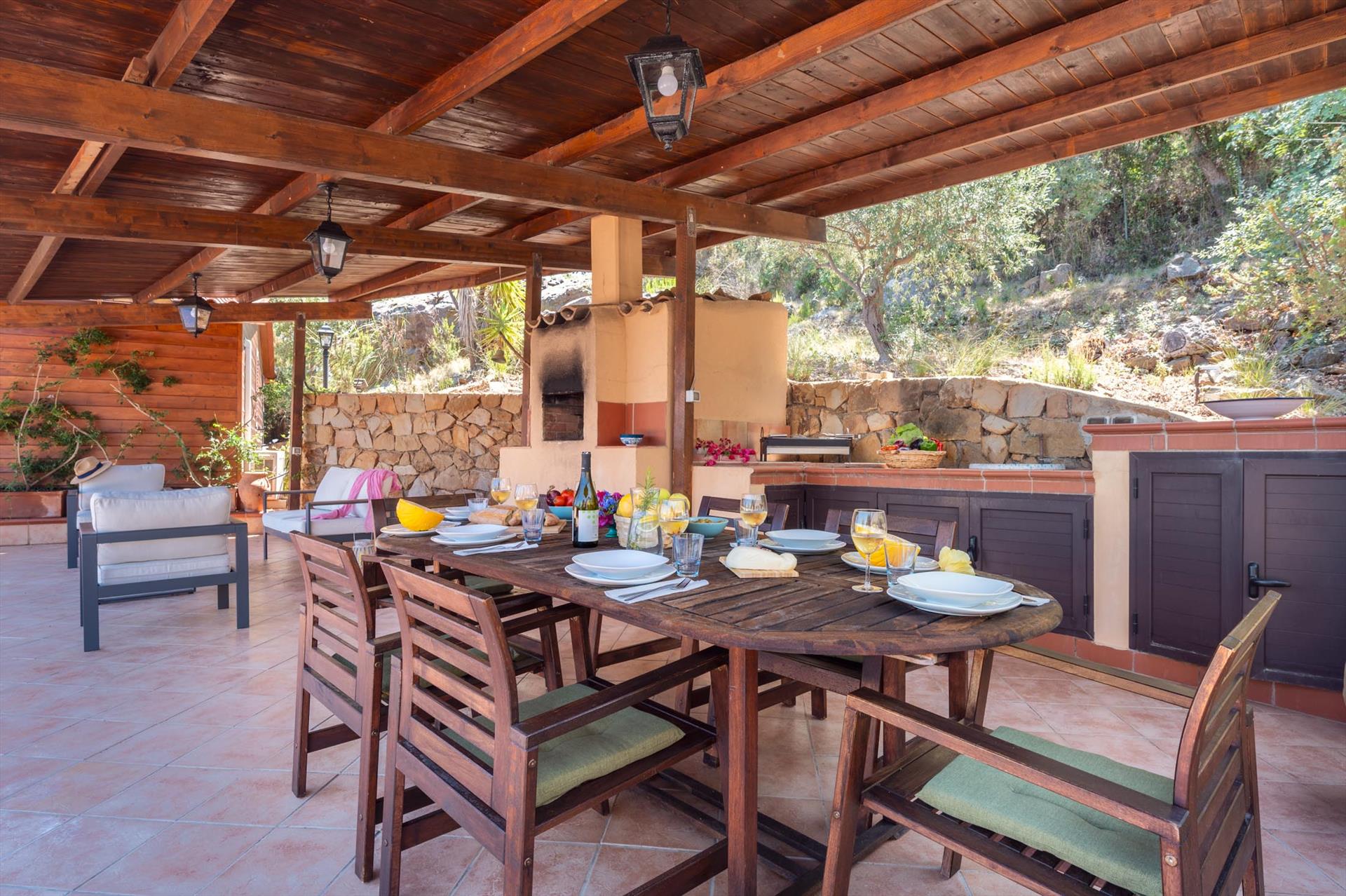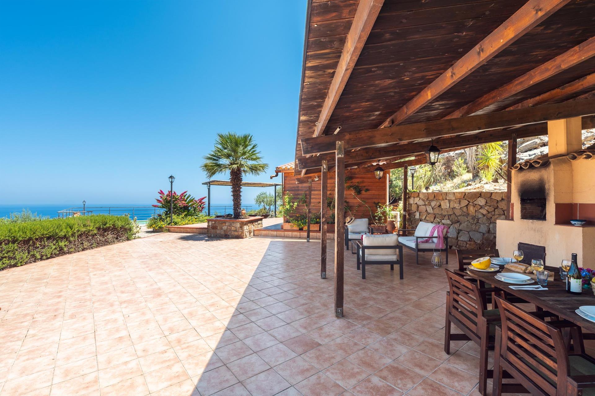 A l'extérieur, il y a 3 grands auvents : un devant la maison, où vous pouvez déjeuner avec une vue à couper le souffle, un autre où vous pouvez vous asseoir sur un salon pour profiter d'un apéritif et un autre dans la zone de la piscine. Grands espaces extérieurs et jardin avec pelouse. Coin repas extérieur avec évier et barbecue portable. Armoire avec lave-linge.