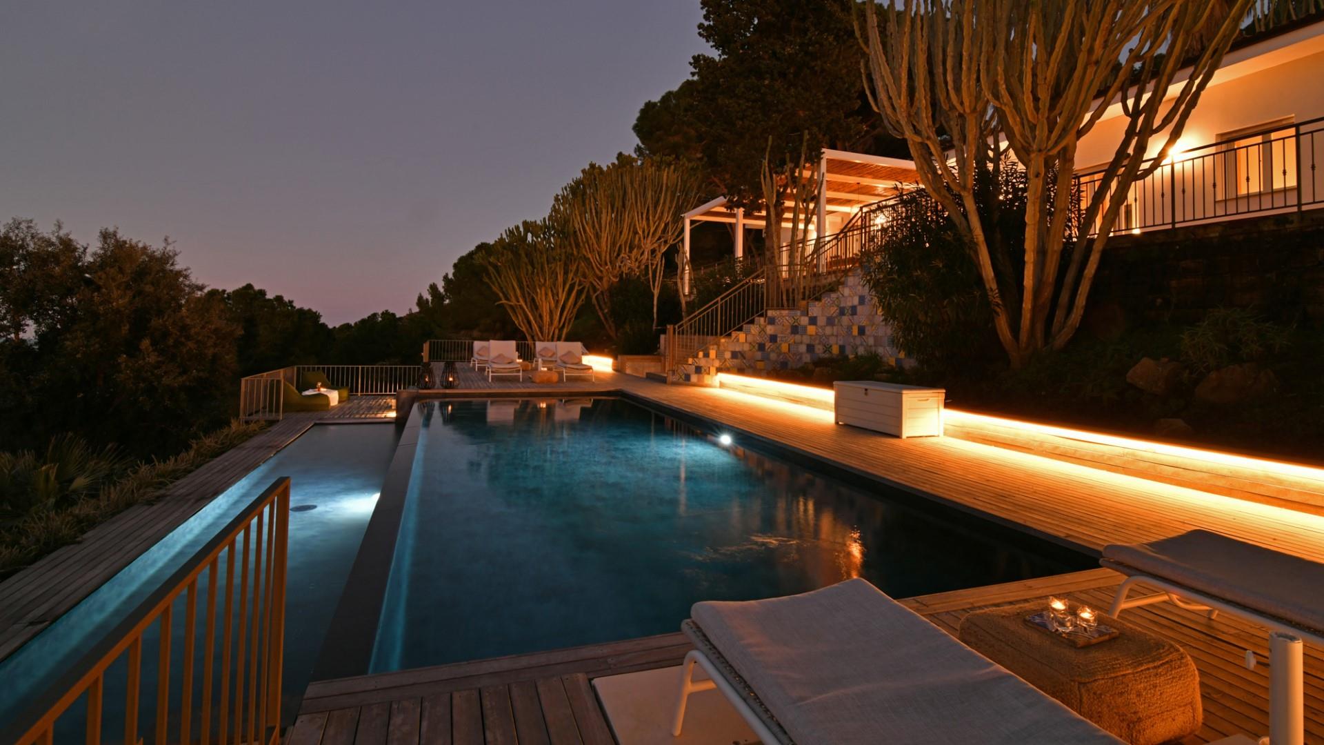 La piscine est située sur une terrasse plus basse que celle de la villa, dont elle est distante d'environ 10 m. On y accède par un escalier de 15 marches. On y accède par un escalier de 15 marches. De là, on a une vue sur la mer et, par temps clair, on peut apercevoir à l'horizon les îles Éoliennes, Alicudi et Filicudi. La piscine à débordement est de forme rectangulaire, de 4 x 11 m de large et de 1,30 m de profondeur. Elle est bordée par un grand solarium en bois d'environ 50 mètres carrés où sont installés des chaises longues, des parasols et une douche solaire. La piscine est désinfectée au chlore et au sel, revêtue de PVC et accessible par un escalier en briques. La piscine est ouverte du dernier samedi d'avril au premier samedi de novembre.