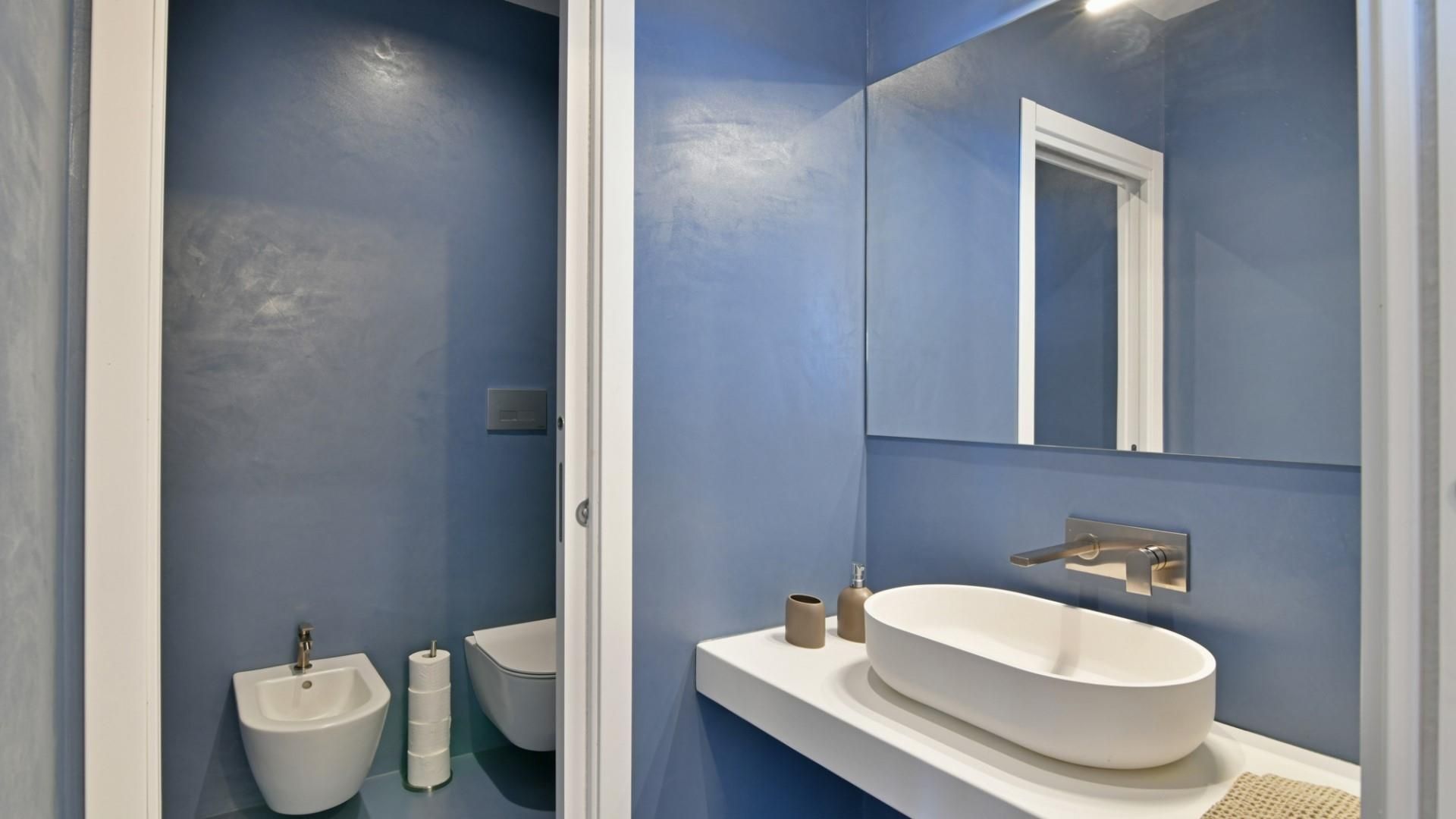 La grande terrasse est accessible par quelques marches depuis le parking privé. On est immédiatement accueilli par le salon extérieur et c'est d'ici que la porte-fenêtre mène à l'intérieur de la maison qui est de plain-pied. On entre dans une seule pièce lumineuse qui comprend la salle à manger, la cuisine moderne et bien équipée et le salon avec cheminée décorative. La salle de bains de service est adjacente. Depuis le salon, on accède au coin nuit : à gauche, une chambre double avec vue sur la mer, une porte-fenêtre avec accès direct au jardin et une salle de bains attenante avec baignoire et douche. À droite du salon, en passant par le couloir, se trouvent la buanderie, une chambre double avec accès à la terrasse et salle de bain en suite avec baignoire, une chambre double et une chambre double avec lit à la française (1.40m) partageant une salle de bain avec douche.