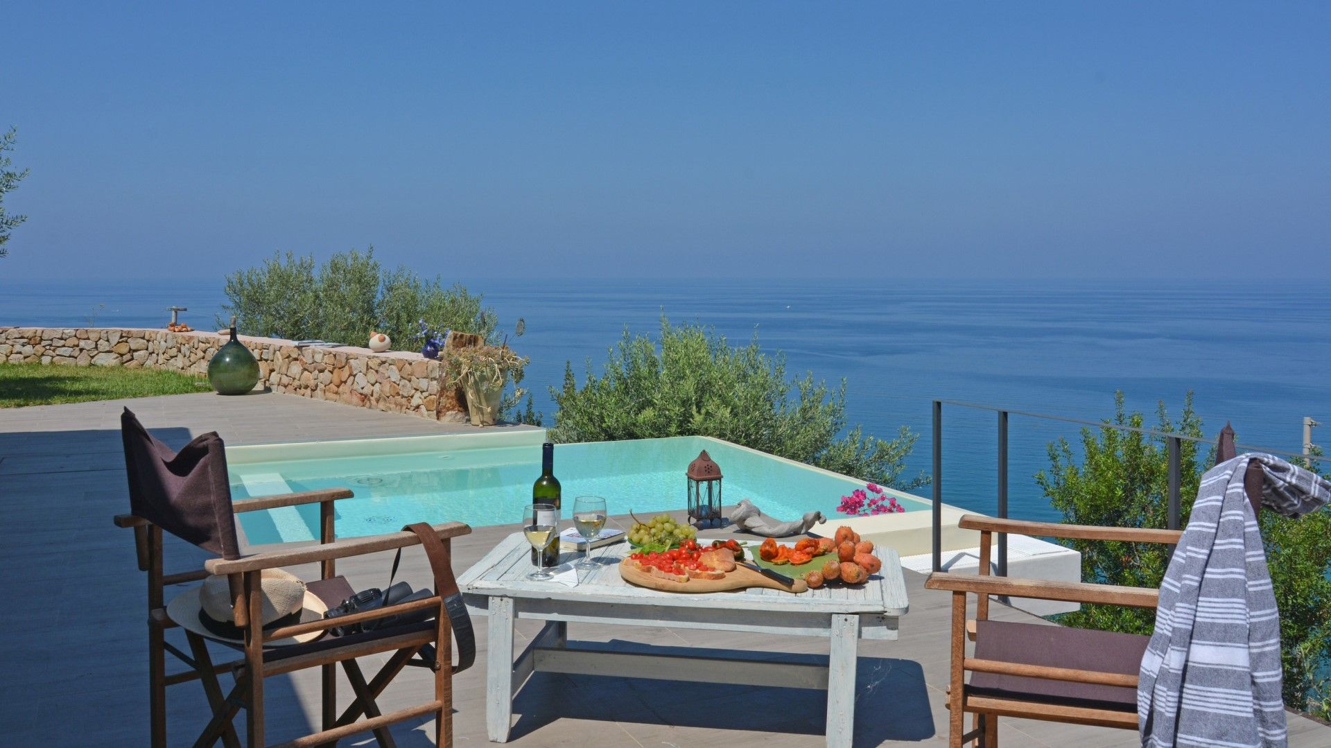 En entrant dans la villa, on passe par les zones ombragées de la salle à manger extérieure et de la cuisine. La grande terrasse, pavée de traverses de chemin de fer africaines en bois restaurées, s'étend sur toute la longueur de la maison. La petite piscine, le canapé et les chaises longues offrent de nombreuses possibilités de se détendre. Le coin repas ombragé est situé à côté de la pelouse et à proximité de la cuisine intérieure. La cuisine extérieure est équipée d'une plaque de cuisson et d'un évier, un endroit charmant pour des déjeuners paresseux cuits sur le barbecue ou dans le four à bois avec la vue enchanteresse sur la mer. Veuillez noter que le discret propriétaire de la Villa Talia possède une petite maison en bois à environ 15 m de la villa où il séjourne le week-end afin d'être disponible à l'arrivée et au départ et pour tout autre besoin. La piscine n'est pas visible de sa maison mais la route d'accès est partagée.