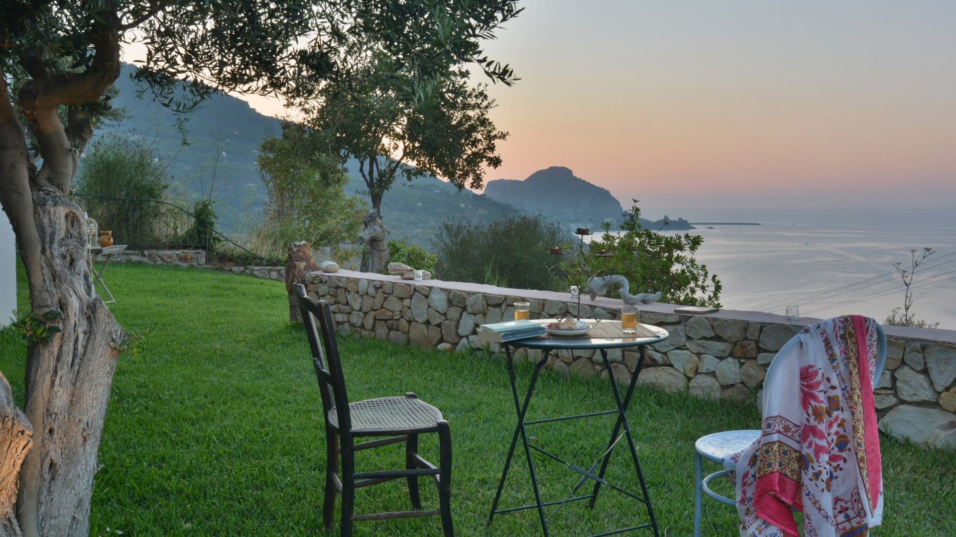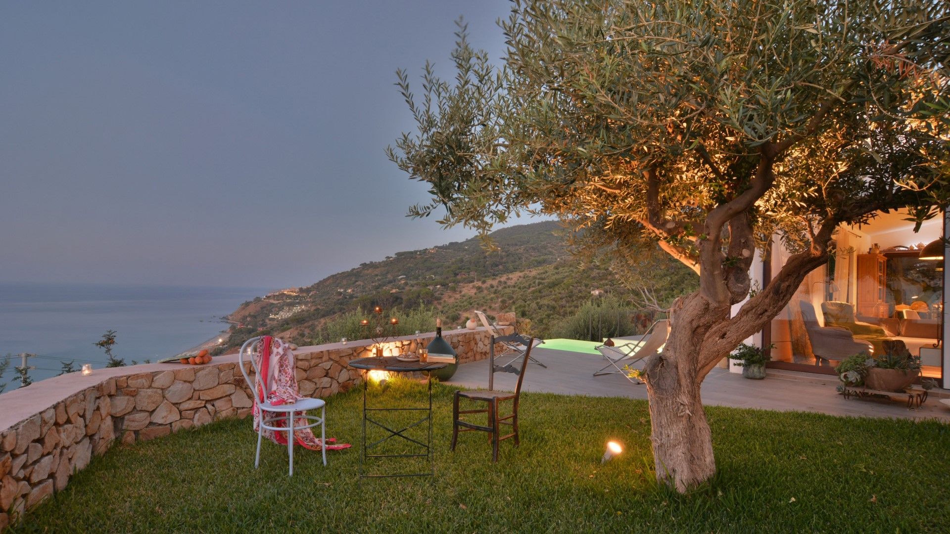 Derrière la salle à manger, il y a un petit potager avec des herbes et des légumes de saison à la disposition des hôtes avec une petite table et 4 chaises. Immédiatement autour de la maison, la terrasse est en partie en pelouse avec quelques oliviers pour l'ombre et en partie pavée.