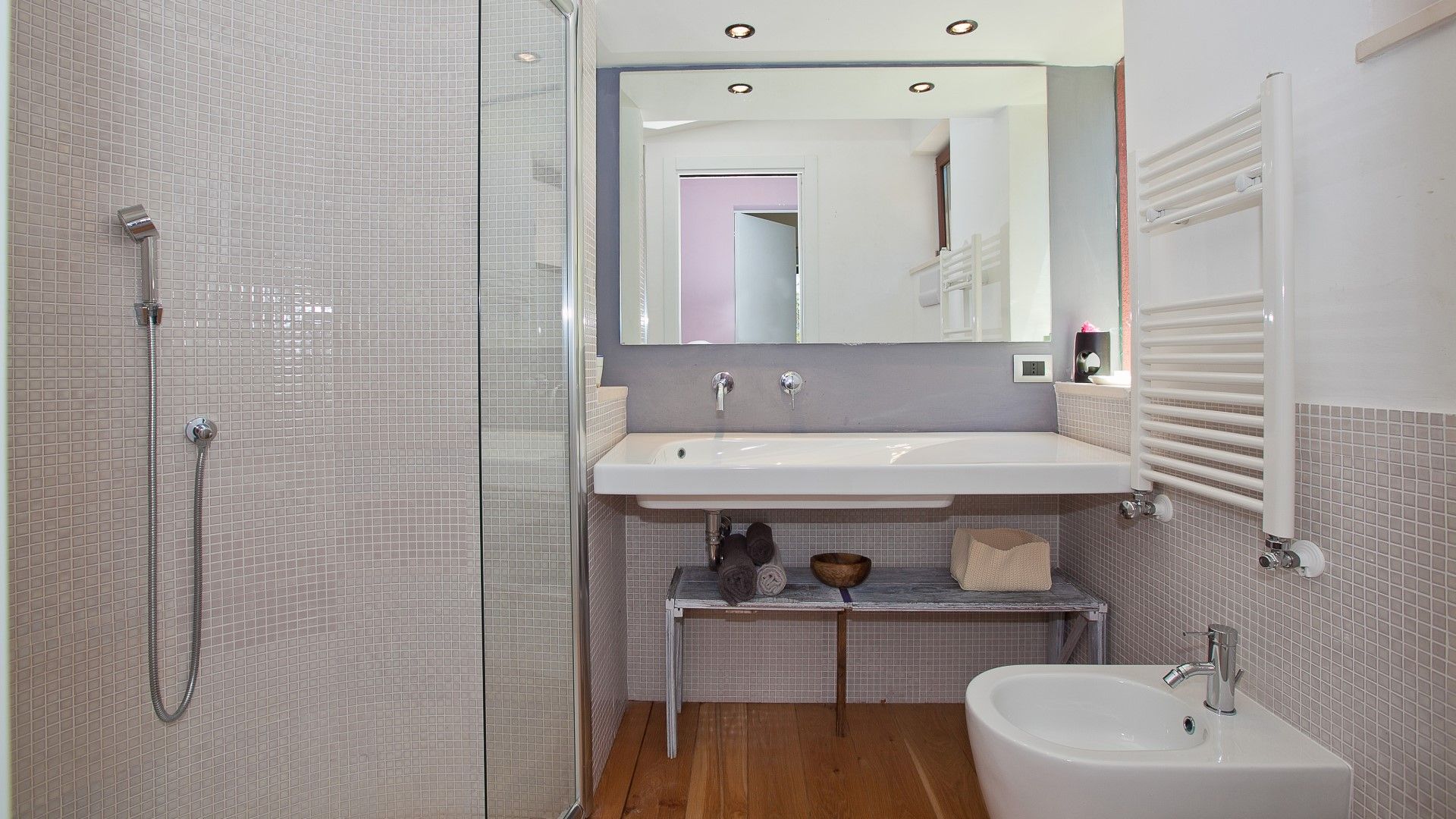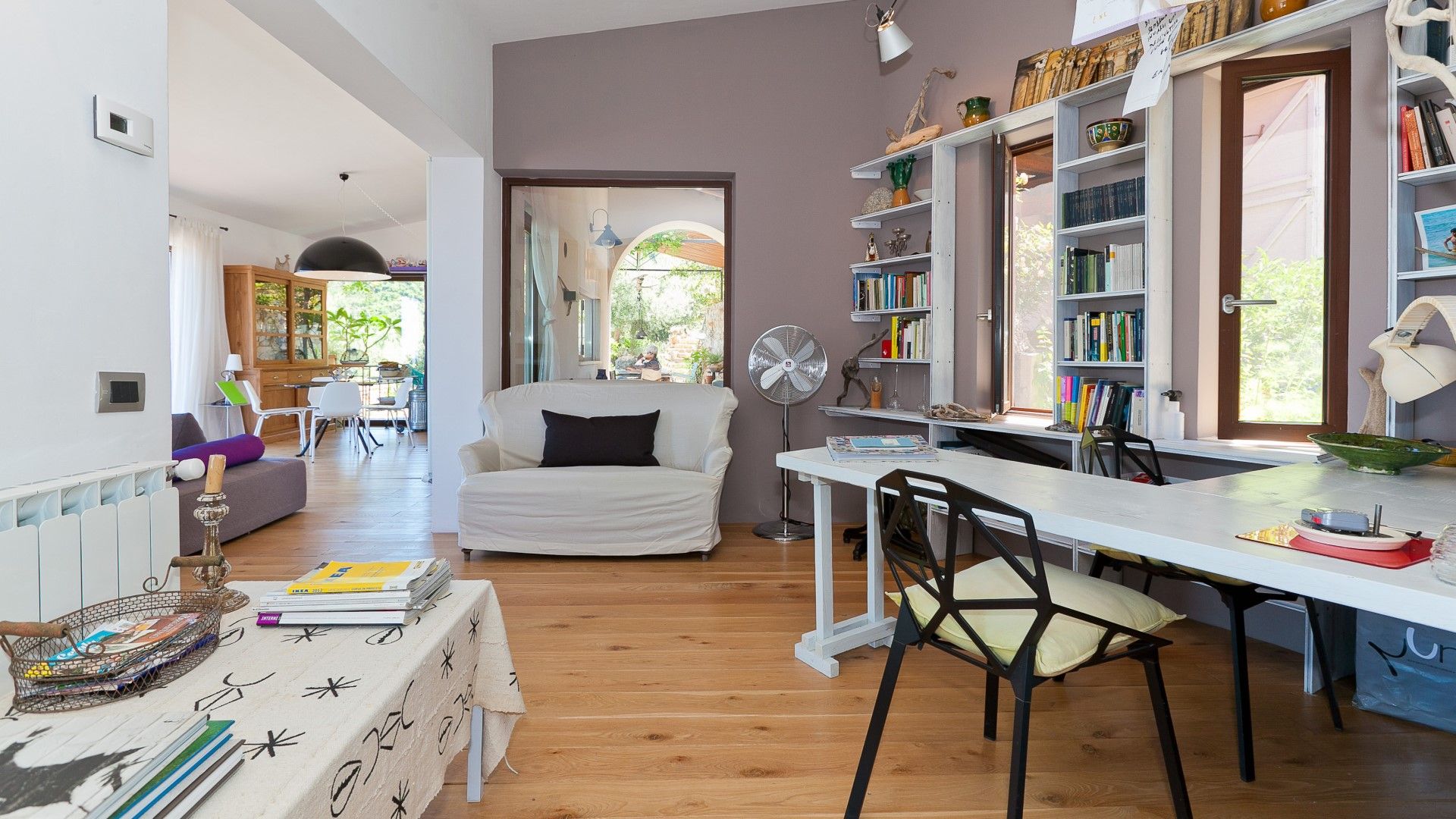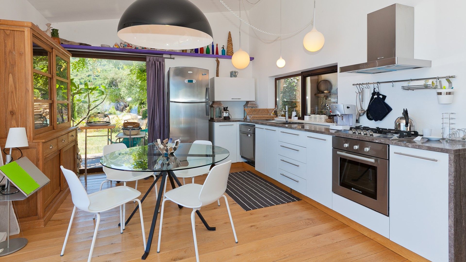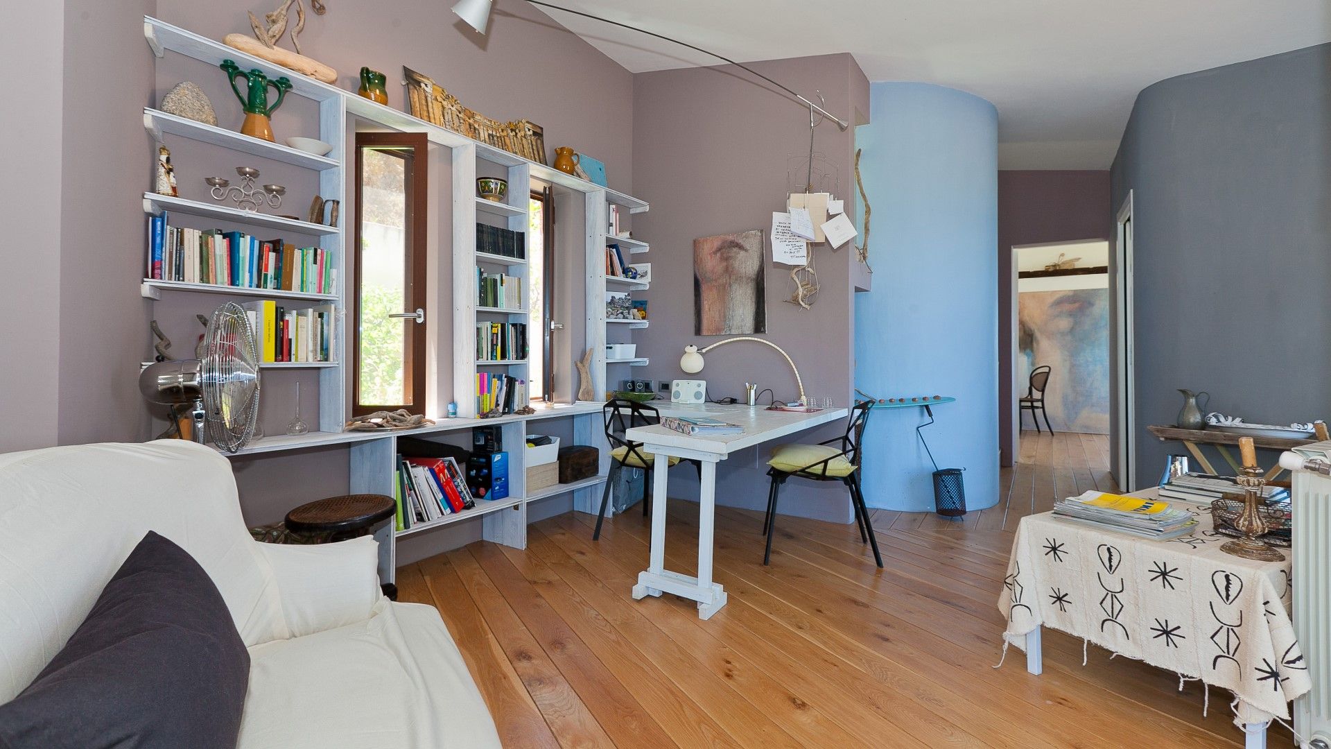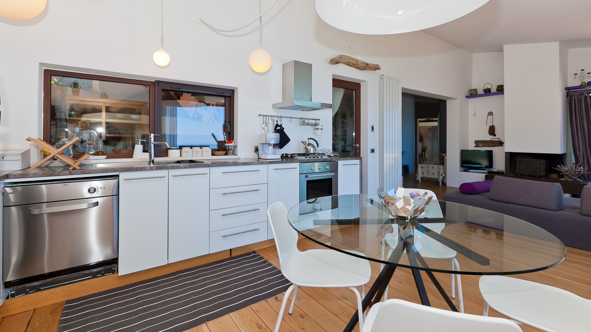 Une palette de couleurs modernes dans les tons de blanc et de gris, ponctuée d'éclats de couleur dans les tissus et les œuvres d'art disséminés dans la villa, lui confère un caractère et un style uniques et raffinés. En entrant, on est accueilli par la salle de séjour avec la cuisine.