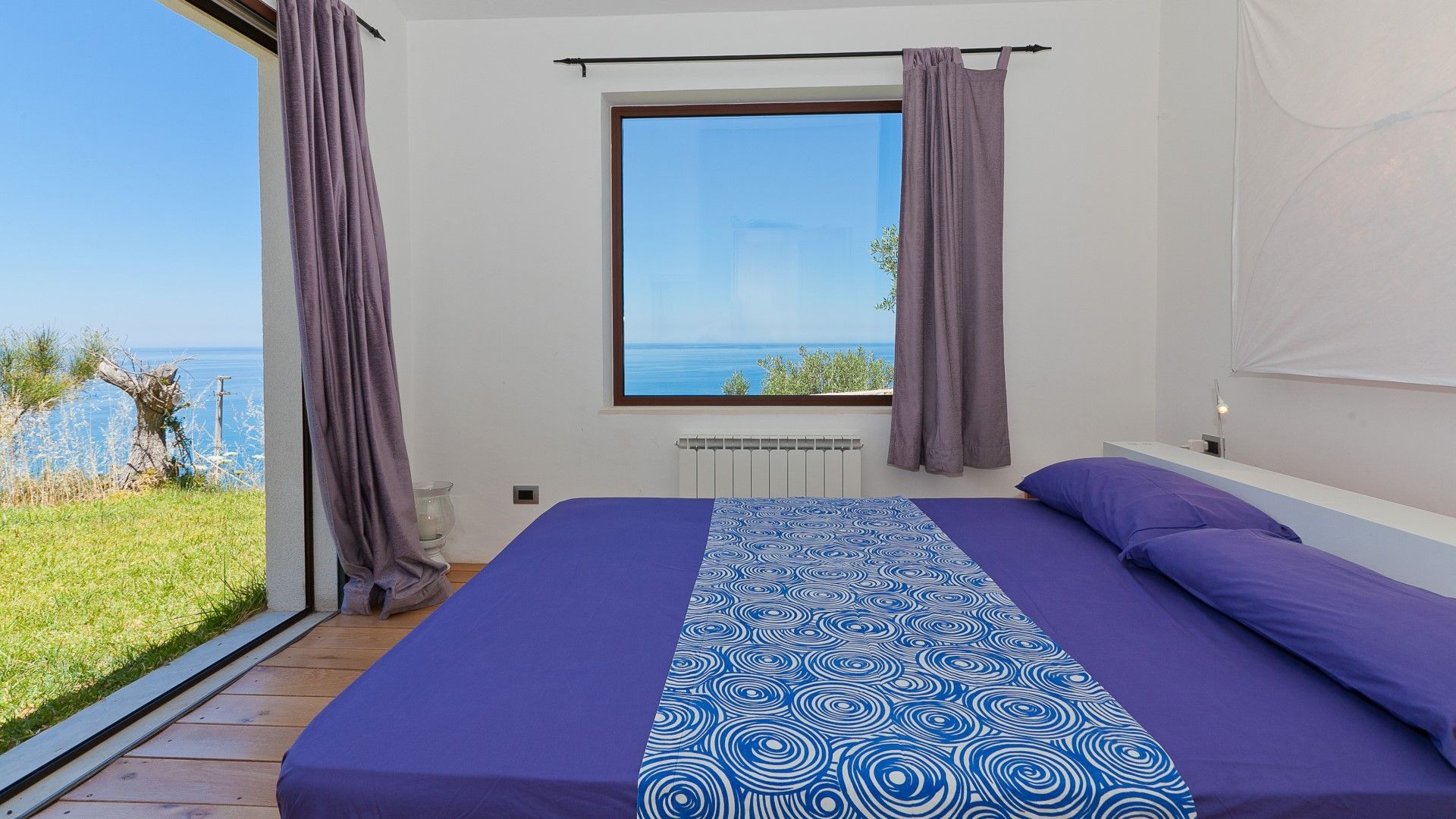 Le salon est un espace ouvert contemporain avec de grands canapés confortables, une cuisine et un coin repas, avec de grandes fenêtres donnant sur la terrasse extérieure et des vues magnifiques. Dans le couloir menant aux chambres se trouve un petit coin bureau. Viennent ensuite les deux salles de bains, une avec baignoire et une avec douche, et les deux chambres. Une avec un lit double et une avec deux lits simples. Les hôtes peuvent profiter de la vue sur la mer depuis leur lit grâce aux fenêtres pleine hauteur des deux chambres.