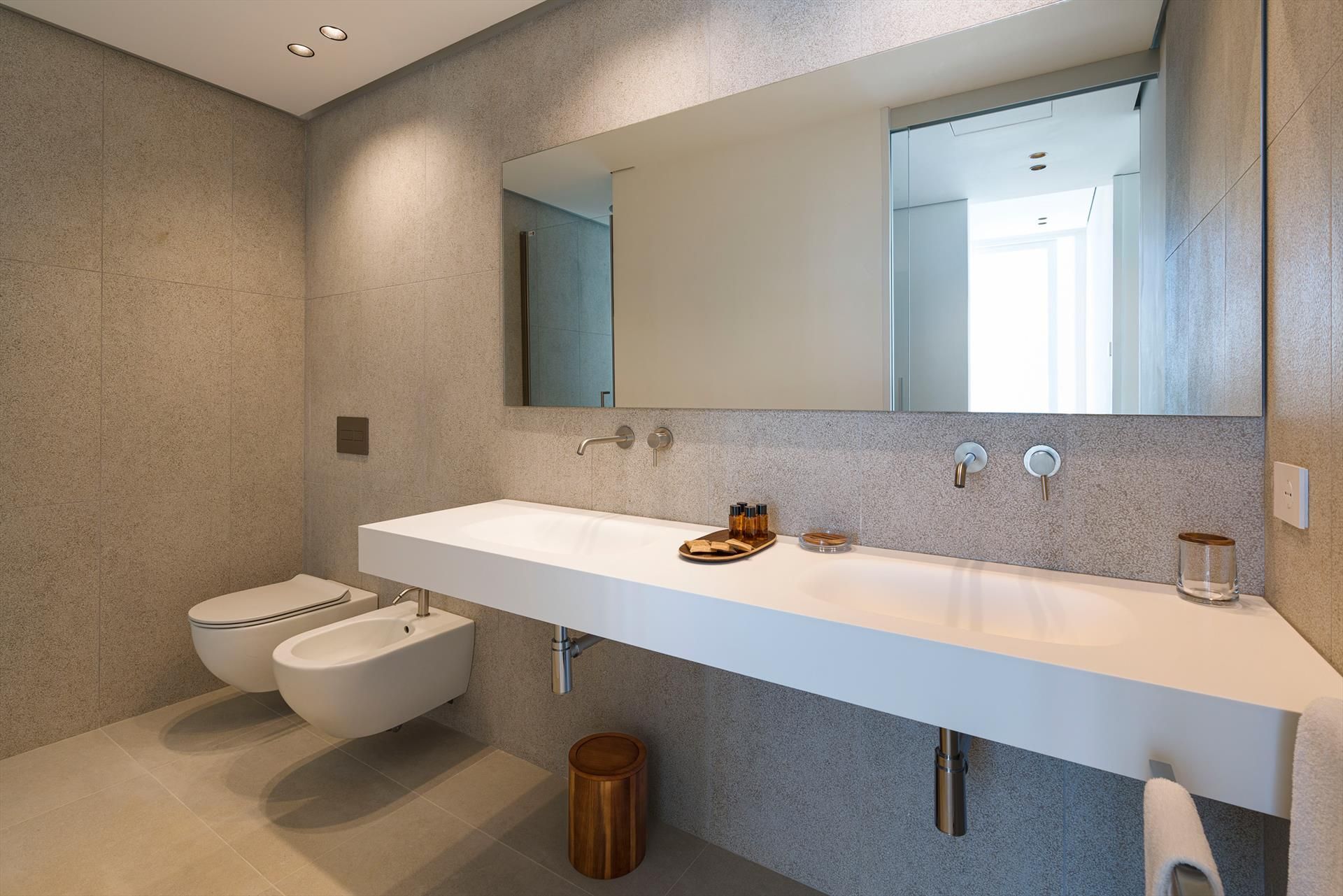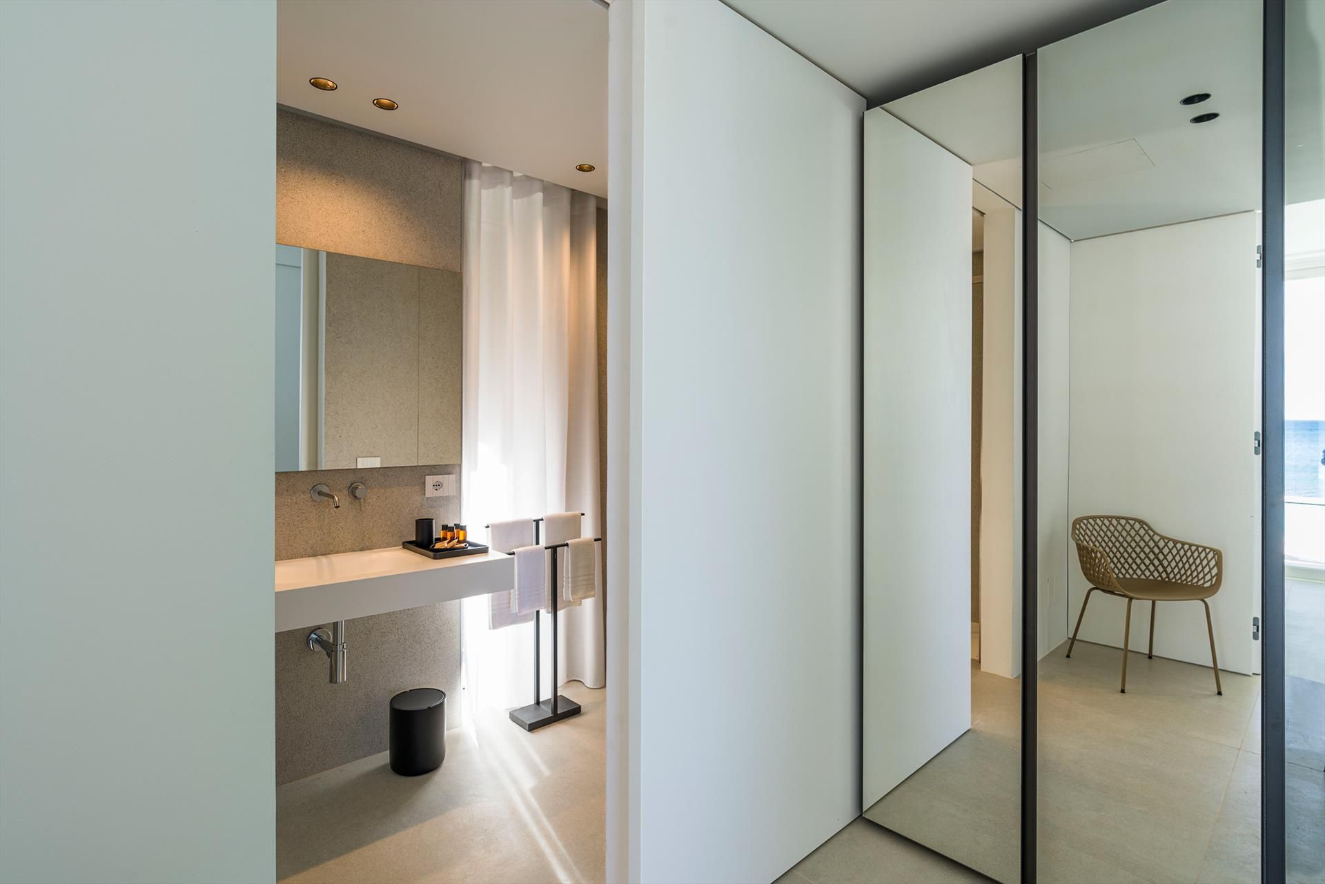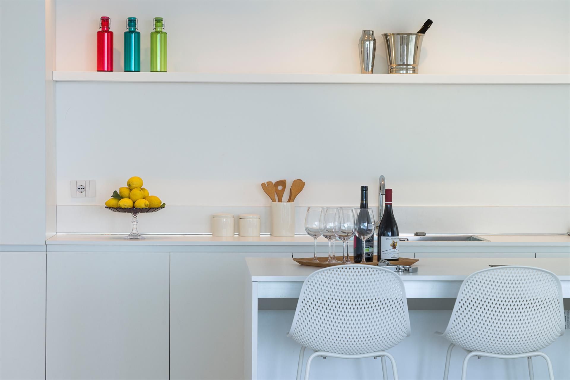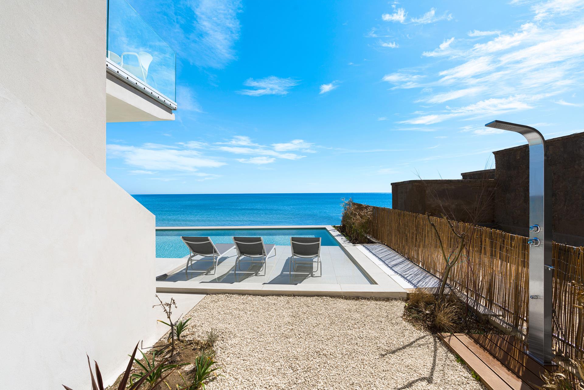 Ses intérieurs confortables, répartis sur deux niveaux, sont dotés de grandes fenêtres panoramiques ouvertes sur la mer et comprennent un grand salon, une cuisine, quatre chambres doubles, chacune dotée d'une salle de bains avec douche, et une terrasse face à la mer.Les équipements sont également de premier ordre : climatisation et chauffage dans toutes les pièces, Internet Wi-Fi, lave-linge-sèche-linge, lave-vaisselle,machine à café Nespresso, four électrique et micro-ondes.