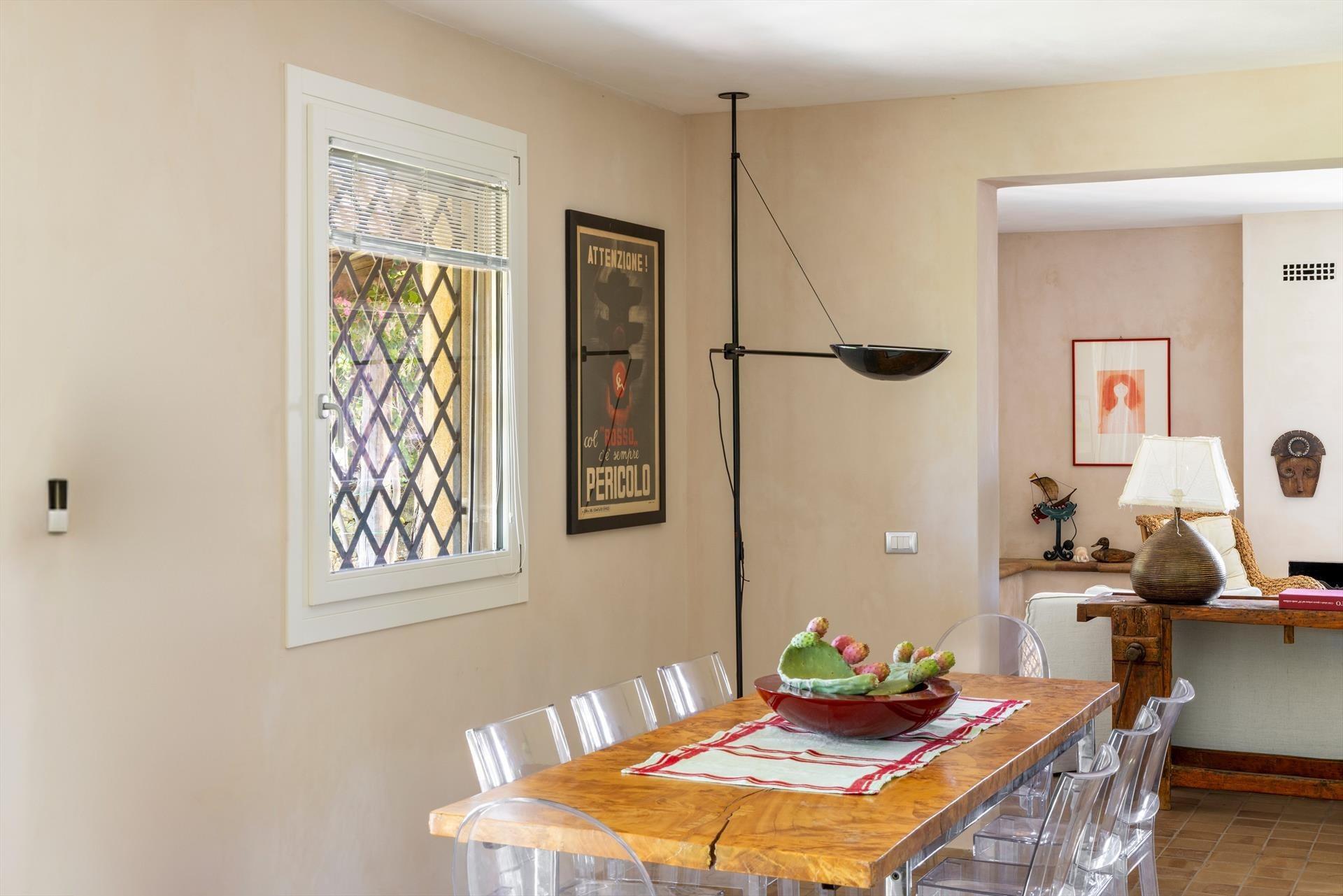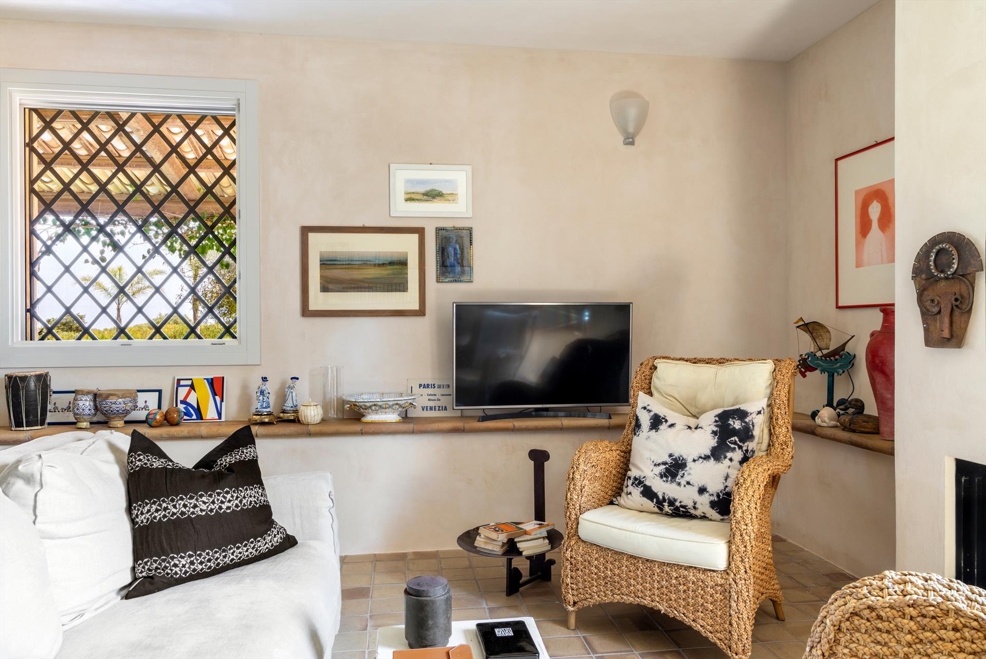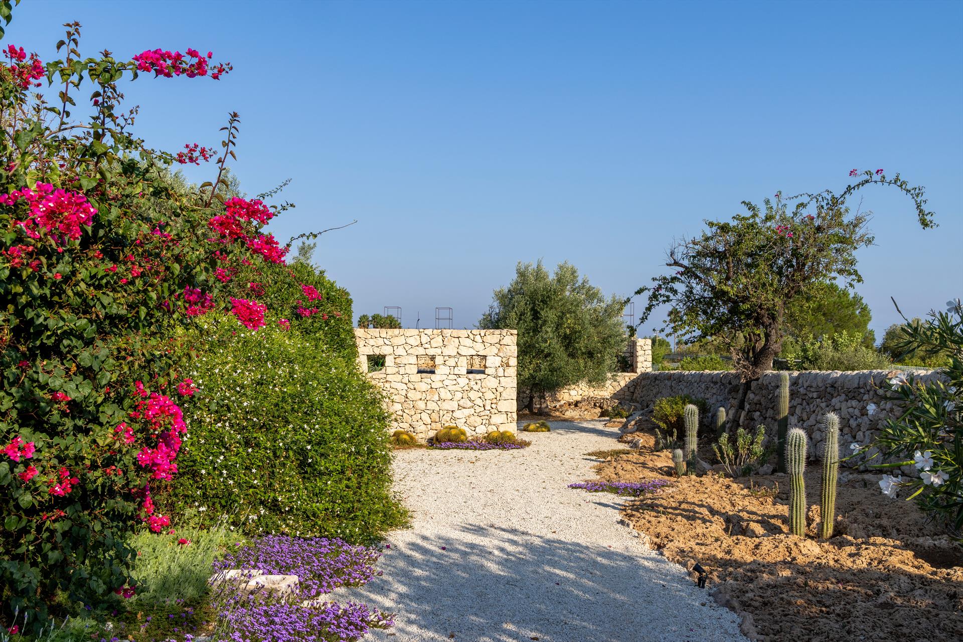 Le vaste jardin méditerranéen, orné de pelouse, d’oliviers et d’arbres fruitiers, conduit à travers un amphithéâtre en pierre jusqu’à la piscine privée (11 x 2 mètres), entourée d’un espace de détente et de bronzage avec douche extérieure supplémentaire.