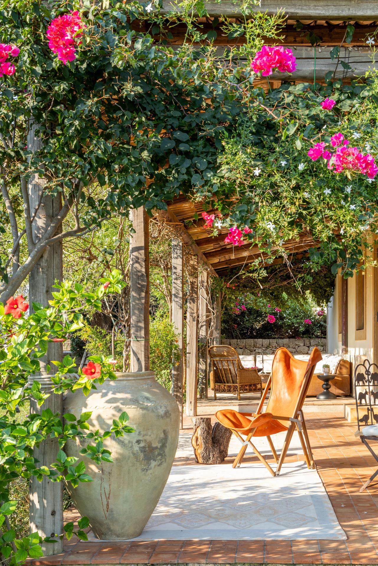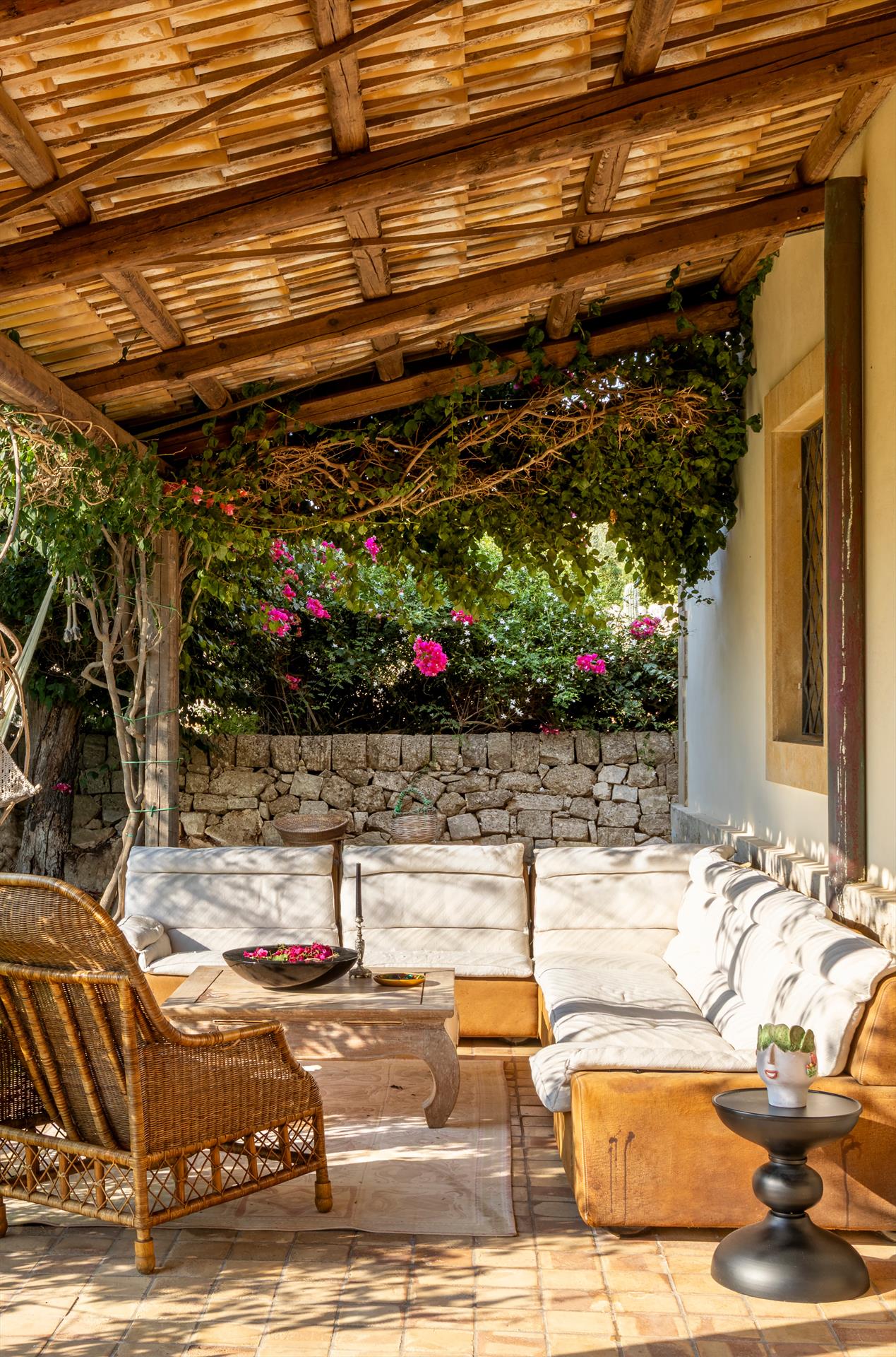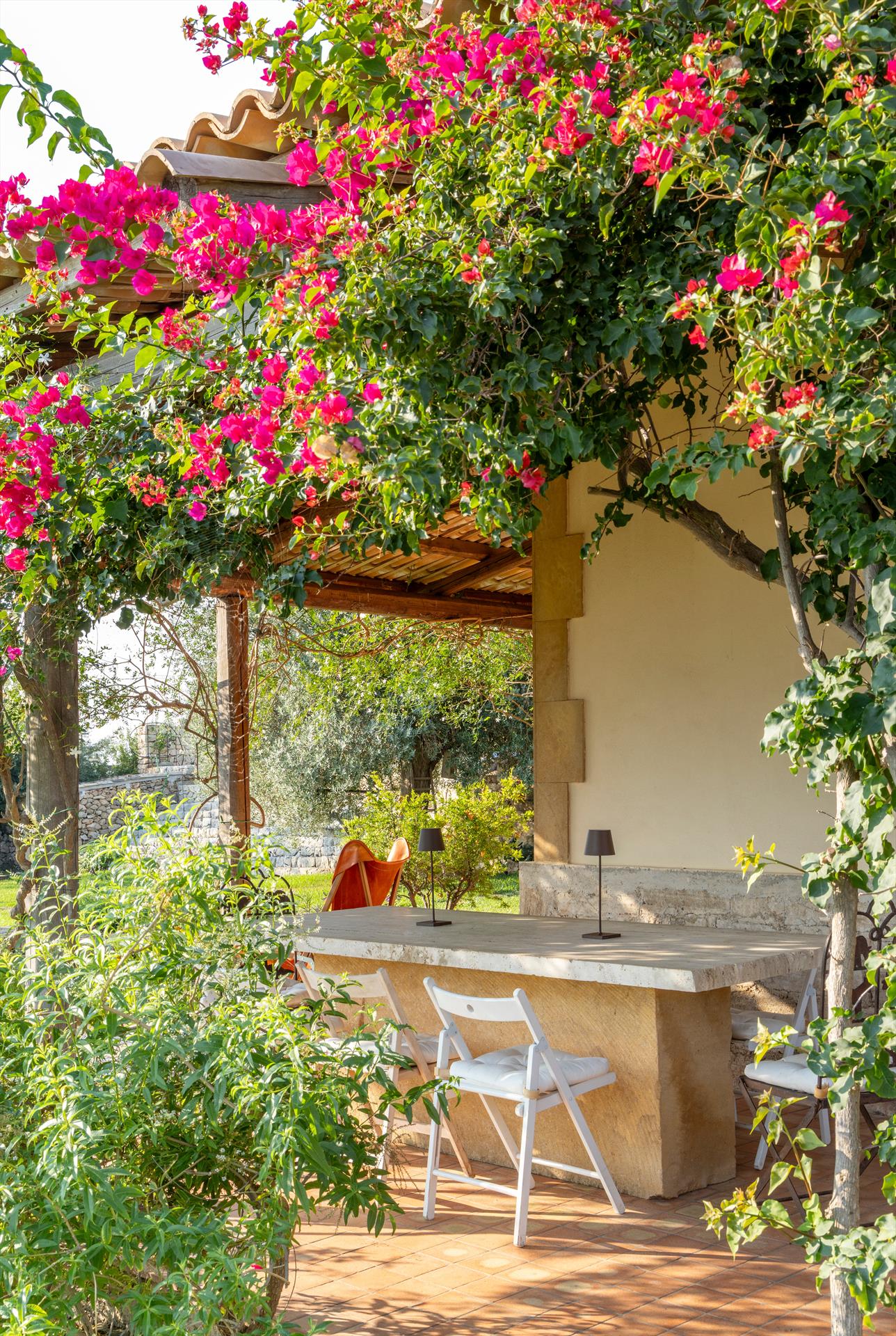 À l’extérieur, une vaste véranda panoramique entourée de jasmins et de bougainvillées est aménagée en salon de plein air raffiné, avec canapés blancs, tapis et grande table en pierre et marbre pour 12 personnes.