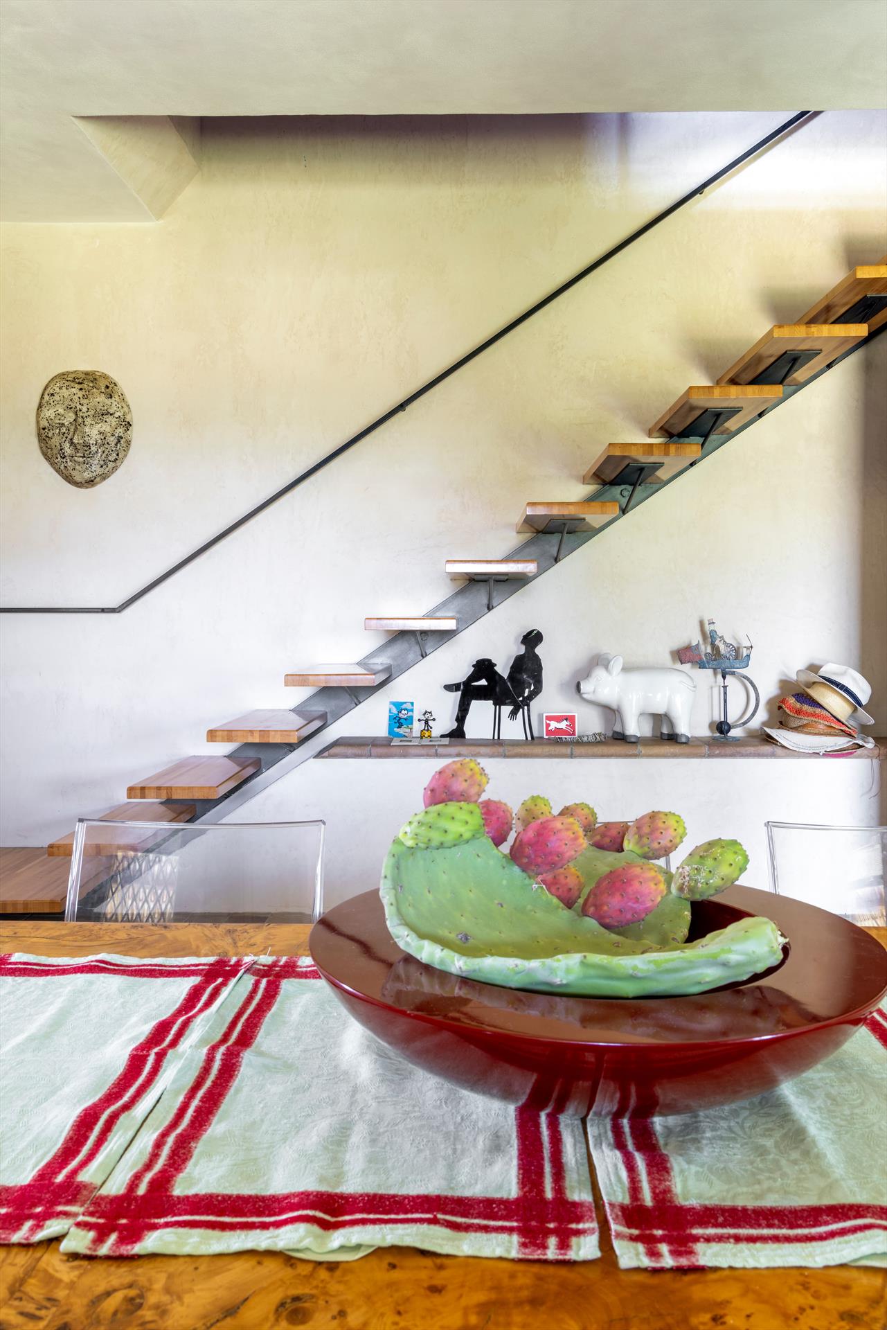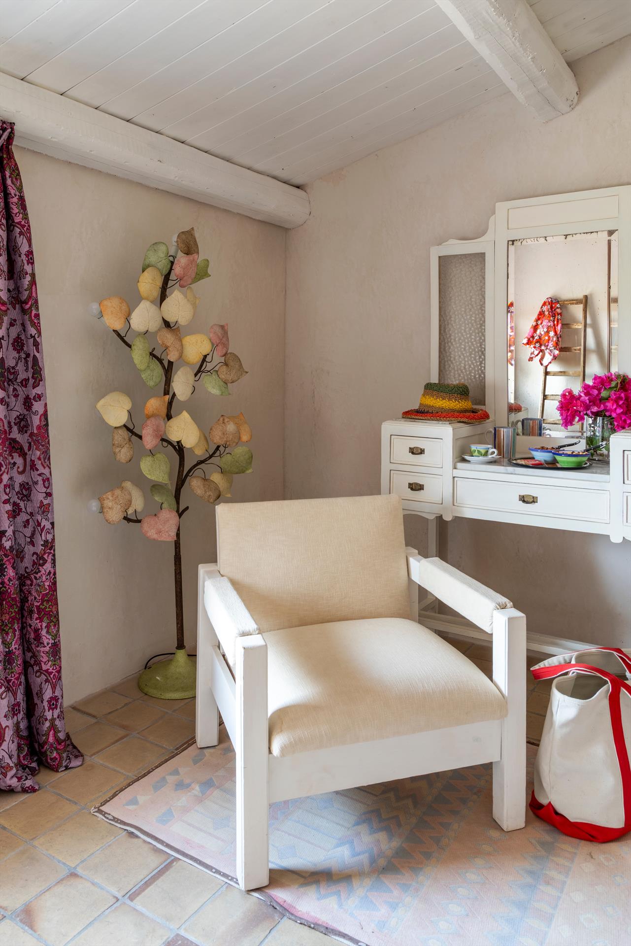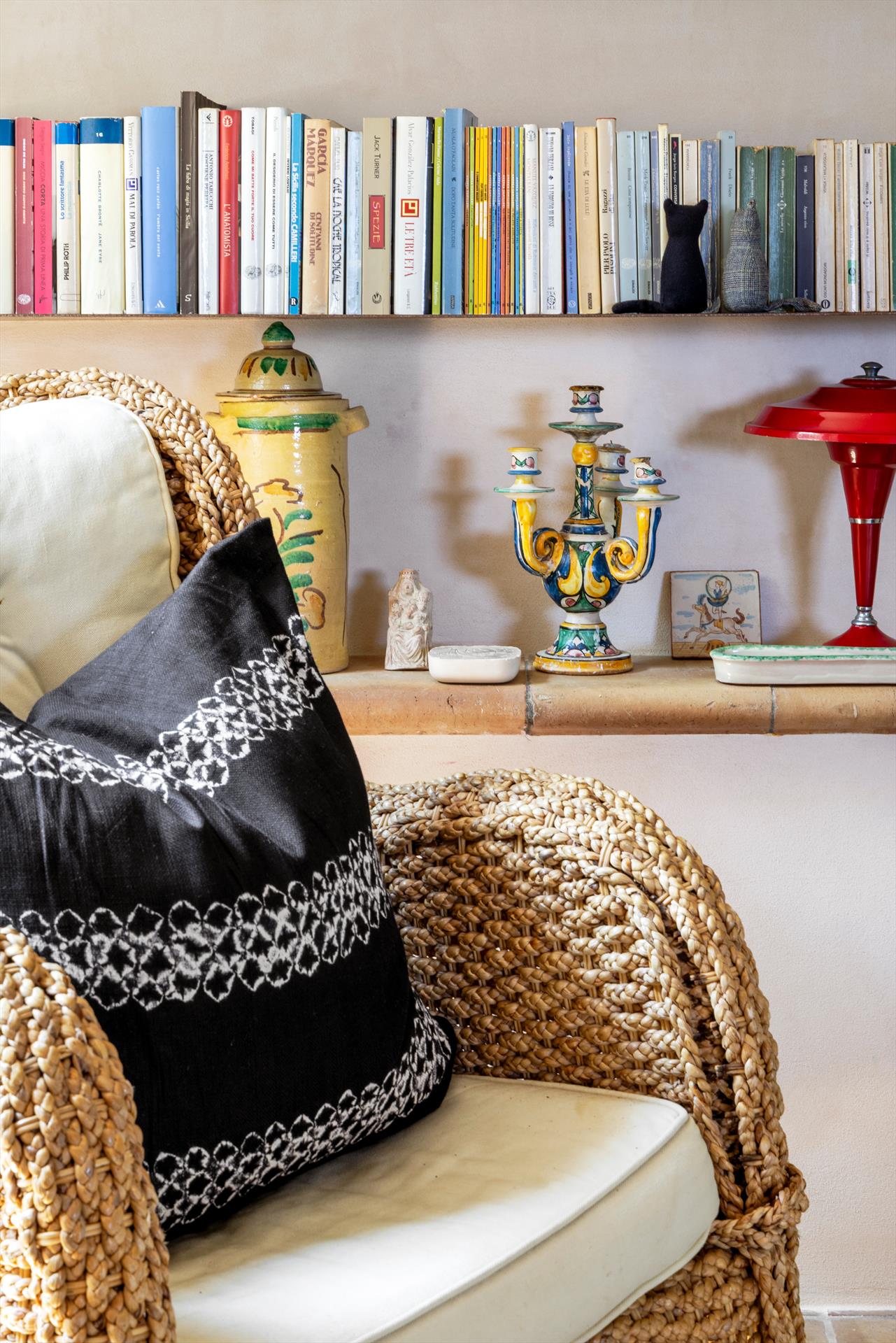 À l’extérieur, une vaste véranda panoramique entourée de jasmins et de bougainvillées est aménagée en salon de plein air raffiné, avec canapés blancs, tapis et grande table en pierre et marbre pour 12 personnes.