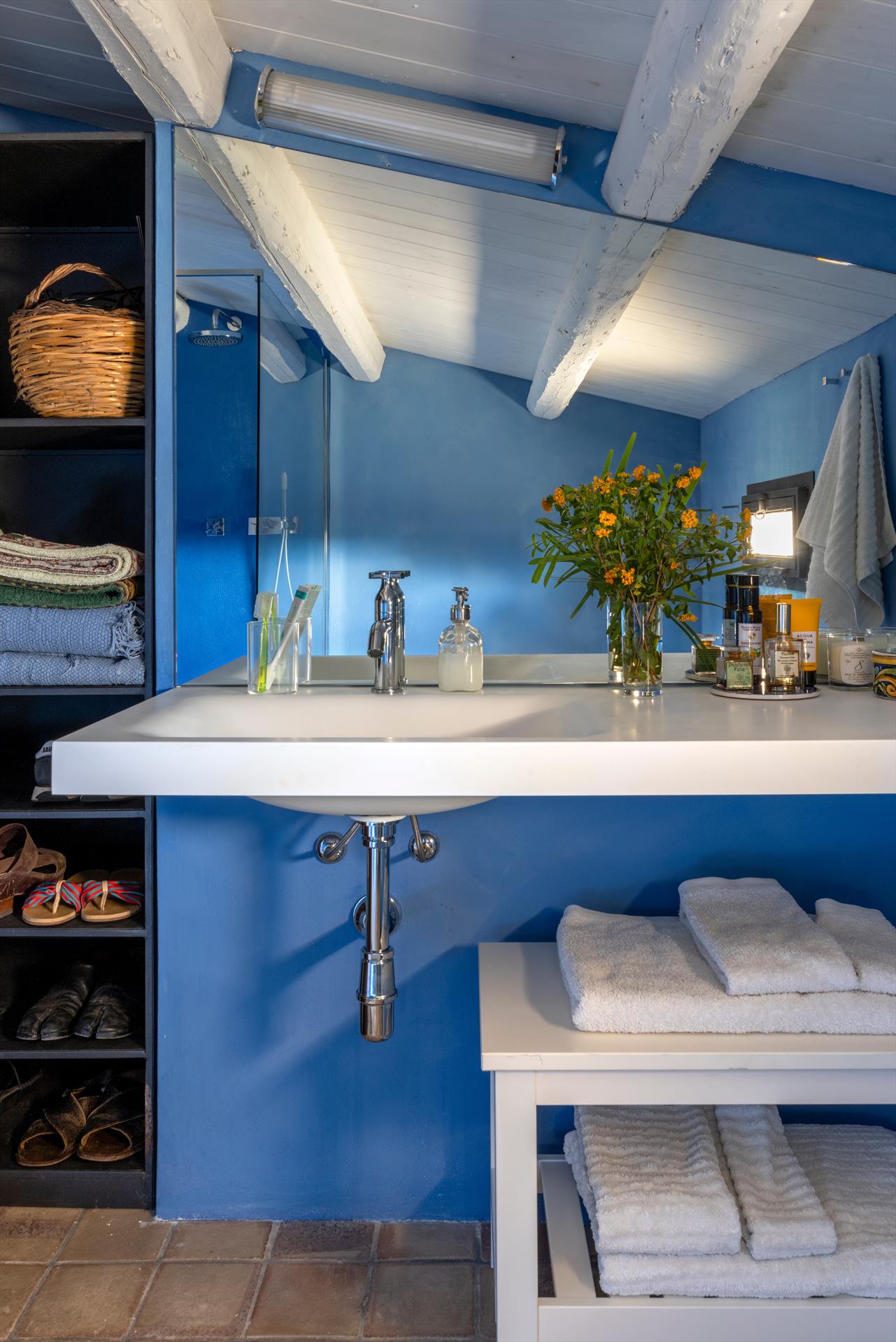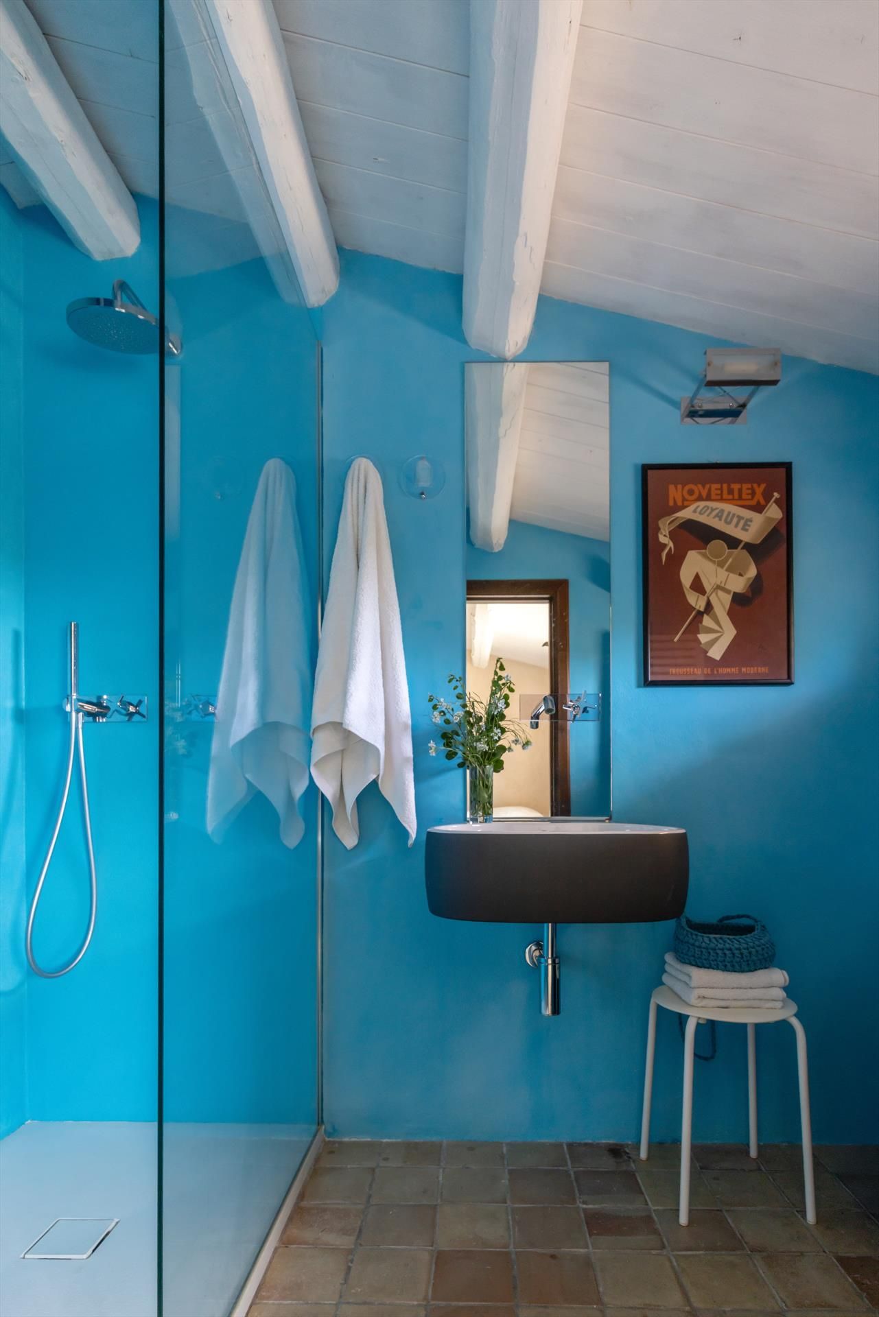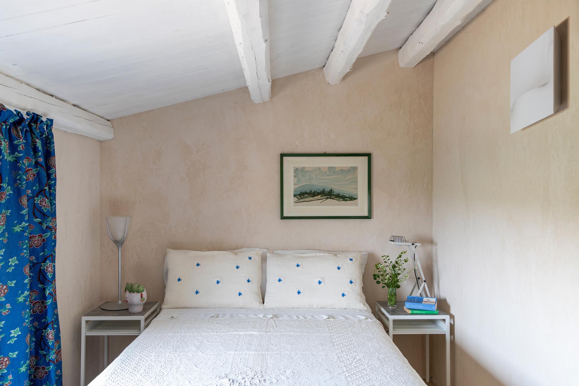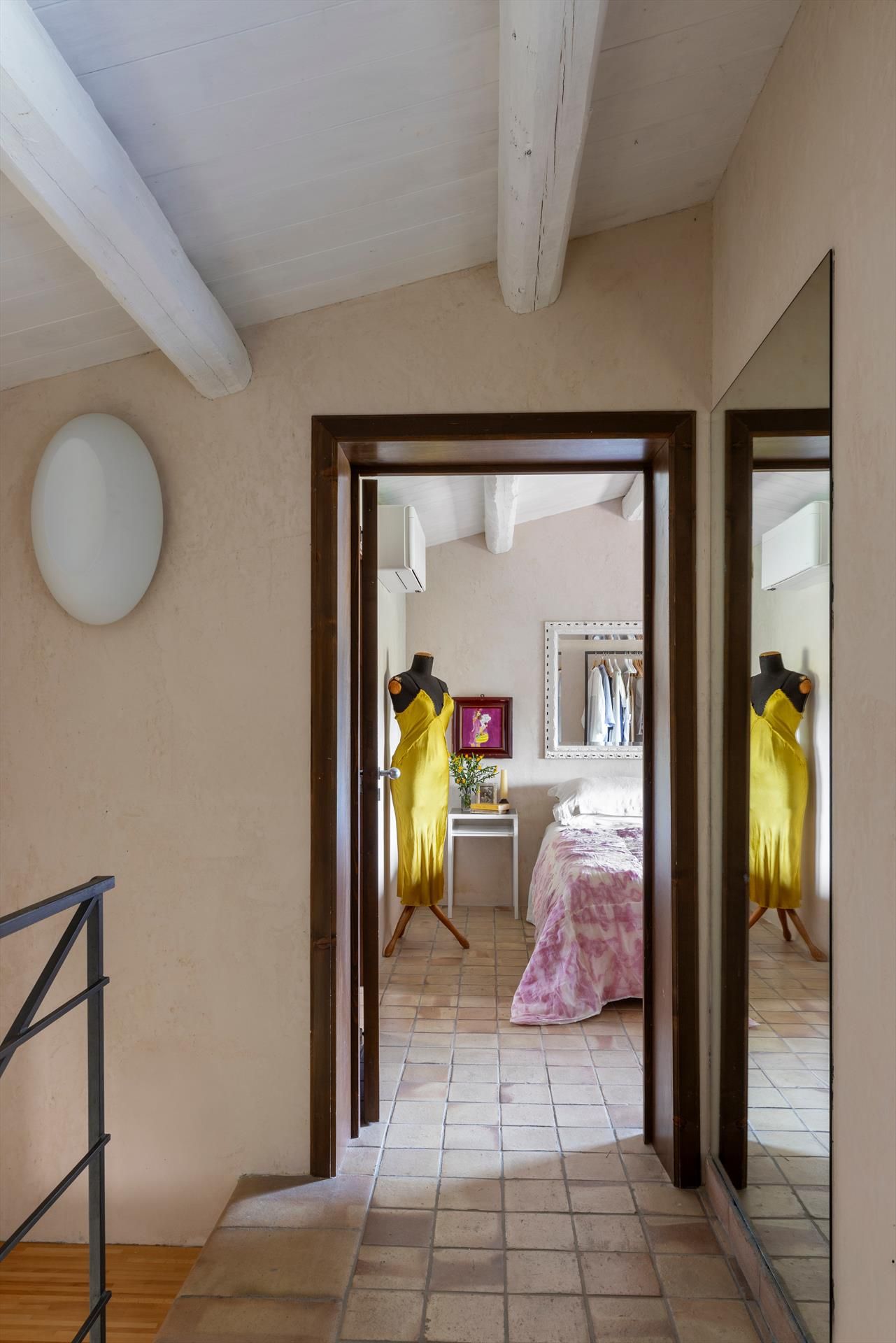 L’étage supérieur accueille l’espace nuit, avec poutres apparentes et trois chambres doubles, chacune dotée de sa salle de bain privée.