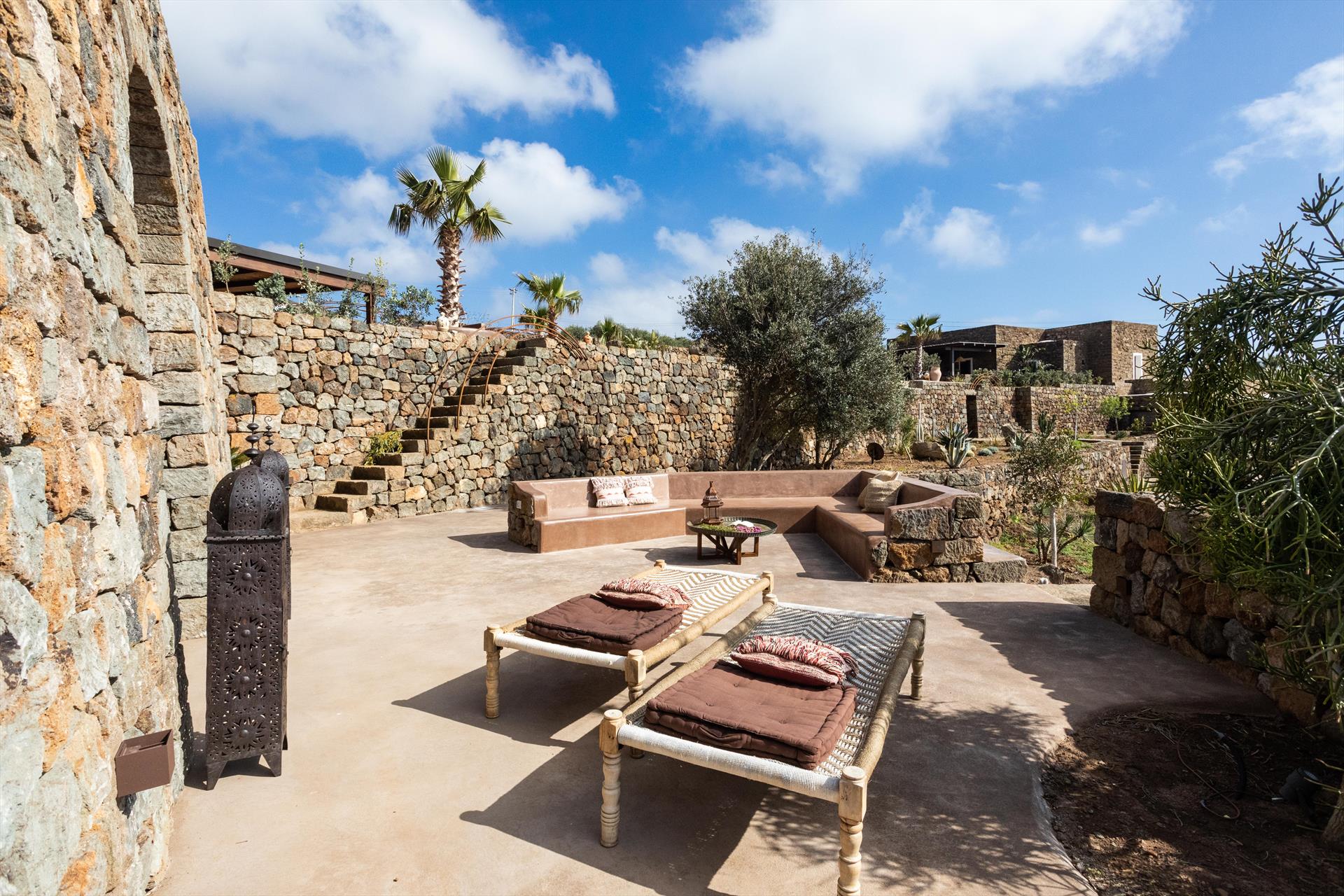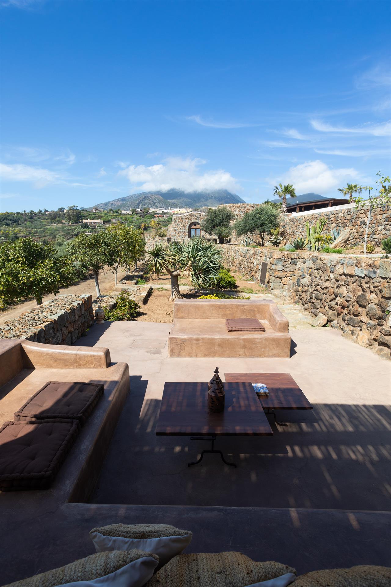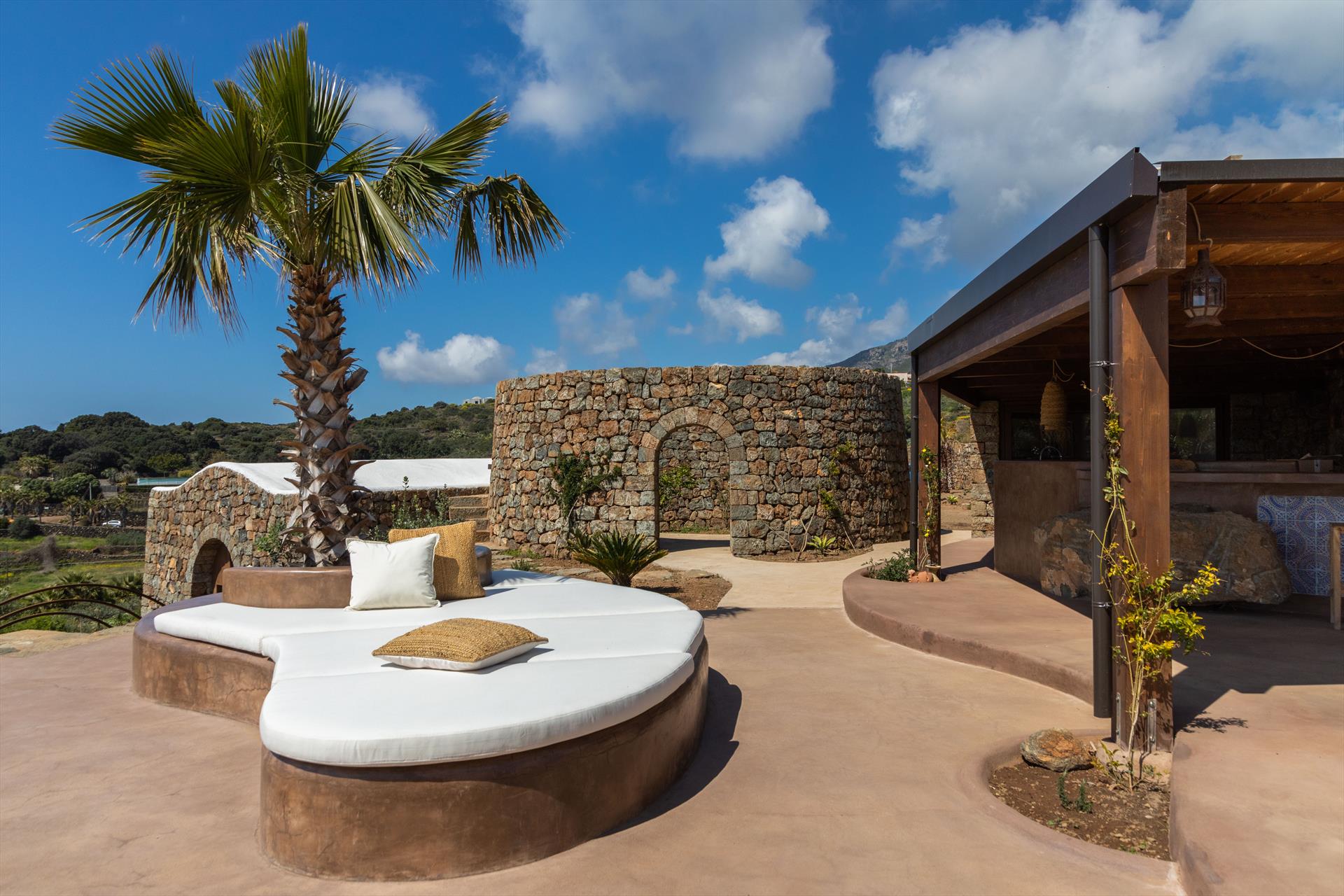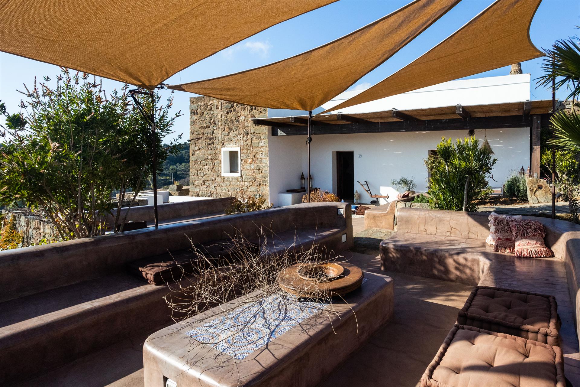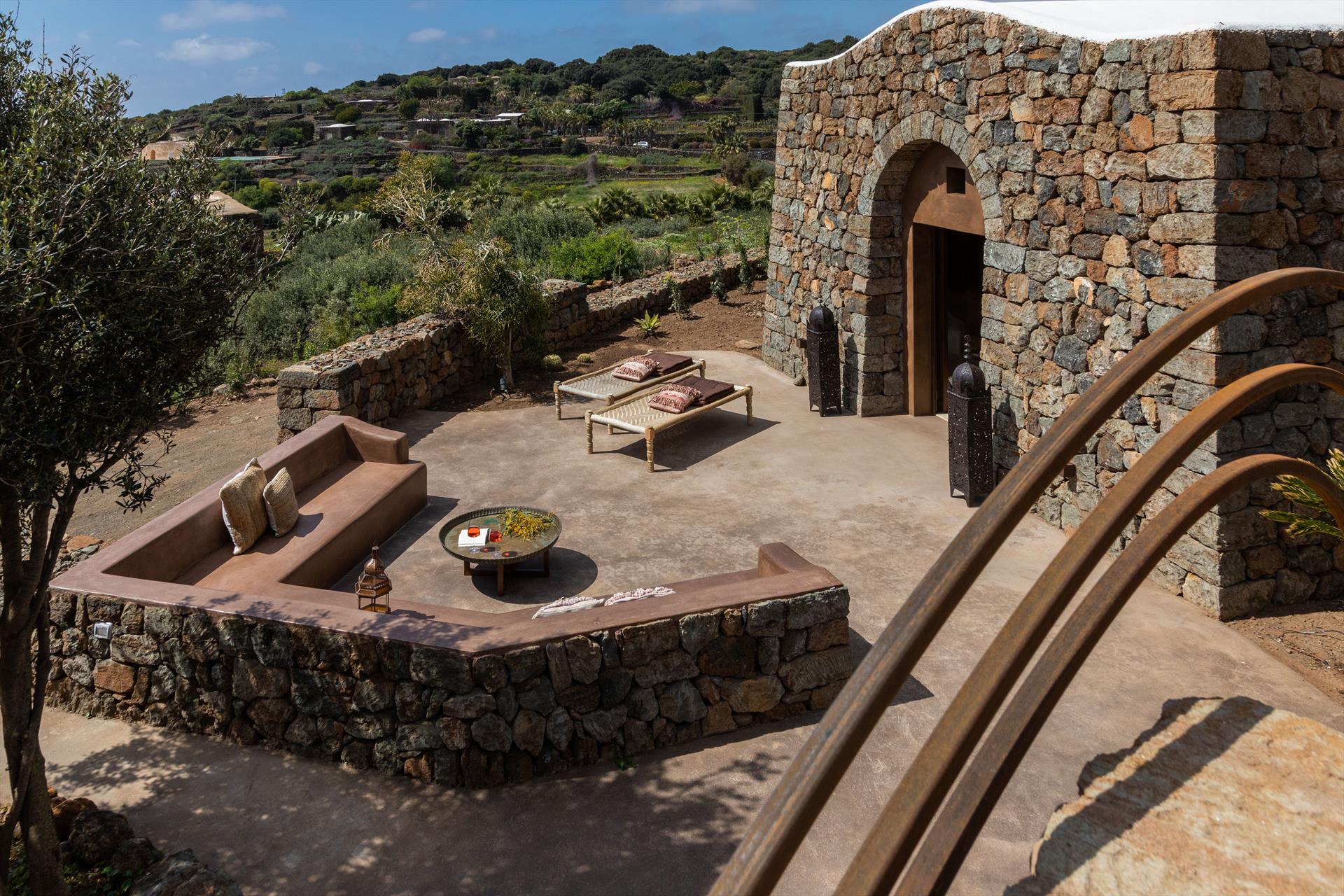 L'élégant domaine Dammusi Almofeem, situé dans le quartier caractéristique de Rekhale, au sud-ouest de l'île, est un coin de paradis où l'on prend soin des moindres détails. Avec sa vue inoubliable qui s'étend de la mer à la Montagna Grande, il vous enchantera avec ses couchers de soleil magiques, ses couleurs uniques et le calme d'une nature intacte, vous permettant de vivre pleinement le charme particulier de l'atmosphère de l'île. Entourée d'un jardin méditerranéen, cette maison de campagne typique de Pantelleria peut accueillir jusqu'à 8 personnes. Elle se compose de trois "dammusi" indépendants qui partagent les mêmes installations et les mêmes grands espaces extérieurs : une piscine à débordement entourée d'une terrasse ensoleillée, une grande cuisine extérieure bien équipée (avec terrasse), des espaces confortables pour se détendre avec des coussins et des canapés en maçonnerie, ainsi qu'une table à manger spacieuse : l'endroit idéal pour les petits groupes. Le style de l'intérieur est raffiné et accueillant, mêlant des lignes modernes à des accessoires artisanaux typiquement siciliens. La Balata dei Turchi, Martingana, Nikà, Scauri et la grotte de Sataria sont facilement accessibles depuis le gîte rural et, à proximité immédiate, se trouvent les villages de Rekhale et Scauri, où vous trouverez toutes les commodités, les services, les magasins, les restaurants et bien plus encore.