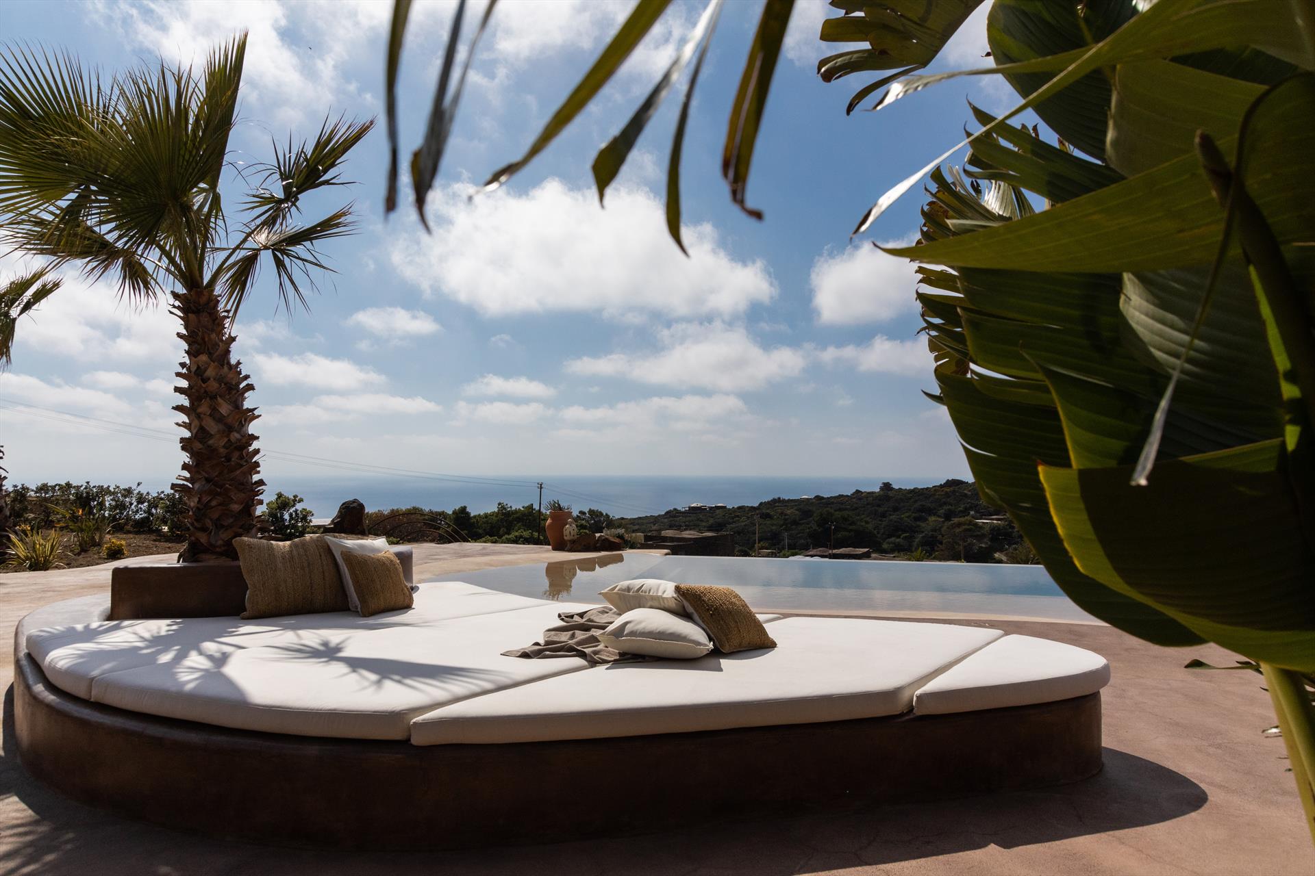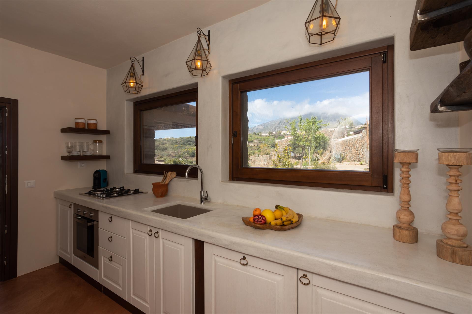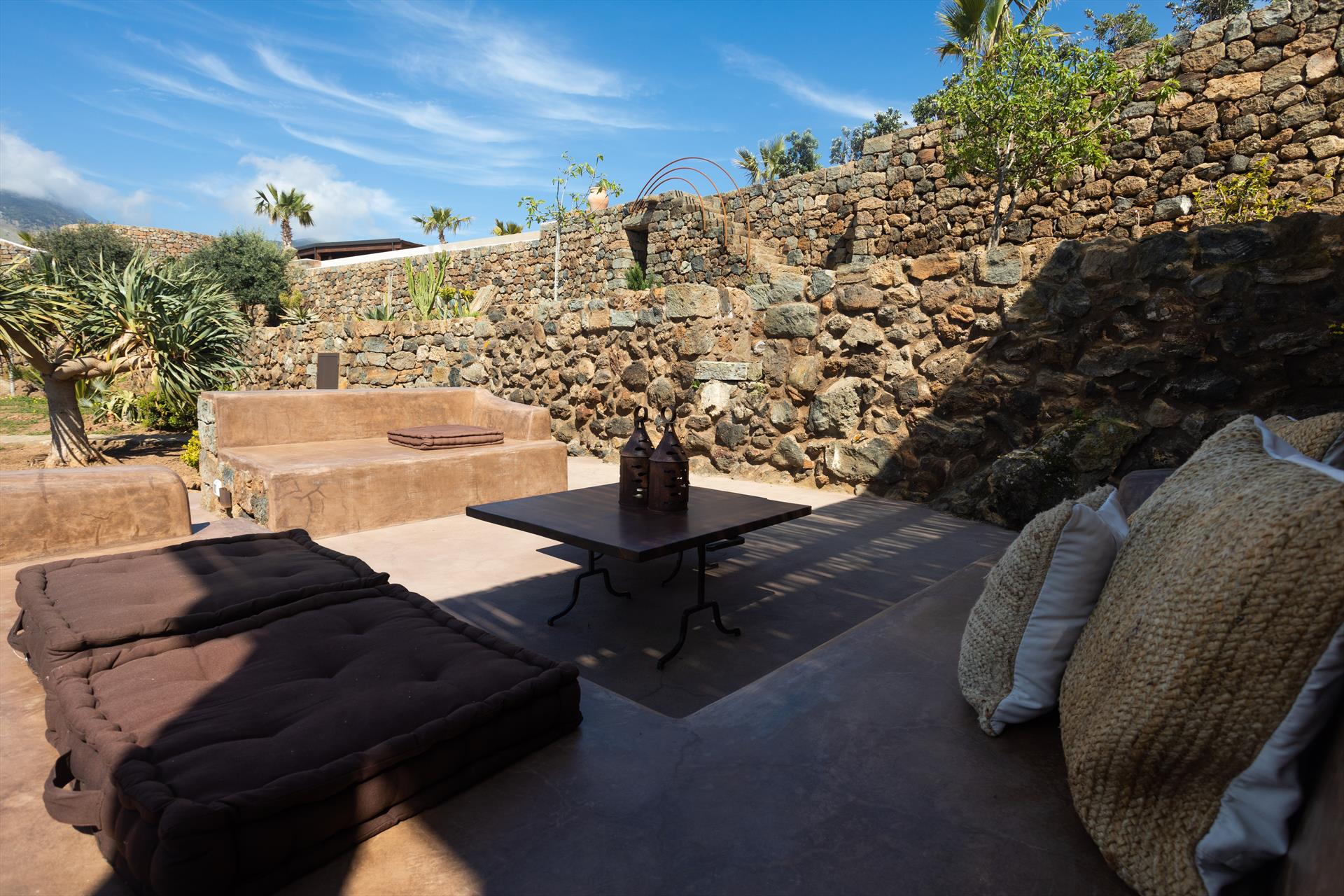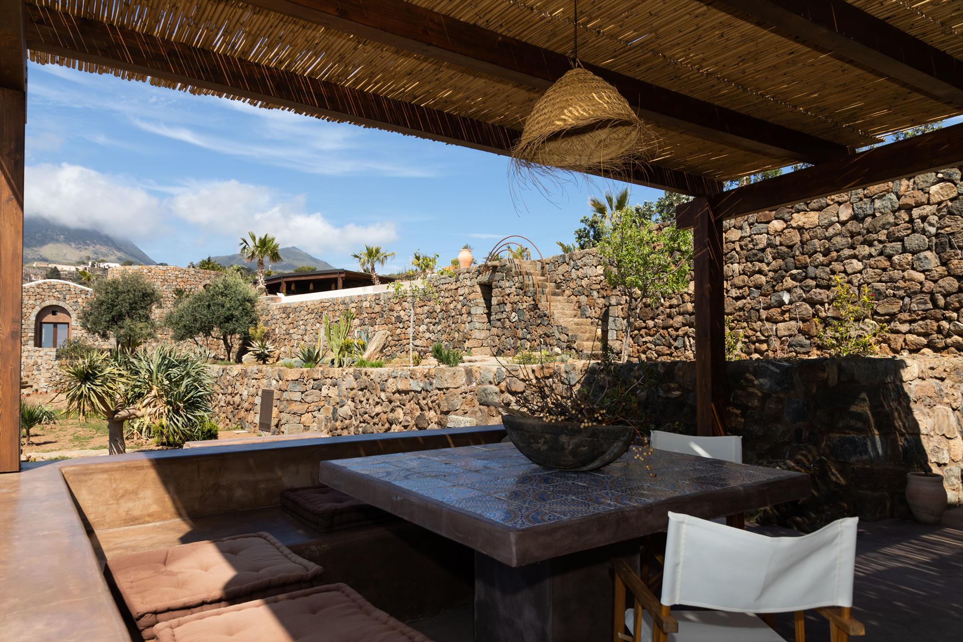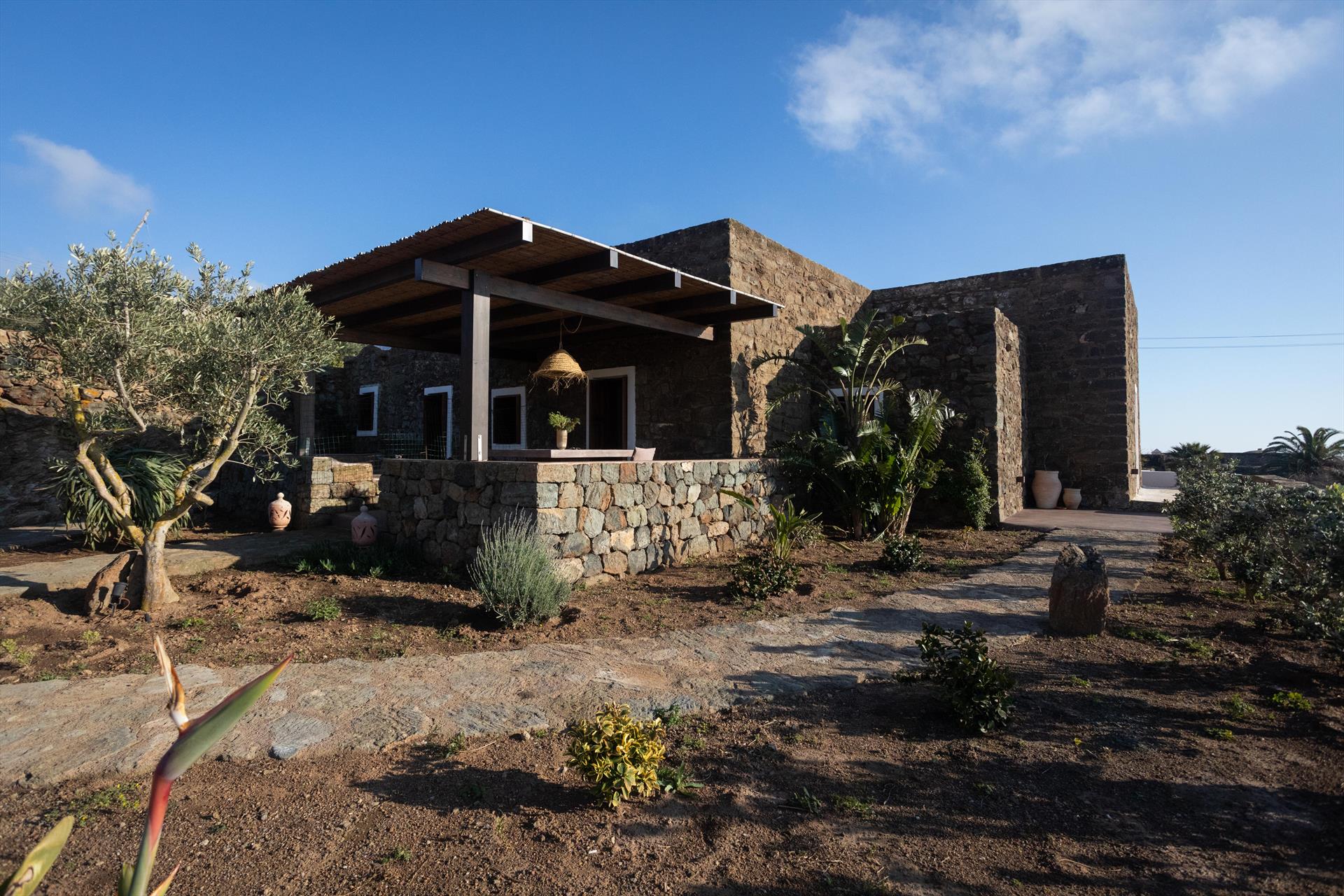 L'élégant domaine Dammusi Almofeem, situé dans le quartier caractéristique de Rekhale, au sud-ouest de l'île, est un coin de paradis où l'on prend soin des moindres détails. Avec sa vue inoubliable qui s'étend de la mer à la Montagna Grande, il vous enchantera avec ses couchers de soleil magiques, ses couleurs uniques et le calme d'une nature intacte, vous permettant de vivre pleinement le charme particulier de l'atmosphère de l'île. Entourée d'un jardin méditerranéen, cette maison de campagne typique de Pantelleria peut accueillir jusqu'à 8 personnes. Elle se compose de trois "dammusi" indépendants qui partagent les mêmes installations et les mêmes grands espaces extérieurs : une piscine à débordement entourée d'une terrasse ensoleillée, une grande cuisine extérieure bien équipée (avec terrasse), des espaces confortables pour se détendre avec des coussins et des canapés en maçonnerie, ainsi qu'une table à manger spacieuse : l'endroit idéal pour les petits groupes. Le style de l'intérieur est raffiné et accueillant, mêlant des lignes modernes à des accessoires artisanaux typiquement siciliens. La Balata dei Turchi, Martingana, Nikà, Scauri et la grotte de Sataria sont facilement accessibles depuis le gîte rural et, à proximité immédiate, se trouvent les villages de Rekhale et Scauri, où vous trouverez toutes les commodités, les services, les magasins, les restaurants et bien plus encore.