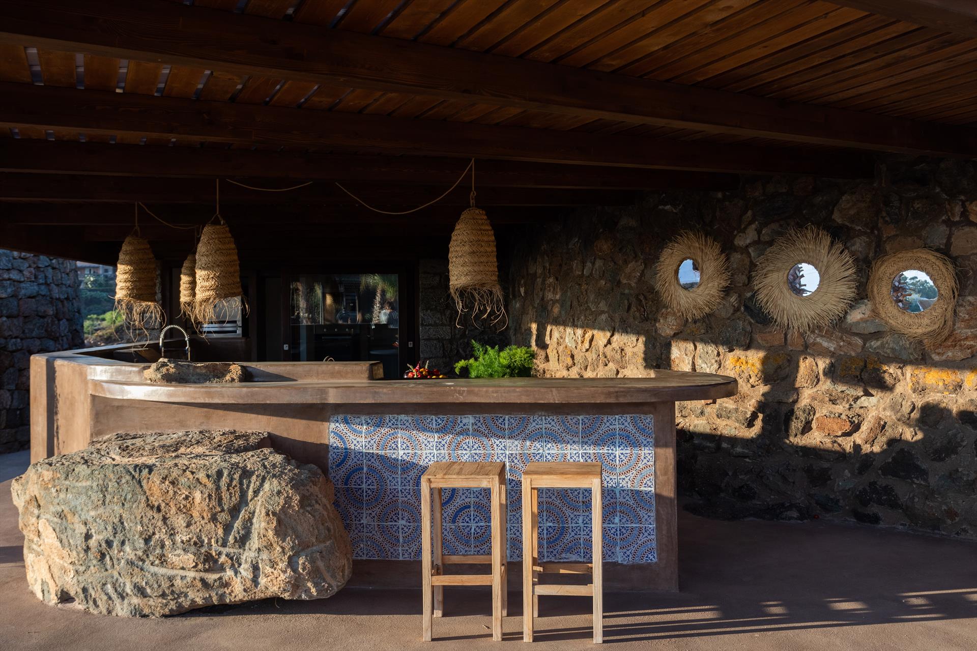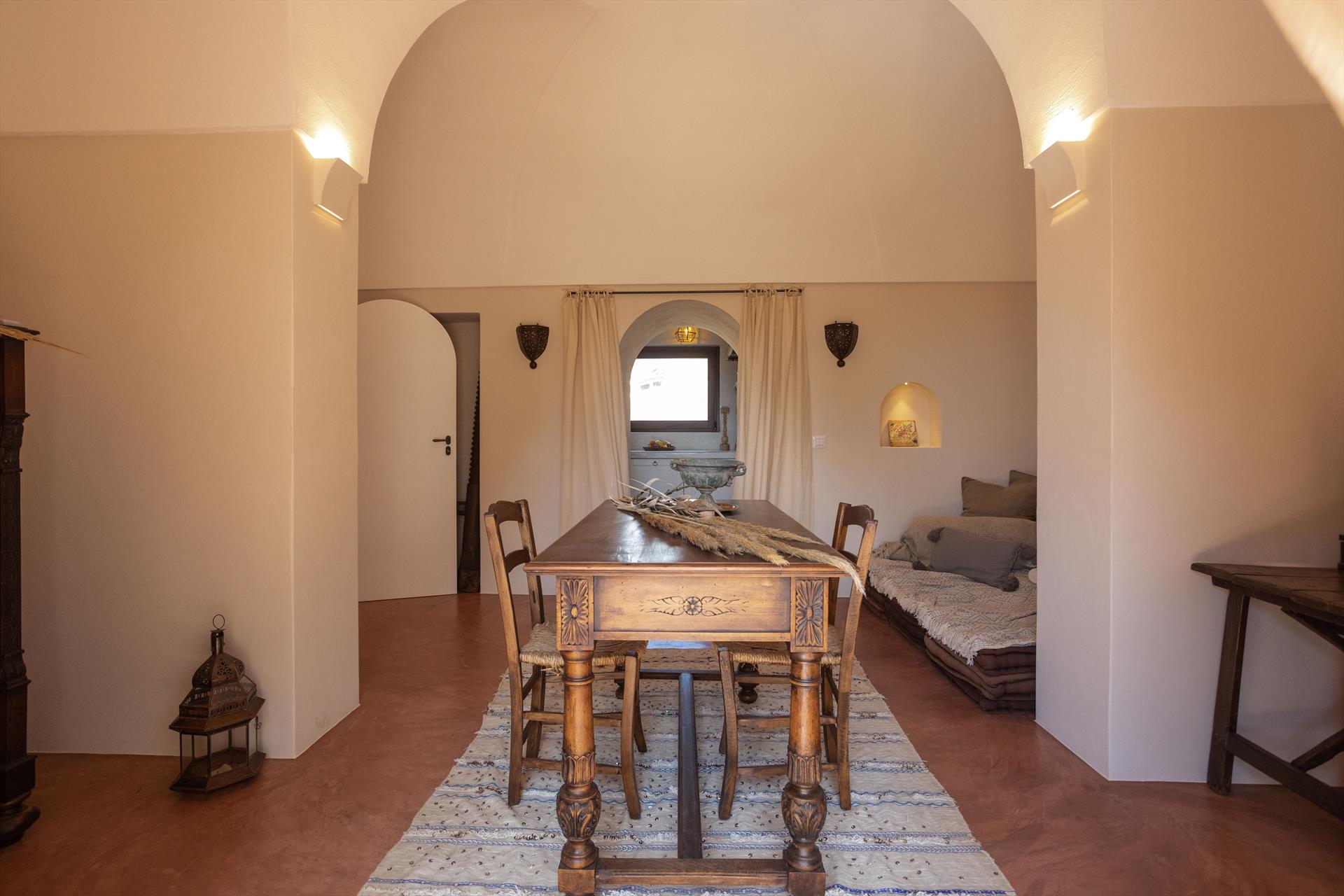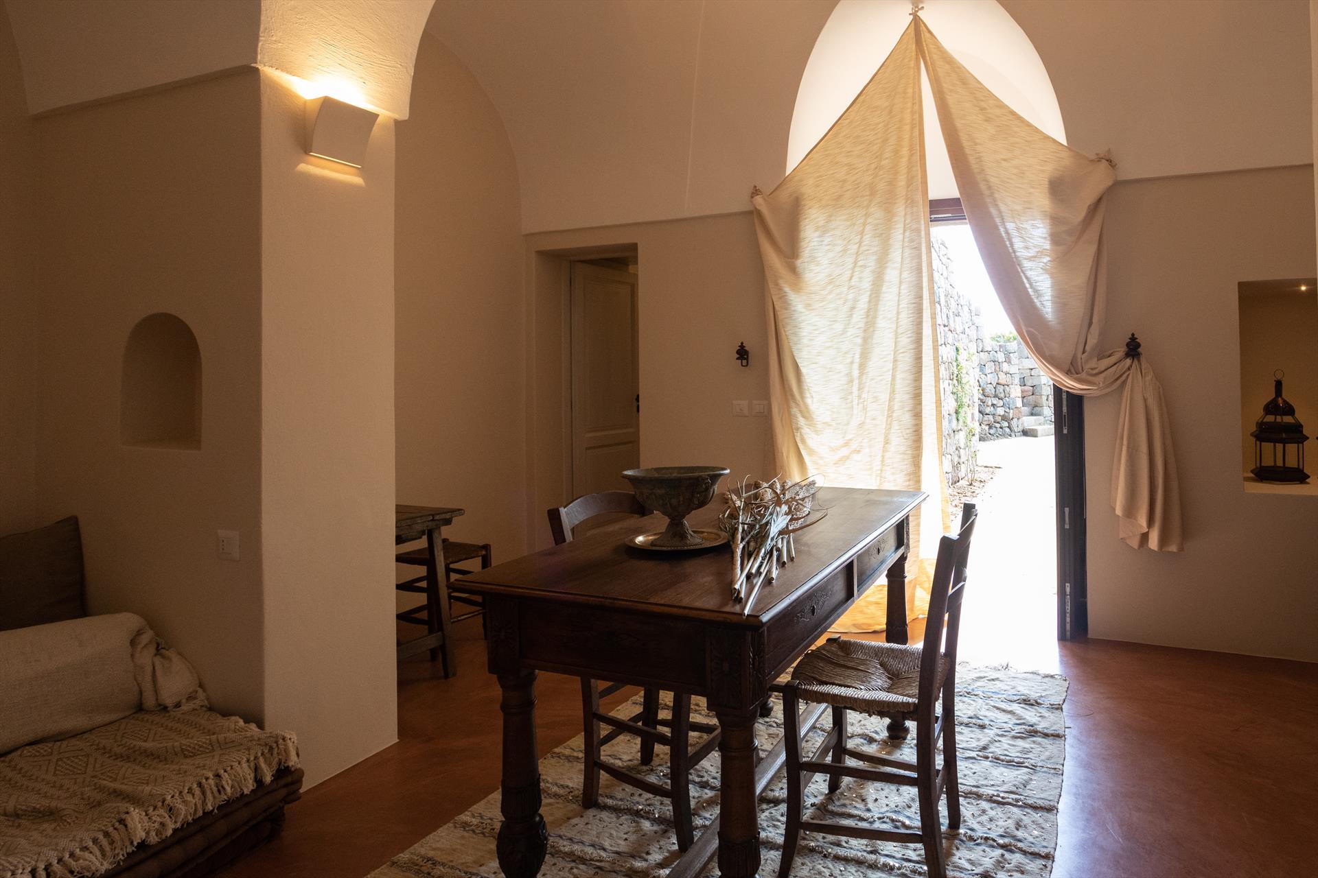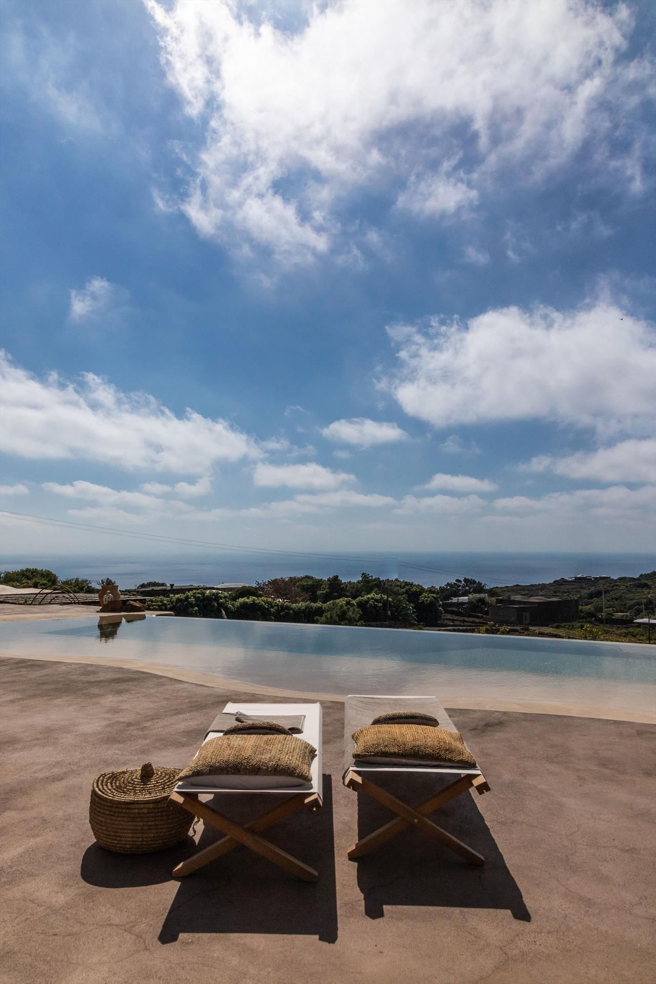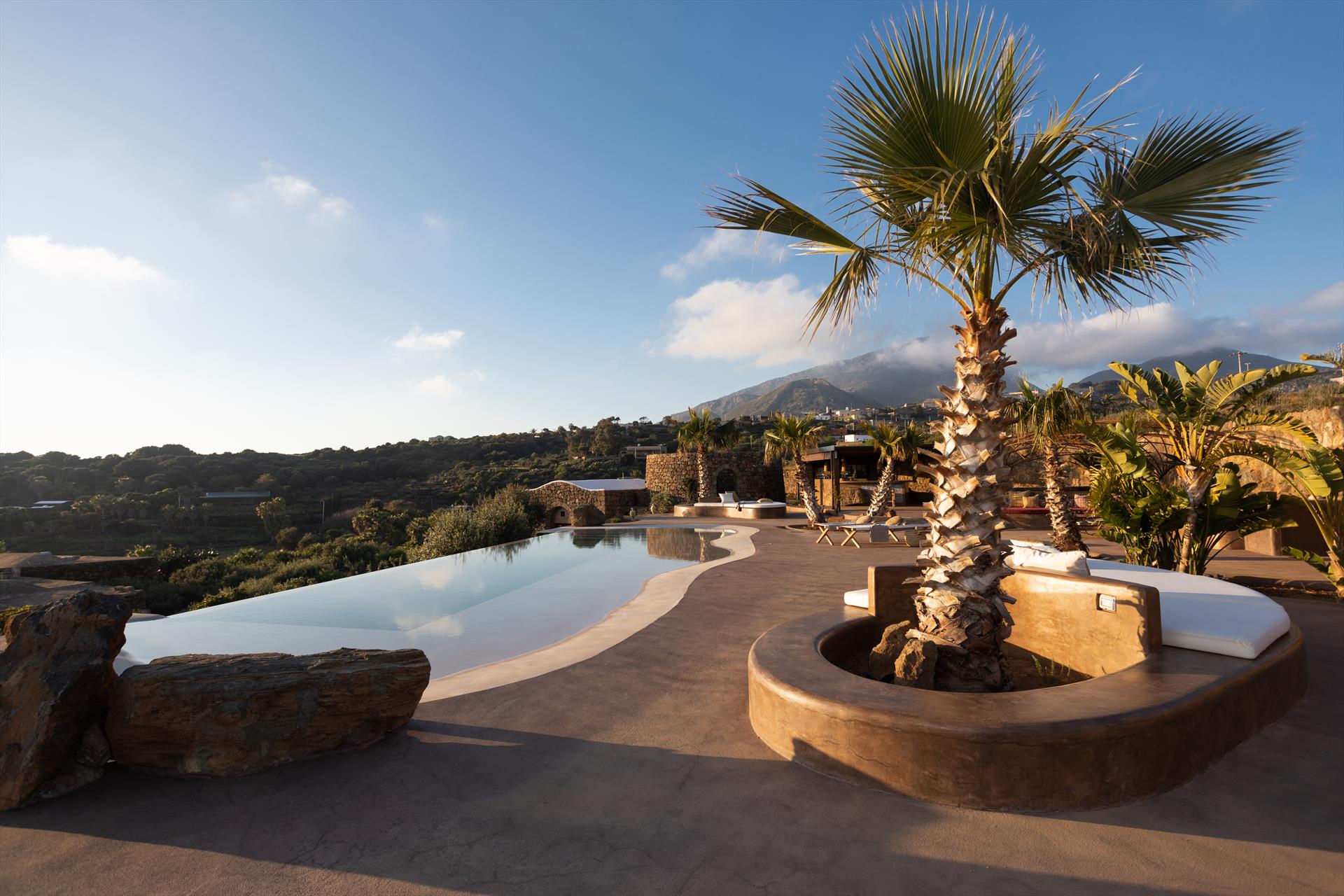 L'élégant domaine Dammusi Almofeem, situé dans le quartier caractéristique de Rekhale, au sud-ouest de l'île, est un coin de paradis où l'on prend soin des moindres détails. Avec sa vue inoubliable qui s'étend de la mer à la Montagna Grande, il vous enchantera avec ses couchers de soleil magiques, ses couleurs uniques et le calme d'une nature intacte, vous permettant de vivre pleinement le charme particulier de l'atmosphère de l'île. Entourée d'un jardin méditerranéen, cette maison de campagne typique de Pantelleria peut accueillir jusqu'à 8 personnes. Elle se compose de trois "dammusi" indépendants qui partagent les mêmes installations et les mêmes grands espaces extérieurs : une piscine à débordement entourée d'une terrasse ensoleillée, une grande cuisine extérieure bien équipée (avec terrasse), des espaces confortables pour se détendre avec des coussins et des canapés en maçonnerie, ainsi qu'une table à manger spacieuse : l'endroit idéal pour les petits groupes. Le style de l'intérieur est raffiné et accueillant, mêlant des lignes modernes à des accessoires artisanaux typiquement siciliens. La Balata dei Turchi, Martingana, Nikà, Scauri et la grotte de Sataria sont facilement accessibles depuis le gîte rural et, à proximité immédiate, se trouvent les villages de Rekhale et Scauri, où vous trouverez toutes les commodités, les services, les magasins, les restaurants et bien plus encore.