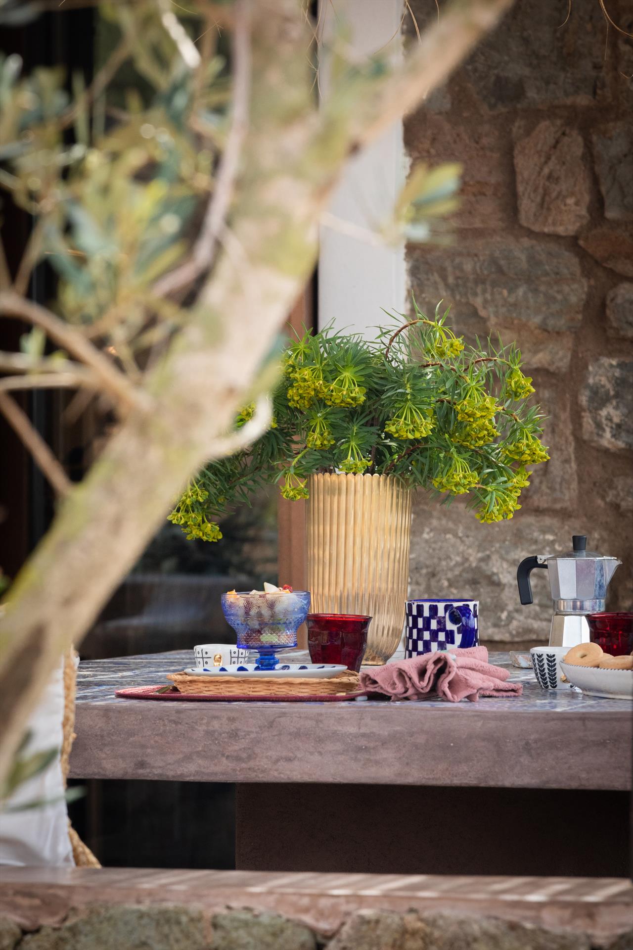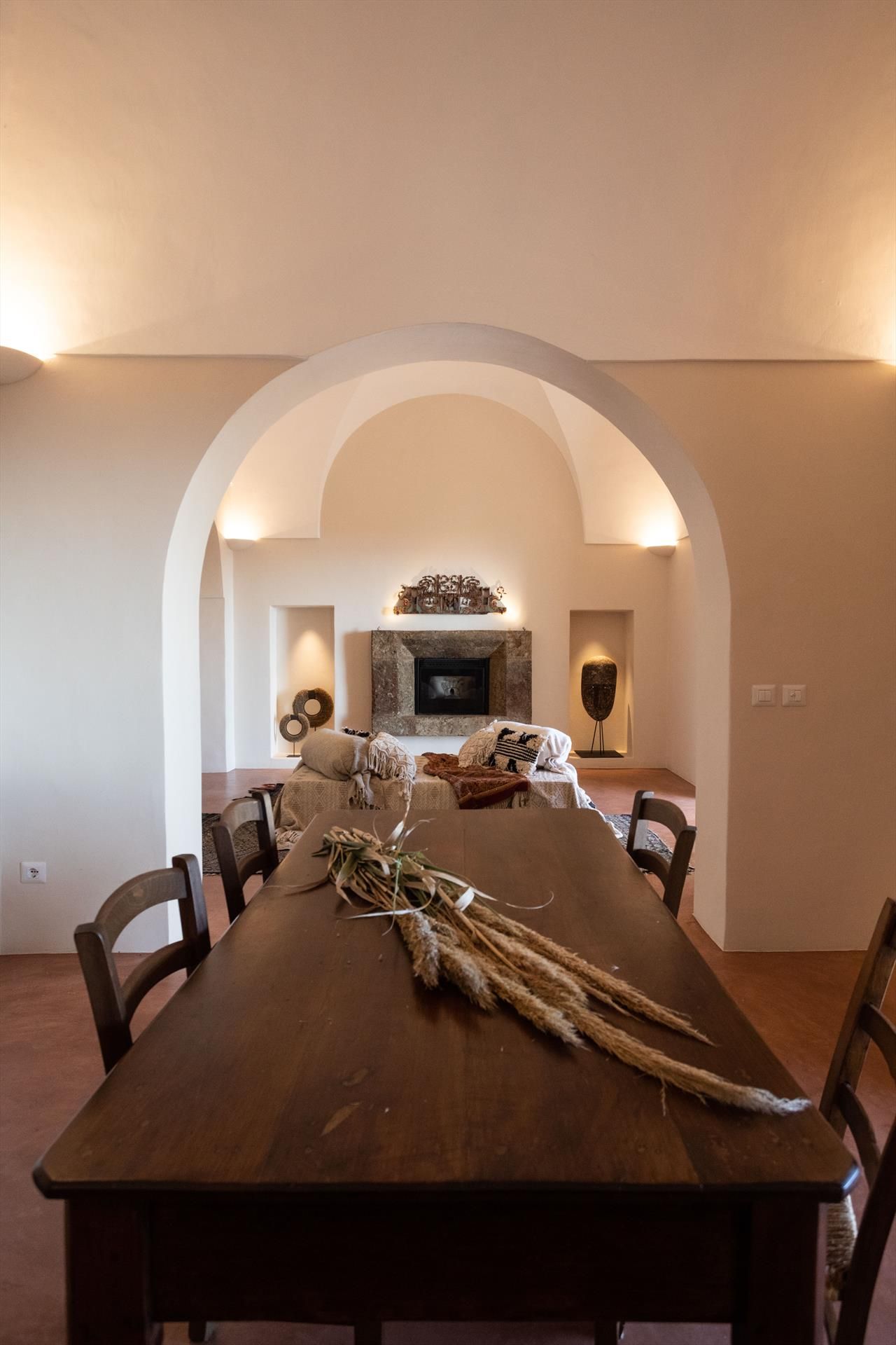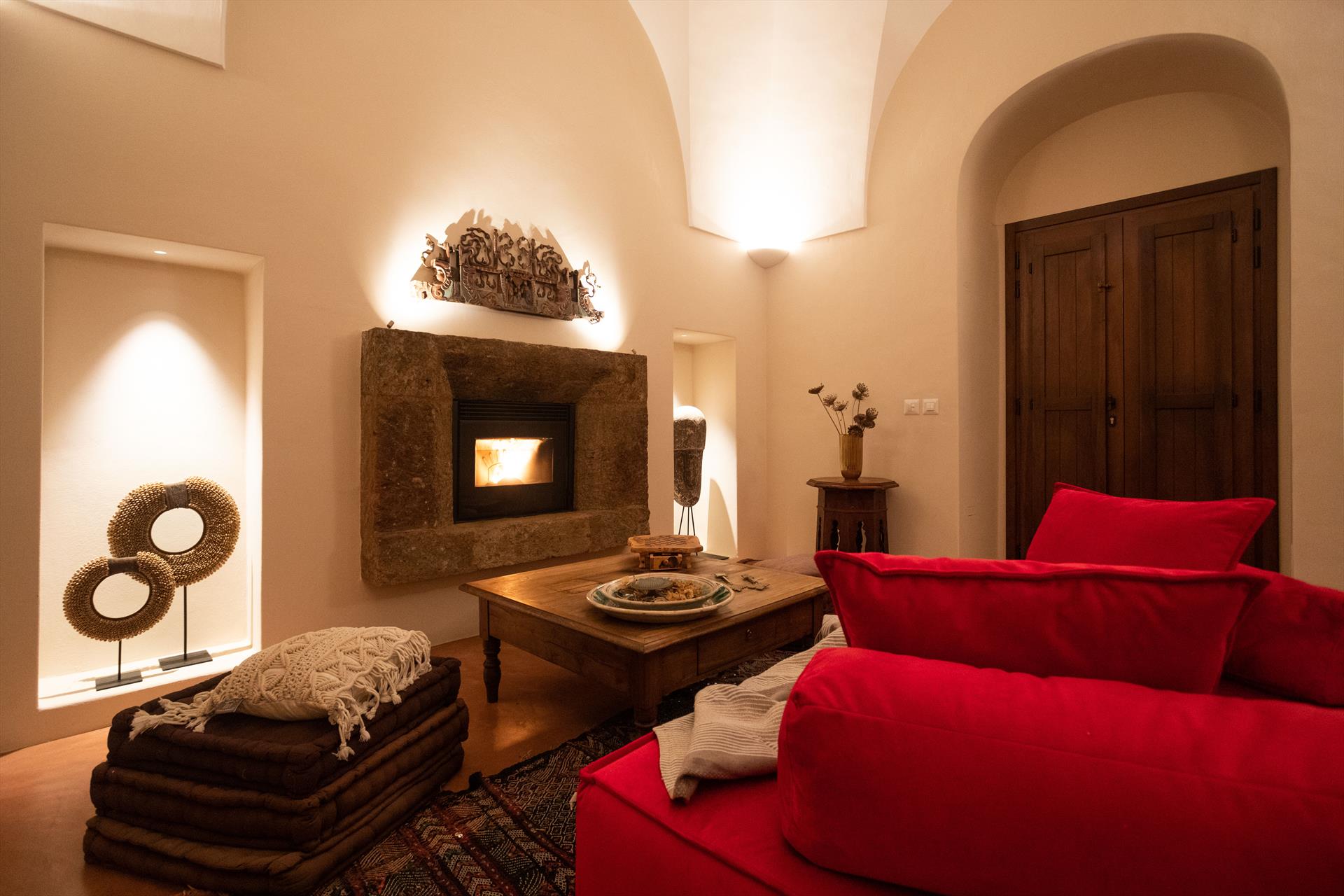 deux chambres doubles avec salle de bain privée (douche), cuisine, salle à manger, salon avec cheminée en pierre, terrasse extérieure à usage exclusif (équipée de canapés en maçonnerie et d'une table à manger).