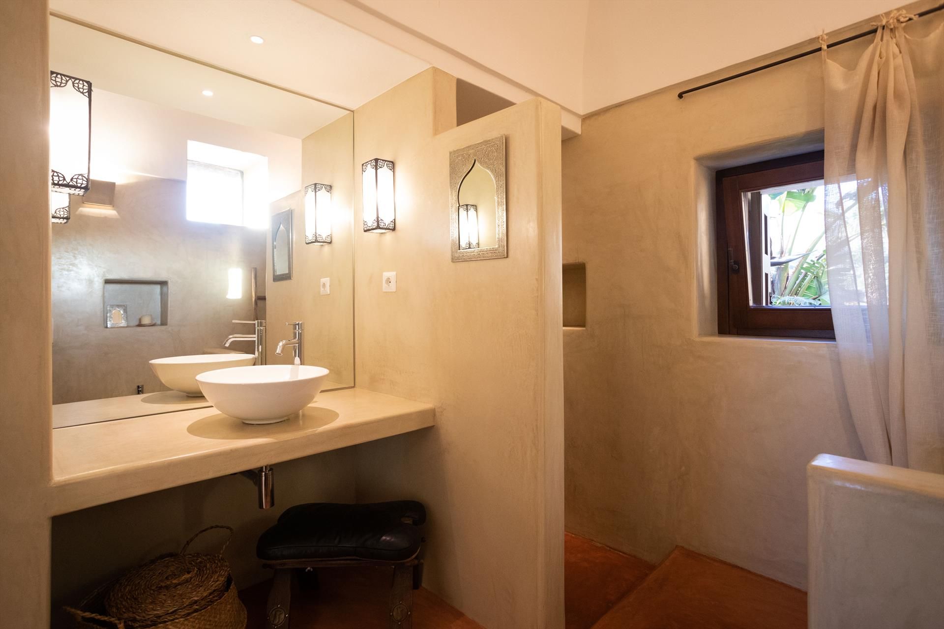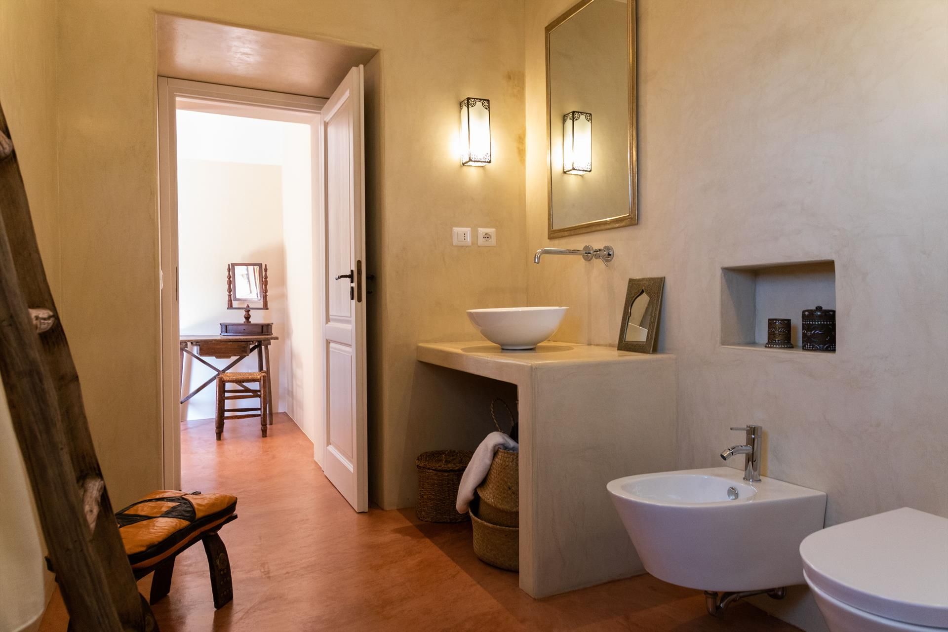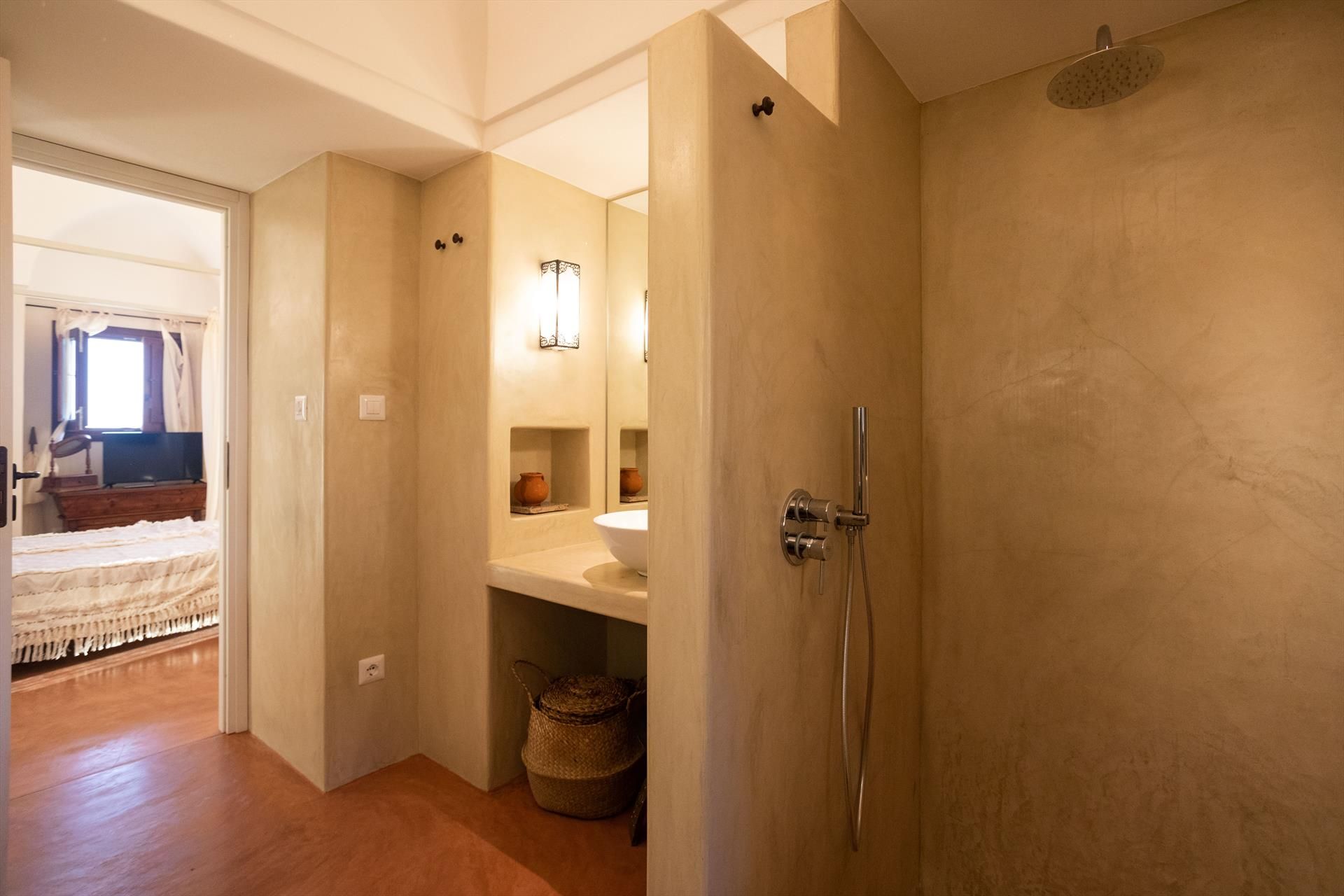 1 chambre double avec salle de bain privée (douche), terrasse extérieure à usage exclusif (équipée de canapés en maçonnerie).