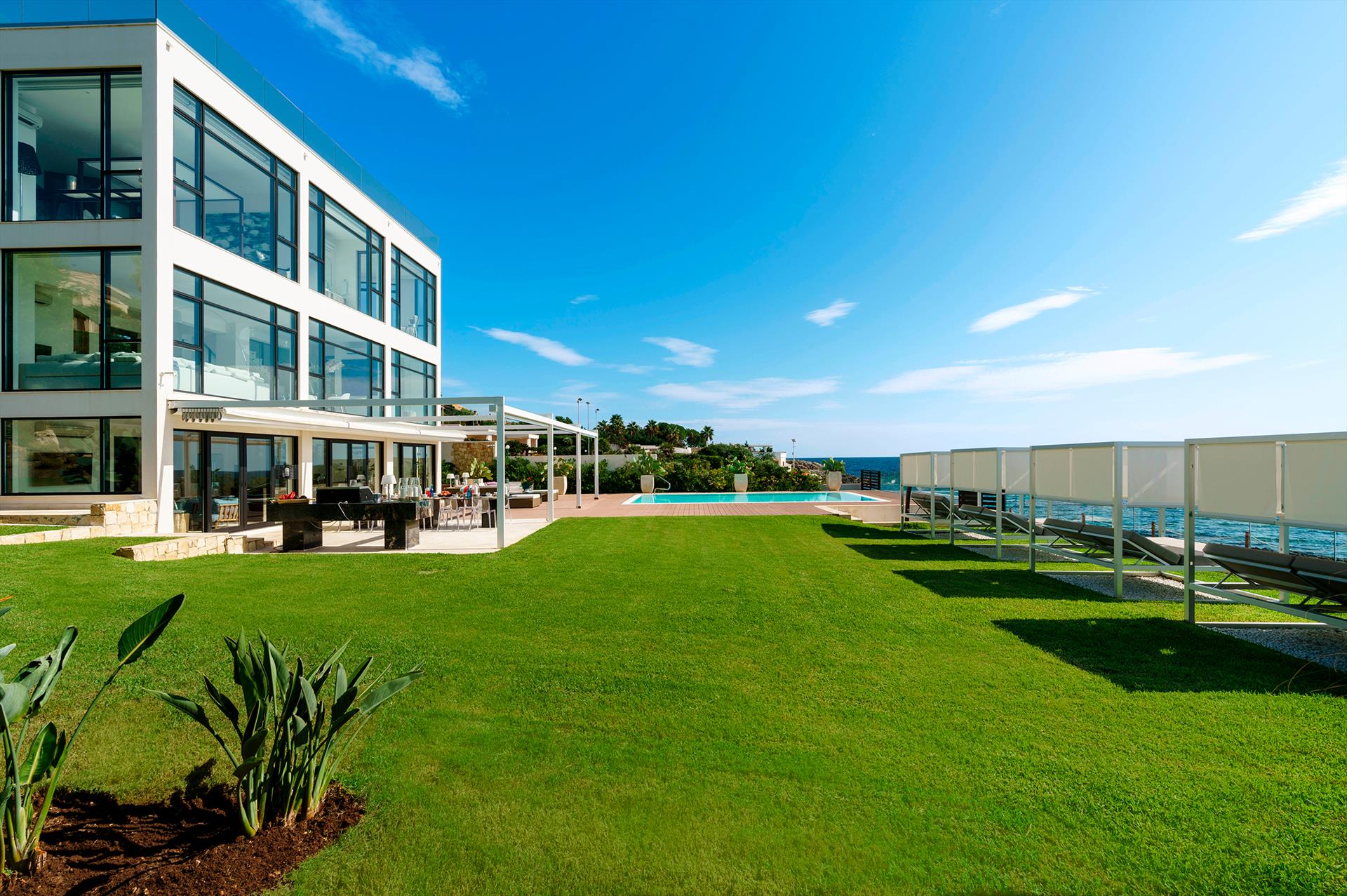 Villa Angelina est une villa luxueuse dotée de piscine privée et dont l’emplacement est magnifique plongée dans le cadre magnifique de la péninsule de la Maddalena, à 10 kilomètres au sud de la ville de Syracuse. L’emplacement extraordinaire face à la mer et la vue à couper le souffle forment le cadre de cette demeure prestigieuse dotée d’accès privé à la falaise et à la mer. Majestueuse et élégante, cette villa charmante est entourée d'un jardin bien entretenu et luxuriant avec pelouse, qui abrite une piscine splendide et des terrasses spacieuses et bien équipées, où, grâce à une pergola motorisée, il est agréable de se rafraîchir ou de se retrouver pour des dîners et des petits déjeuners en plein air. Dotées des finitions et meublées avec élégance, ses pièces intérieures accueillantes se développent sur trois niveaux et sur une surface de plus de 300 mètres carrés. Au rez-de-chaussée, s’ouvrent un salon spacieux avec coin repas et coin de conversation, une cuisine super-équipée, une buanderie, un espace fitness et une salle de bain dotée de générateur de vapeur. Le premier étage comprend deux chambres à coucher avec salles de bain privées et un salon lumineux avec de grandes baies vitrées donnant sur la terrasse, offrant aux clients un contact unique et exclusif avec la mer. Alors qu’au deuxième étage, se trouvent deux autres chambres à coucher, dont la chambre à coucher principale avec dressing et salle de bain avec douche et baignoire. La résidence dispose également de tout le confort moderne, tel que la climatisation et le chauffage (dans toutes les pièces), la poste de travail informatique avec connexion Wi-Fi, le TV satellite, le lave-linge, le sèche-linge, le lave-vaisselle, le système audio Sonos, le barbecue et le coffre-fort. Idéale pour passer des vacances de détente à la mer, plongés dans les grands espaces, le luxe et le confort, Villa Angelina vous permet d’atteindre aussi Syracuse et son centre-ville historique charmant en quelques minutes de voiture. A proximité, se trouvent également les villes d’art baroque de Noto, Modica, Scicli et Ragusa Ibla, les réserves naturelles de Cavagrande del Cassibile et Vendicari, les villages typiques de Marzamemi et de Portopalo di Capo Passero, le volcan du Etna et la ville de Taormine.