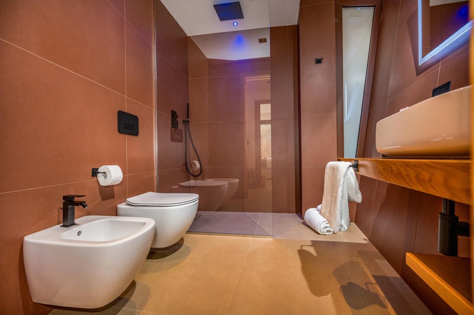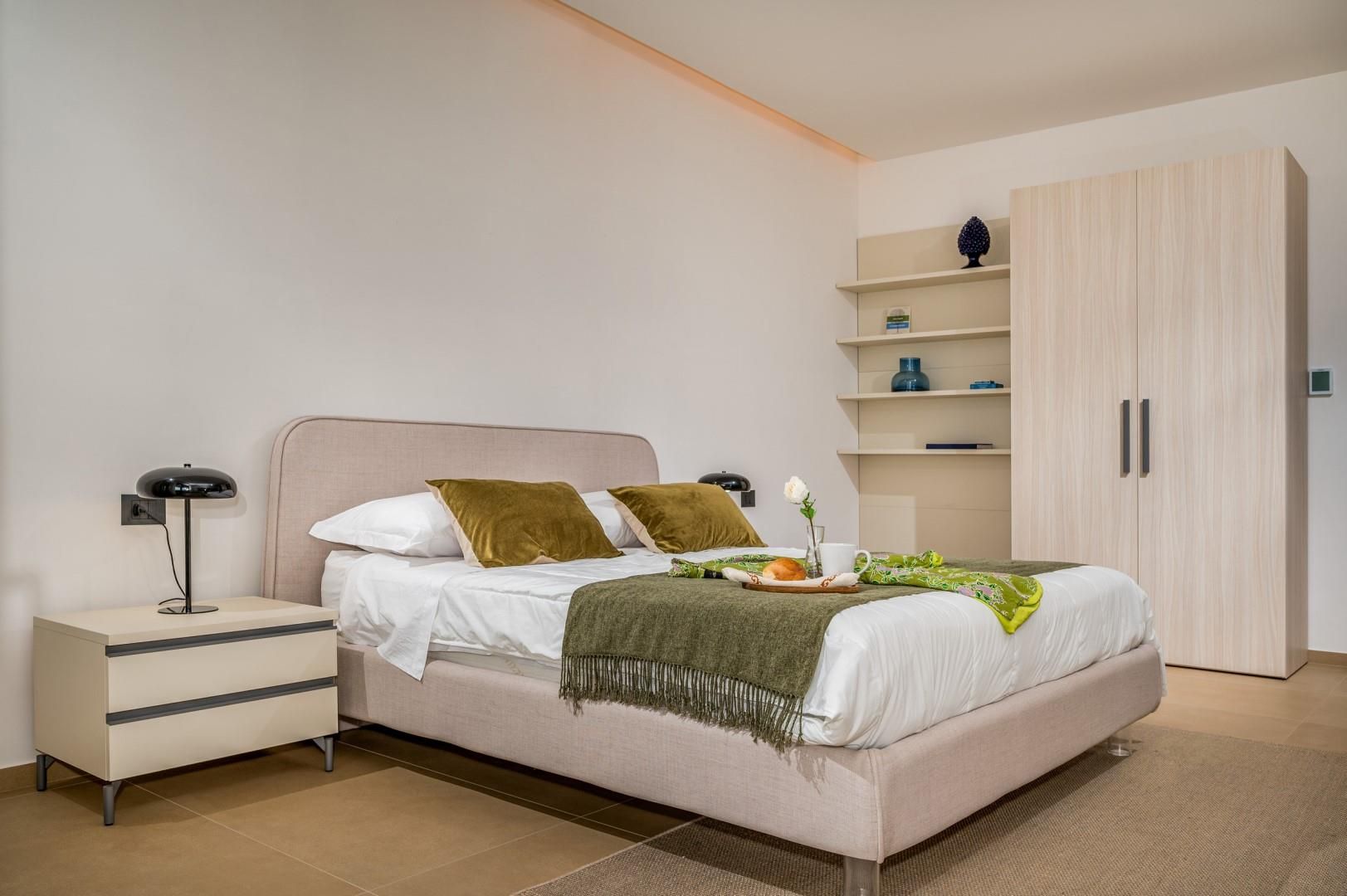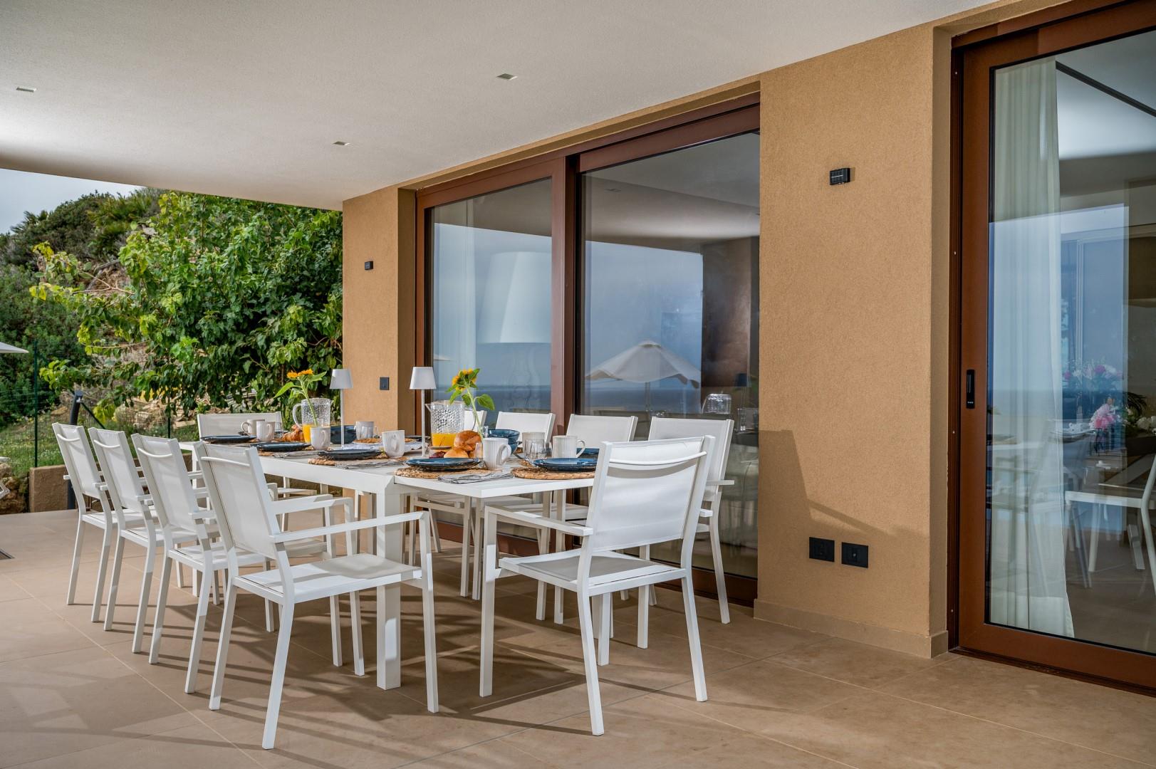 L'entrée principale est située sur le côté de la villa et s'ouvre sur un couloir accueillant où a été créé un petit coin salon avec deux fauteuils originaux, point de jonction entre l'espace de vie, séparé par une porte coulissante en verre, et l'escalier en fer menant à l'étage supérieur. L'espace ouvert et aéré abrite un coin salon confortable avec des canapés modulaires et un écran plat. Entre la cuisine moderne avec îlot et le salon se trouve la salle à manger, avec une table pouvant accueillir jusqu'à 10 personnes. La luminosité de la pièce est garantie par la porte-fenêtre pleine paroi qui donne accès à la véranda. La cuisine mène à l'espace nuit au rez-de-chaussée, où se trouvent les deux premières chambres doubles, chacune dotée d'un dressing et d'une salle de bains privée avec douche. Les deux chambres ont un accès direct à l'extérieur. Dans le coin nuit se trouve également une petite buanderie bien organisée. En revenant au couloir d'entrée, l'escalier en fer design mène à l'étage supérieur, où se trouvent trois autres chambres doubles, chacune avec sa propre salle de bains privative avec douche. Chaque chambre dispose d'une partie privée d'une terrasse meublée avec vue sur la mer, et est équipée d'un bureau ; l'une des chambres dispose également d'un coin salon avec un canapé. Un escalier extérieur mène du palier de l'étage au jardin arrière. N.B. La villa comporte quelques marches sans main courante, il convient donc d'être prudent.