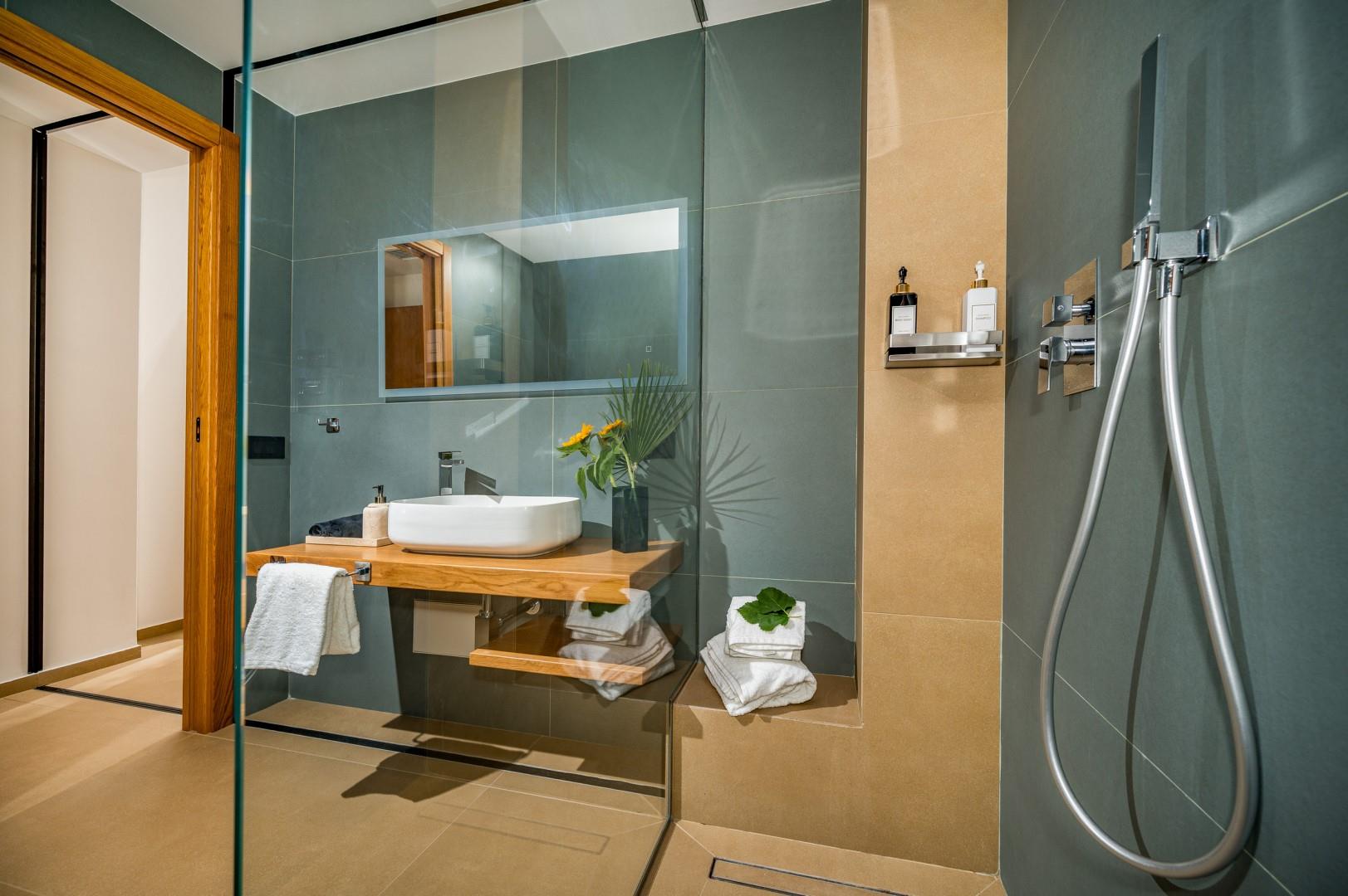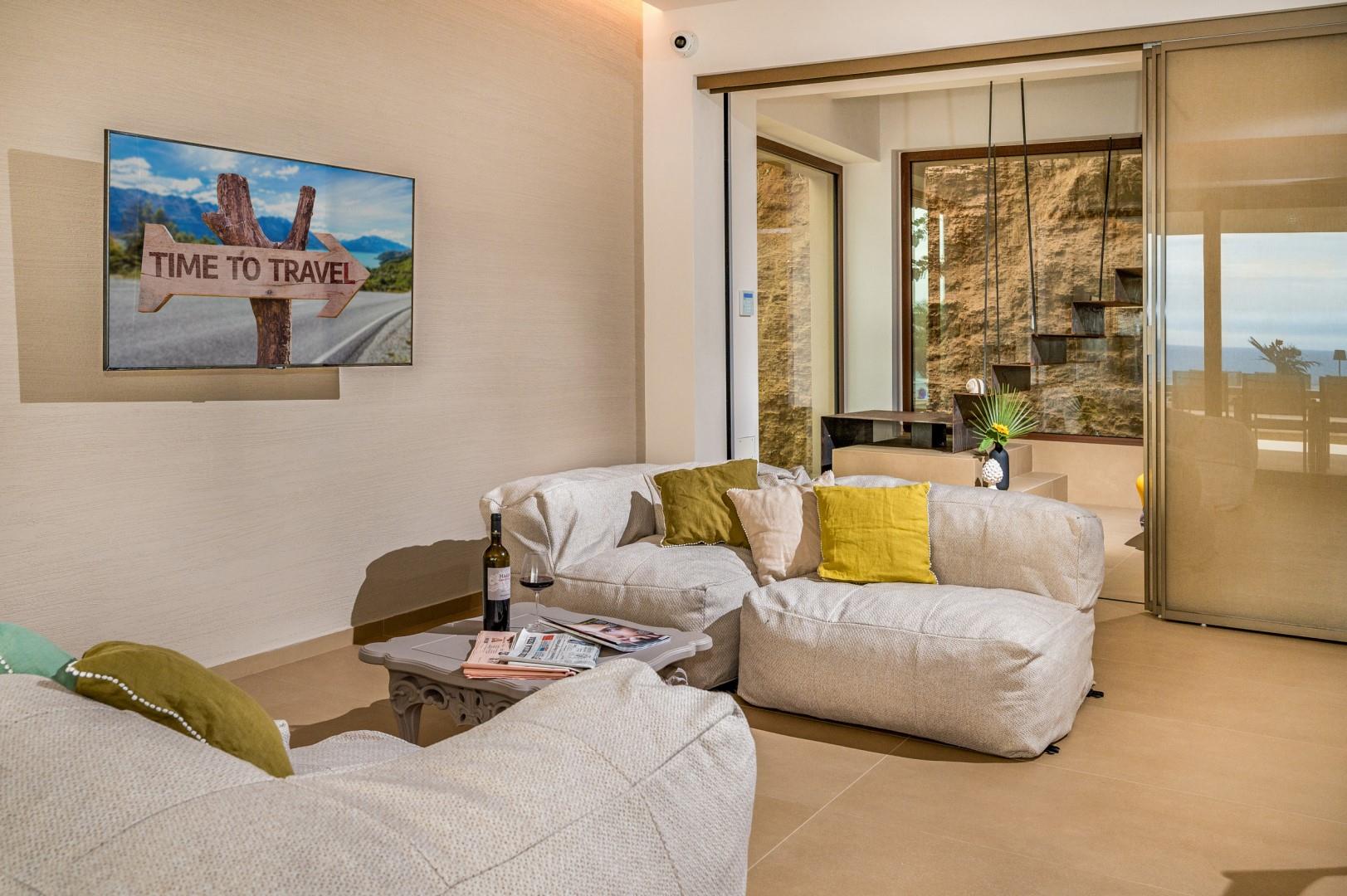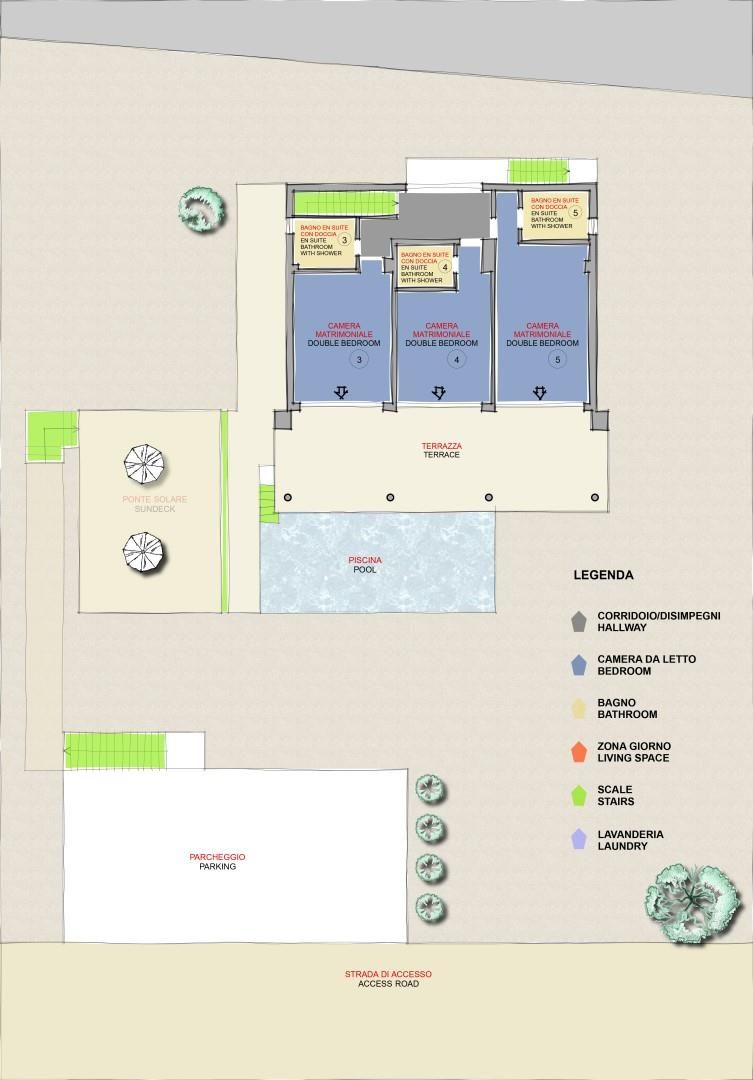 L'entrée principale est située sur le côté de la villa et s'ouvre sur un couloir accueillant où a été créé un petit coin salon avec deux fauteuils originaux, point de jonction entre l'espace de vie, séparé par une porte coulissante en verre, et l'escalier en fer menant à l'étage supérieur. L'espace ouvert et aéré abrite un coin salon confortable avec des canapés modulaires et un écran plat. Entre la cuisine moderne avec îlot et le salon se trouve la salle à manger, avec une table pouvant accueillir jusqu'à 10 personnes. La luminosité de la pièce est garantie par la porte-fenêtre pleine paroi qui donne accès à la véranda. La cuisine mène à l'espace nuit au rez-de-chaussée, où se trouvent les deux premières chambres doubles, chacune dotée d'un dressing et d'une salle de bains privée avec douche. Les deux chambres ont un accès direct à l'extérieur. Dans le coin nuit se trouve également une petite buanderie bien organisée. En revenant au couloir d'entrée, l'escalier en fer design mène à l'étage supérieur, où se trouvent trois autres chambres doubles, chacune avec sa propre salle de bains privative avec douche. Chaque chambre dispose d'une partie privée d'une terrasse meublée avec vue sur la mer, et est équipée d'un bureau ; l'une des chambres dispose également d'un coin salon avec un canapé. Un escalier extérieur mène du palier de l'étage au jardin arrière. N.B. La villa comporte quelques marches sans main courante, il convient donc d'être prudent.