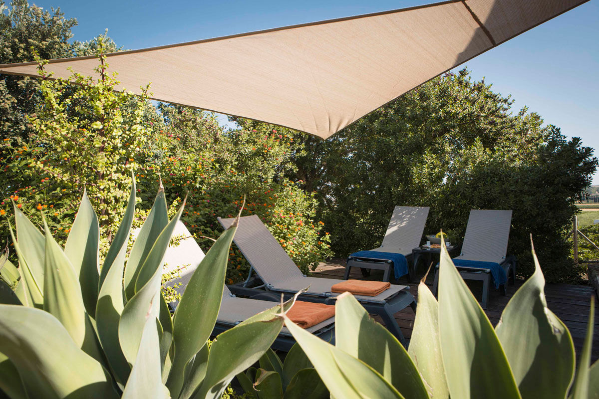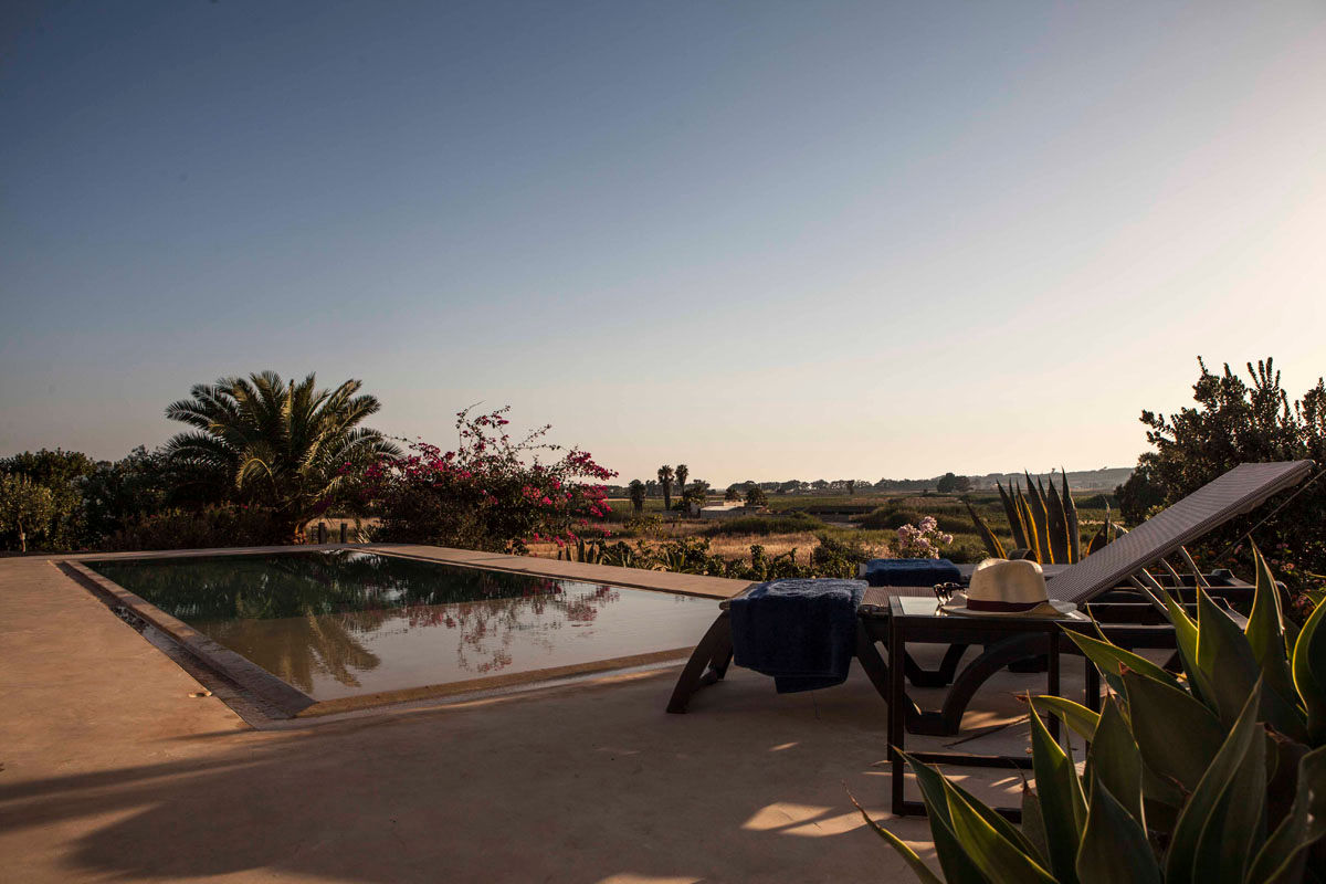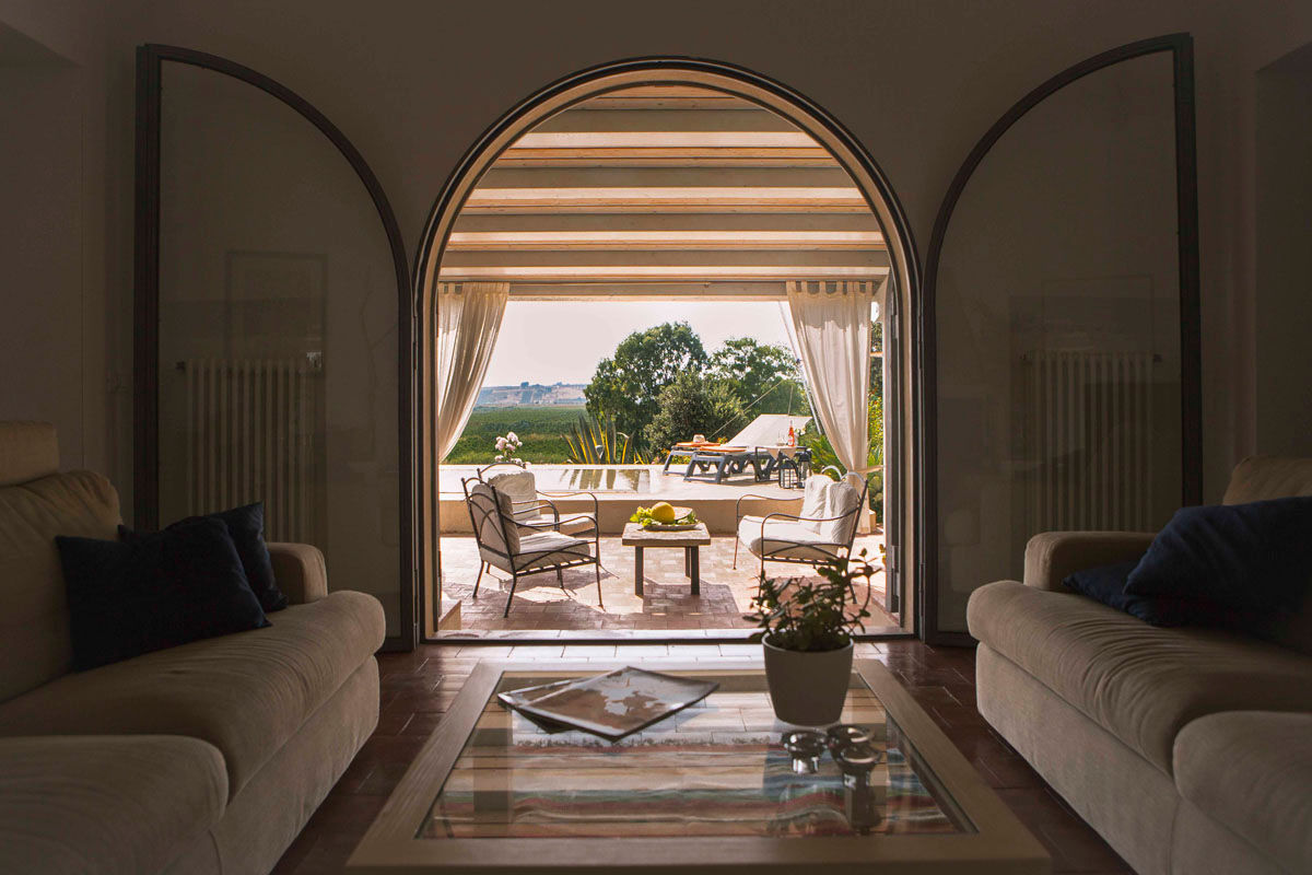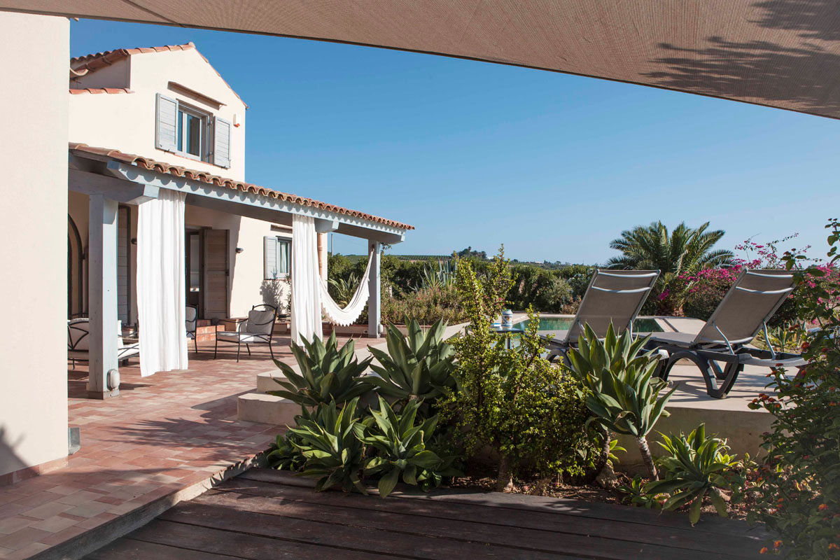 Extérieur (600 m²) : Espace piscine et solarium, terrasse avant ombragée, patio couvert avec table à manger et espace barbecue et un jardin méditerranéen typique. Les vues de la villa s'étendent sur les vignobles environnants et les paysages en pente de la campagne de Menfi et de Sélinonte.
