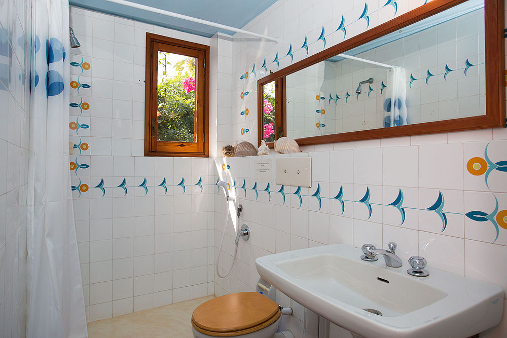 La maison principale de la Villa Calipso s'étend sur deux niveaux. Au rez-de-chaussée (qui se trouve cinq marches au-dessus du niveau de la terrasse et du jardin), vous trouverez la cuisine et la salle à manger bien équipées, une véranda/salon, une chambre double (un lit pliant peut être ajouté sur demande), une chambre à deux lits, une salle de bains avec douche et une buanderie.