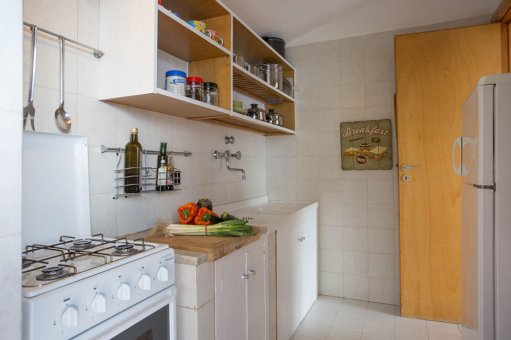 - cuisine avec cuisinière à gaz, four électrique, réfrigérateur-congélateur, cafetière électrique et bouilloire