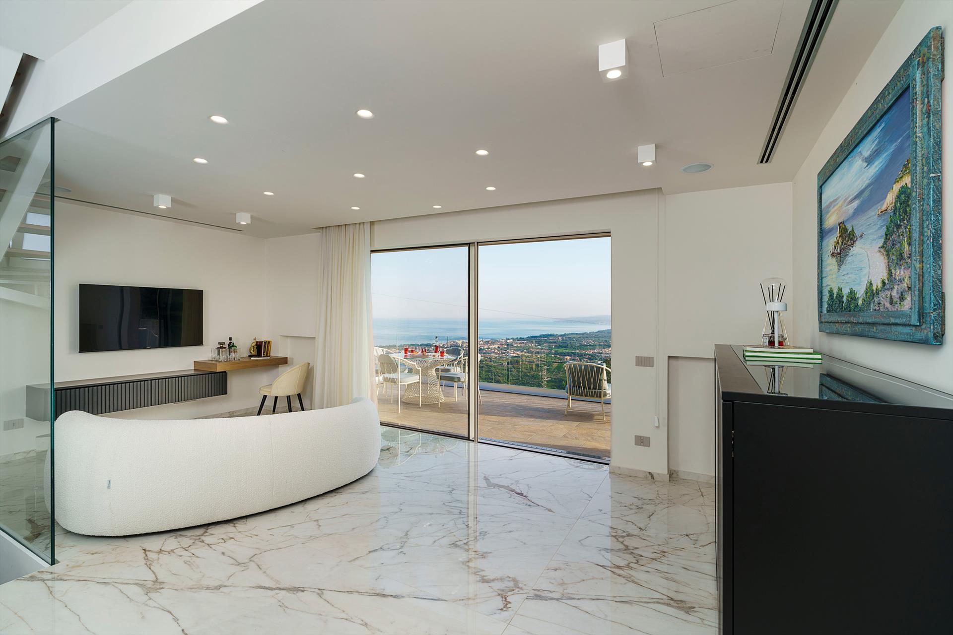 Belvedere est une villa exclusive avec piscine située à quelques kilomètres de Taormine et de Giardini Naxos. Située dans un quartier résidentiel tranquille, la propriété offre une vue enchanteresse sur la mer, qui s'étend de Taormine et Castelmola jusqu'à l'Etna. Ce panorama à couper le souffle peut être admiré depuis les spacieuses terrasses, le jardin et la splendide piscine à eau salée. Récemment construite, cette villa contemporaine a été conçue et construite pour un confort de vie maximal. Aménagés sur deux niveaux, les intérieurs luxueux sont tous climatisés et comprennent six chambres avec salle de bains privative, un salon et un grand espace de vie avec salle à manger et cuisine, une salle de bains de service et une buanderie. La villa est également équipée d'une connexion Wi-Fi, de 8 télévisions intelligentes, d'un haut-parleur sans fil, d'un lave-linge, d'un sèche-linge, d'un lave-vaisselle, d'un coffre-fort et d'une machine à glaçons. Depuis cette charmante villa, le centre historique de Taormine et les plages de Giardini Naxos, Isola Bella et Mazzarò ne sont qu'à quelques minutes en voiture. À proximité, les petits villages du parc de l'Etna, Catane, Syracuse et Ortigia méritent également d'être visités.